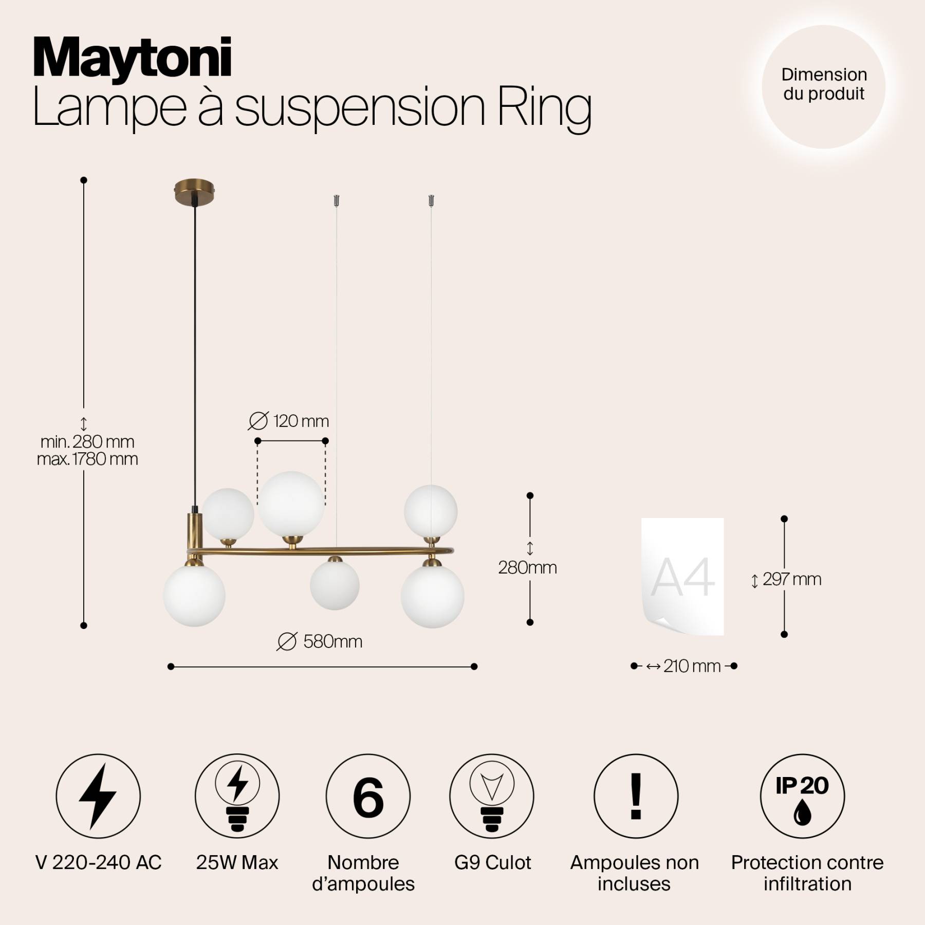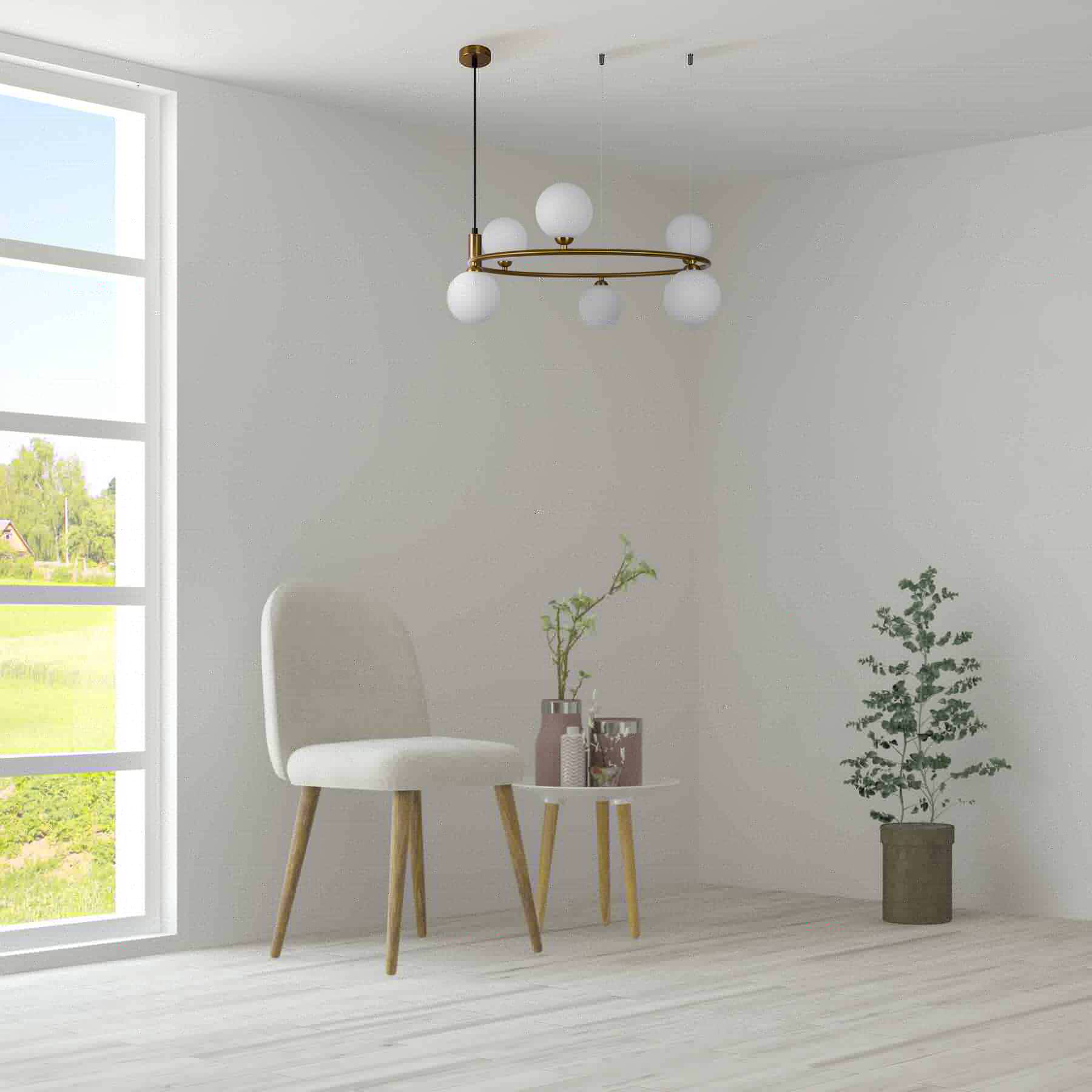 Арматура из металла в трех оттенках: белый, черный, латунь. Плафоны-сферы закреплены на округлом металлическом каркасе. Материал плафонов — выдувное стекло, цвет — белый. Высота подвесных моделей регулируется.
