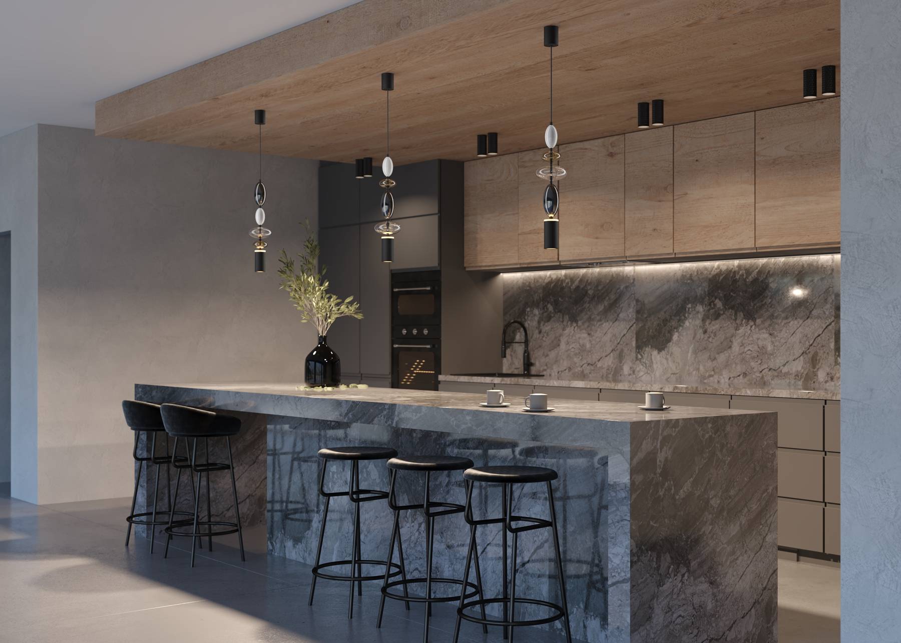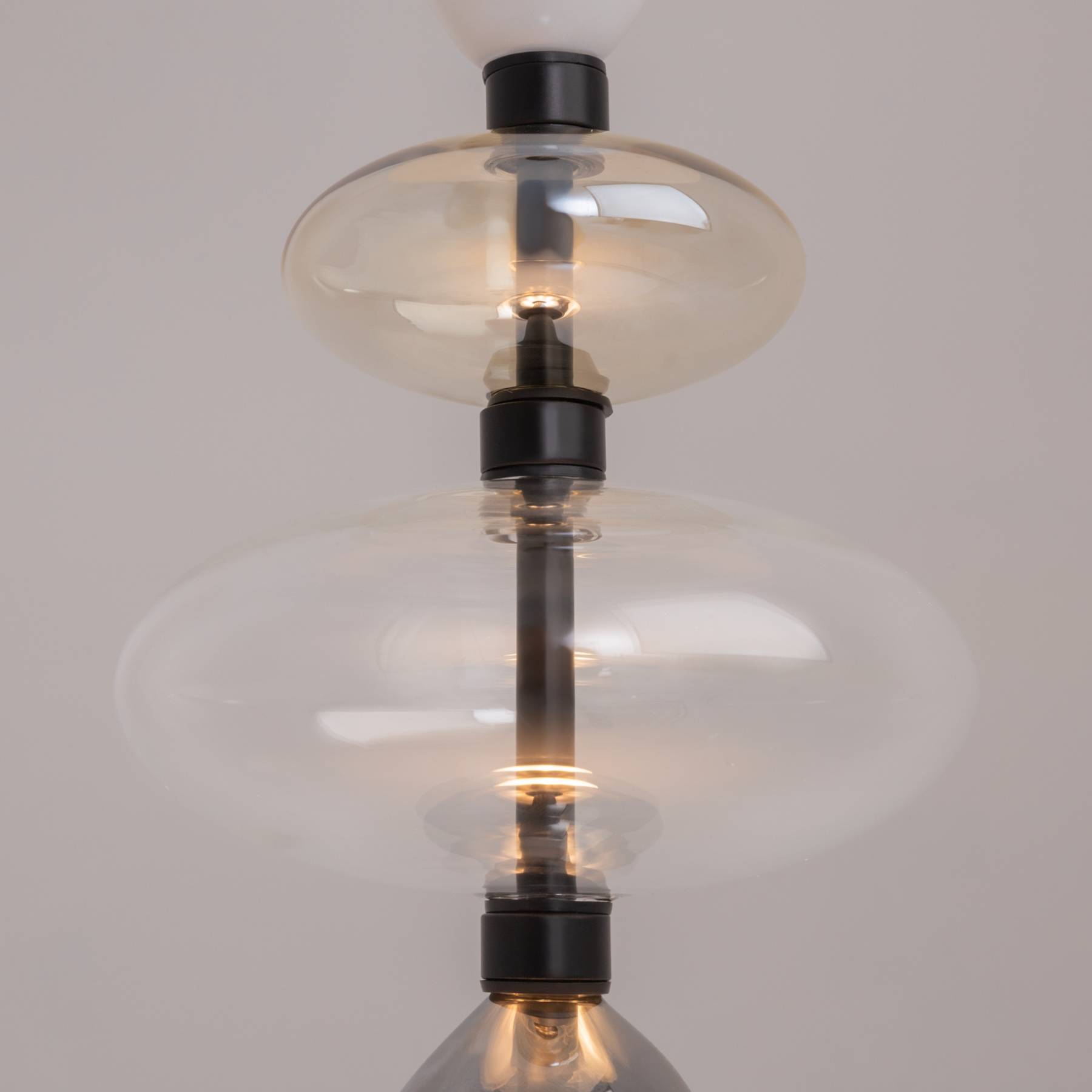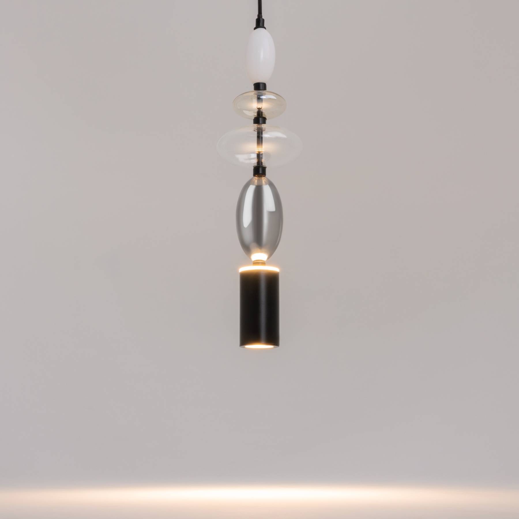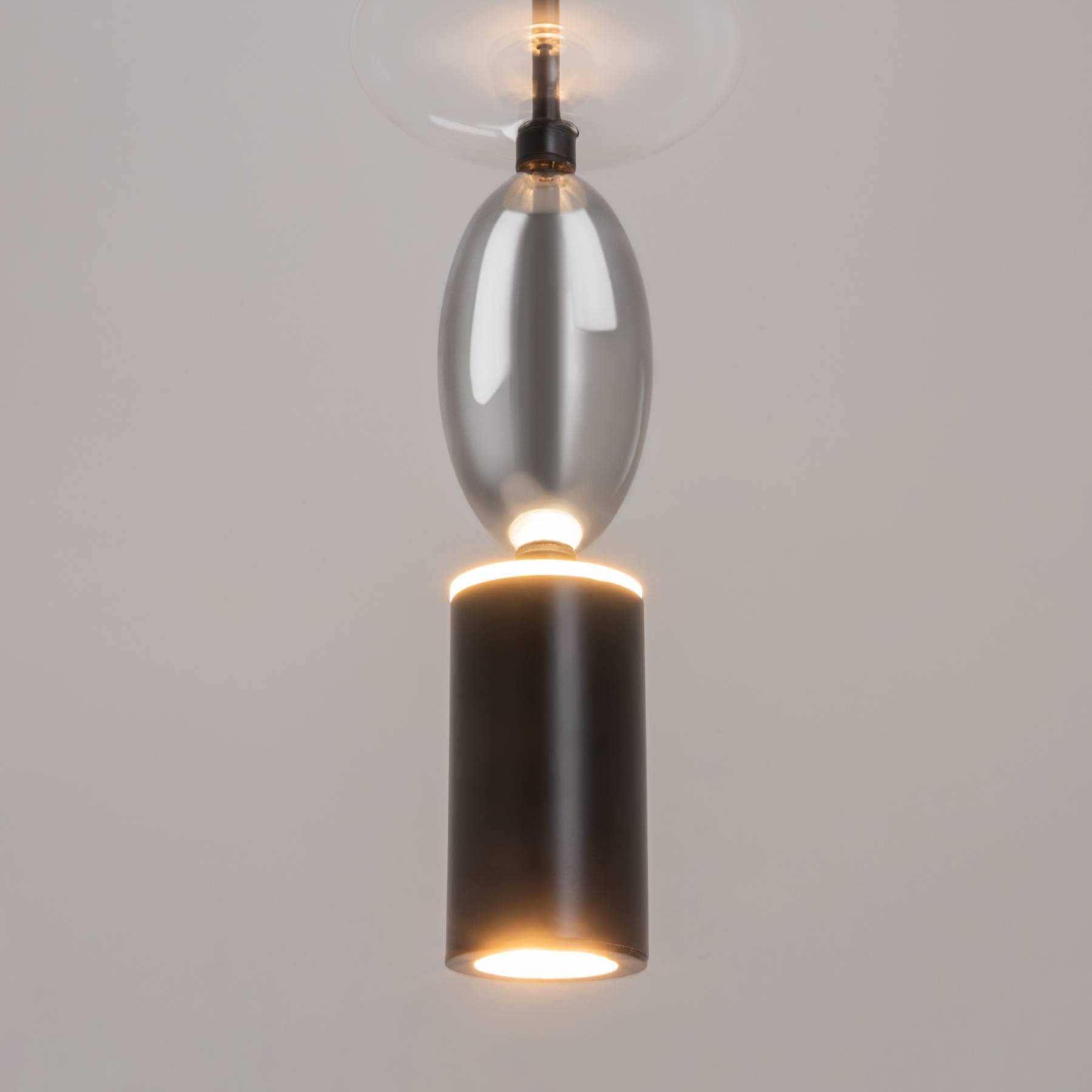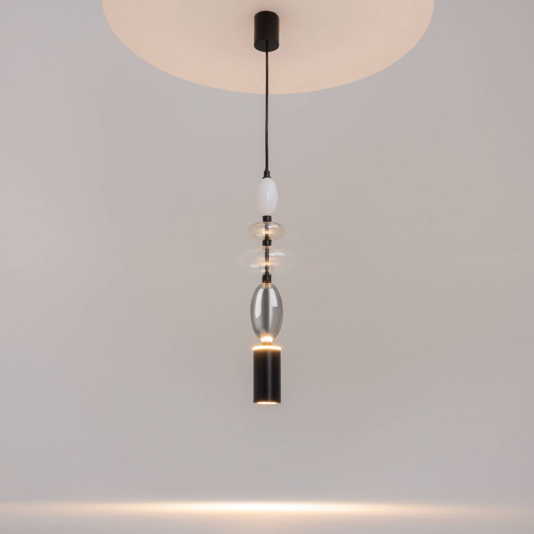 Черная металлическая арматура. Плафоны из стекла коньячного, белого, дымчатого цвета и прозрачный. Источник света комбинированный: нижний - съемная лампа с цоколем GU10, верхний - встроенный LED. Цветовая температура светильников 2700К, угол рассеивания света 120 градусов. Высота регулируется с помощью провода длиной 3 м. Монохромный дизайн, стеклянные элементы впишутся в различные стили интерьеров.
