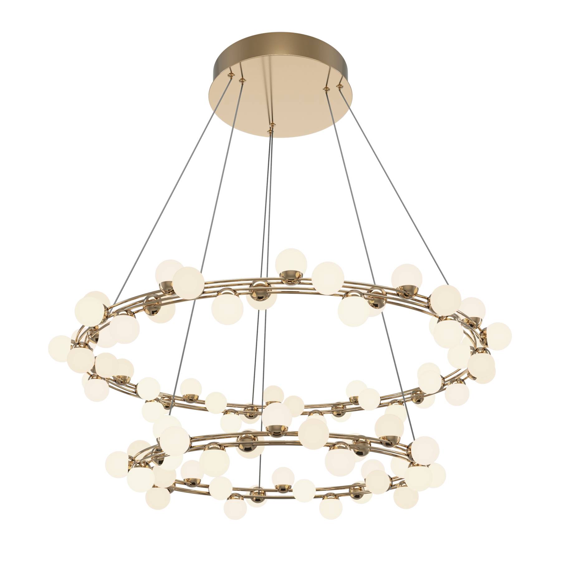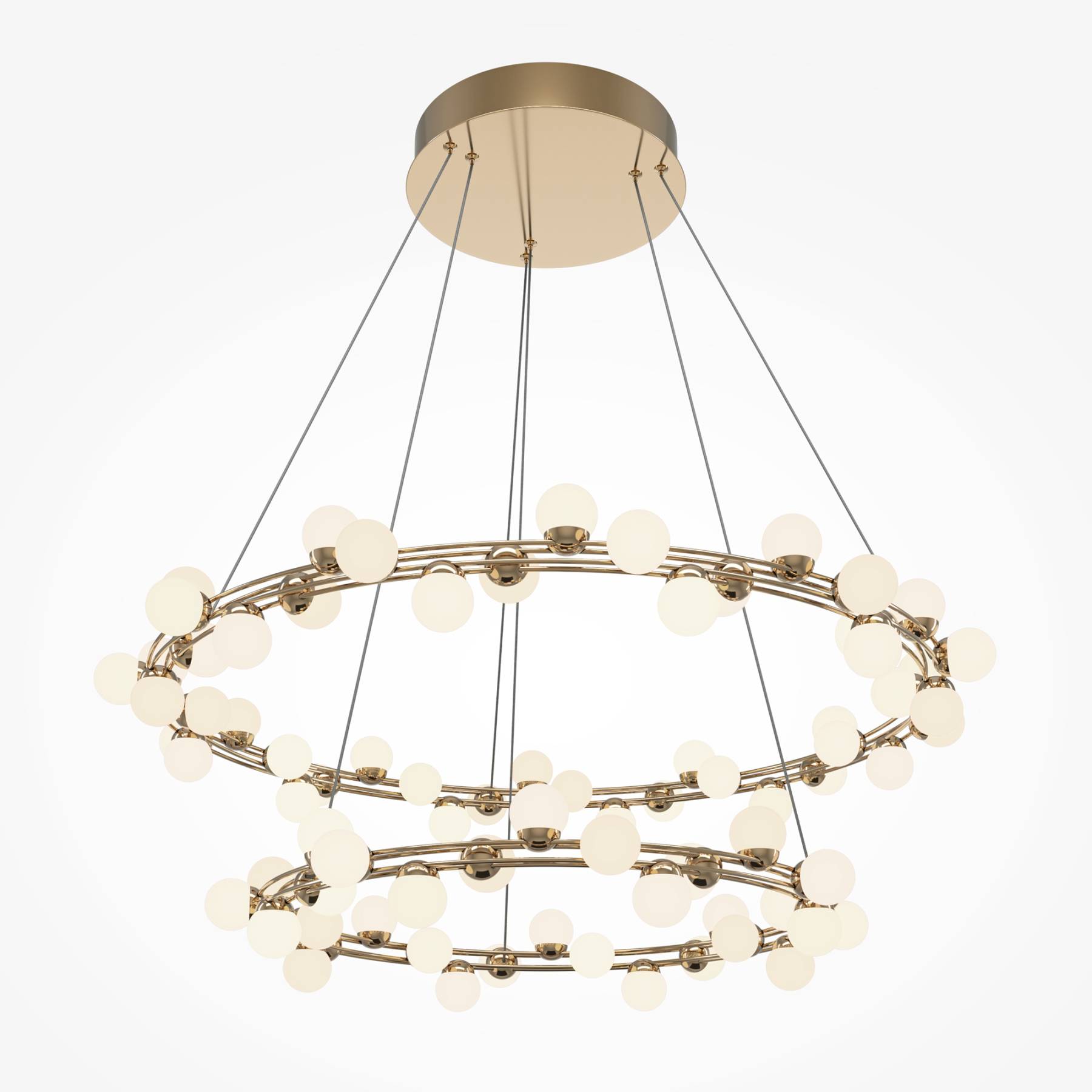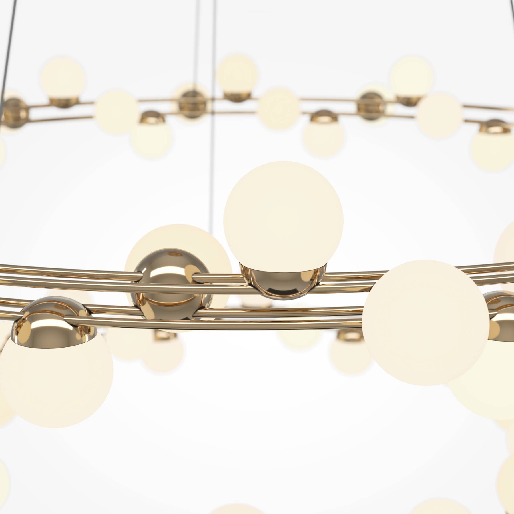 Арматура из металла в золотом цвете. Плафоны-сферы — белый пластик. Дизайн с имитацией молекулярной структуры. LED-источники света.