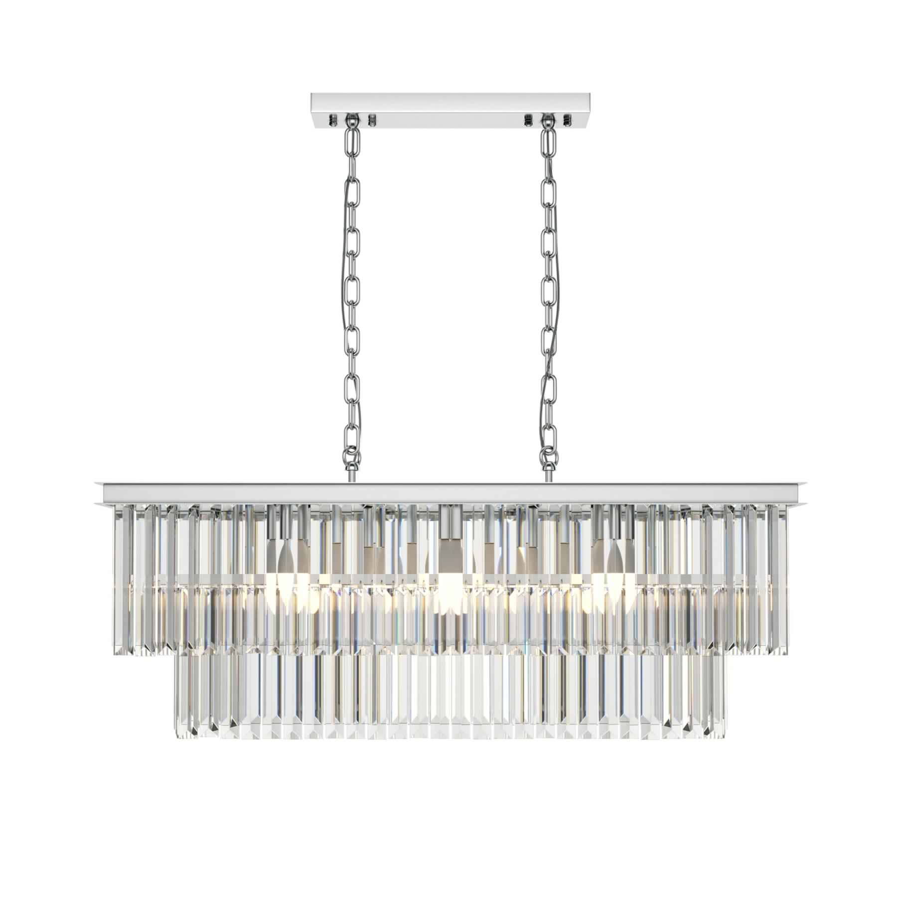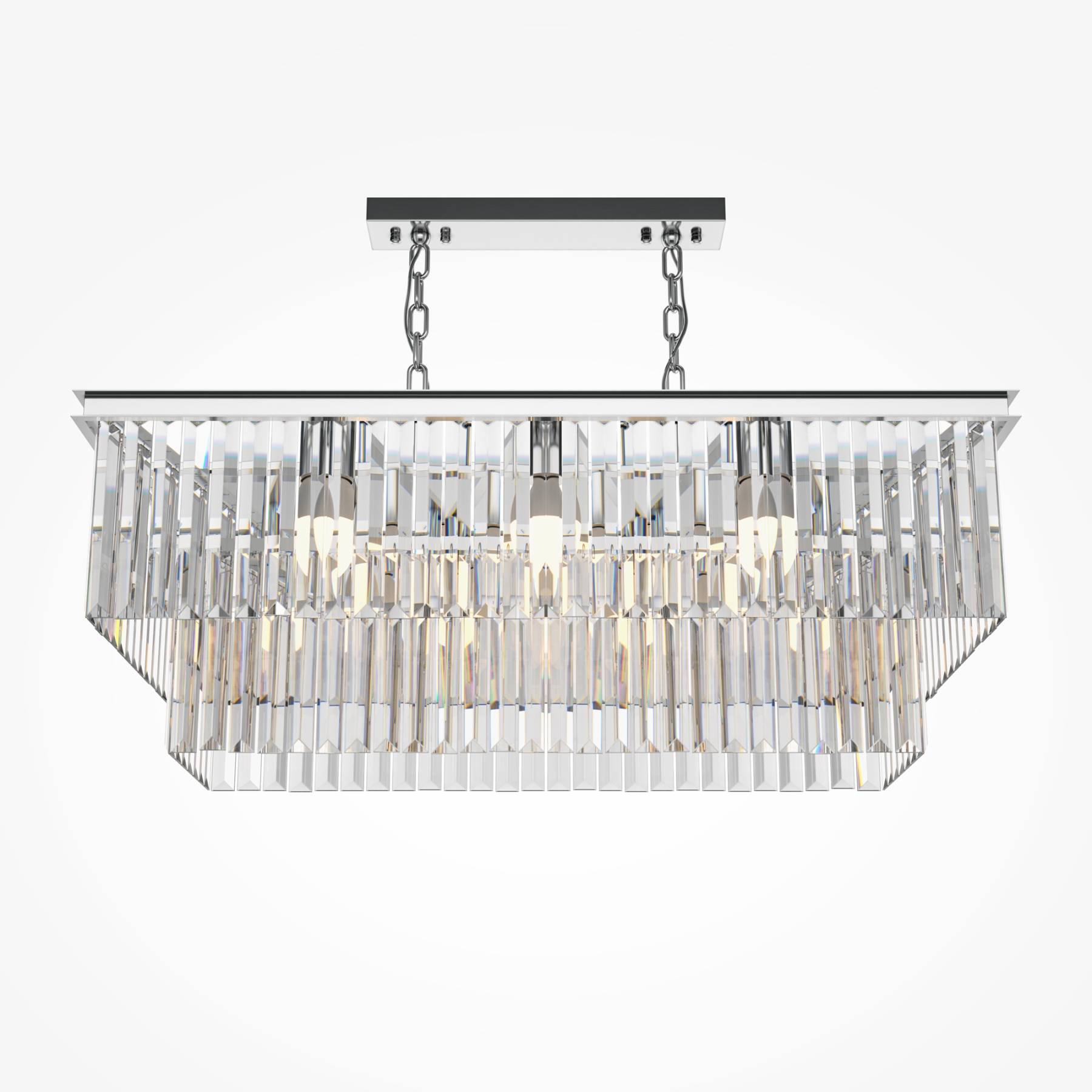 Арматура из металла в трех оттенках: латунь, хром, золото. Многоярусный декор. Подвески: прозрачное (арматура – хром, латунь) и янтарное (арматура – золото) стекло. Высота подвесных моделей регулируется.