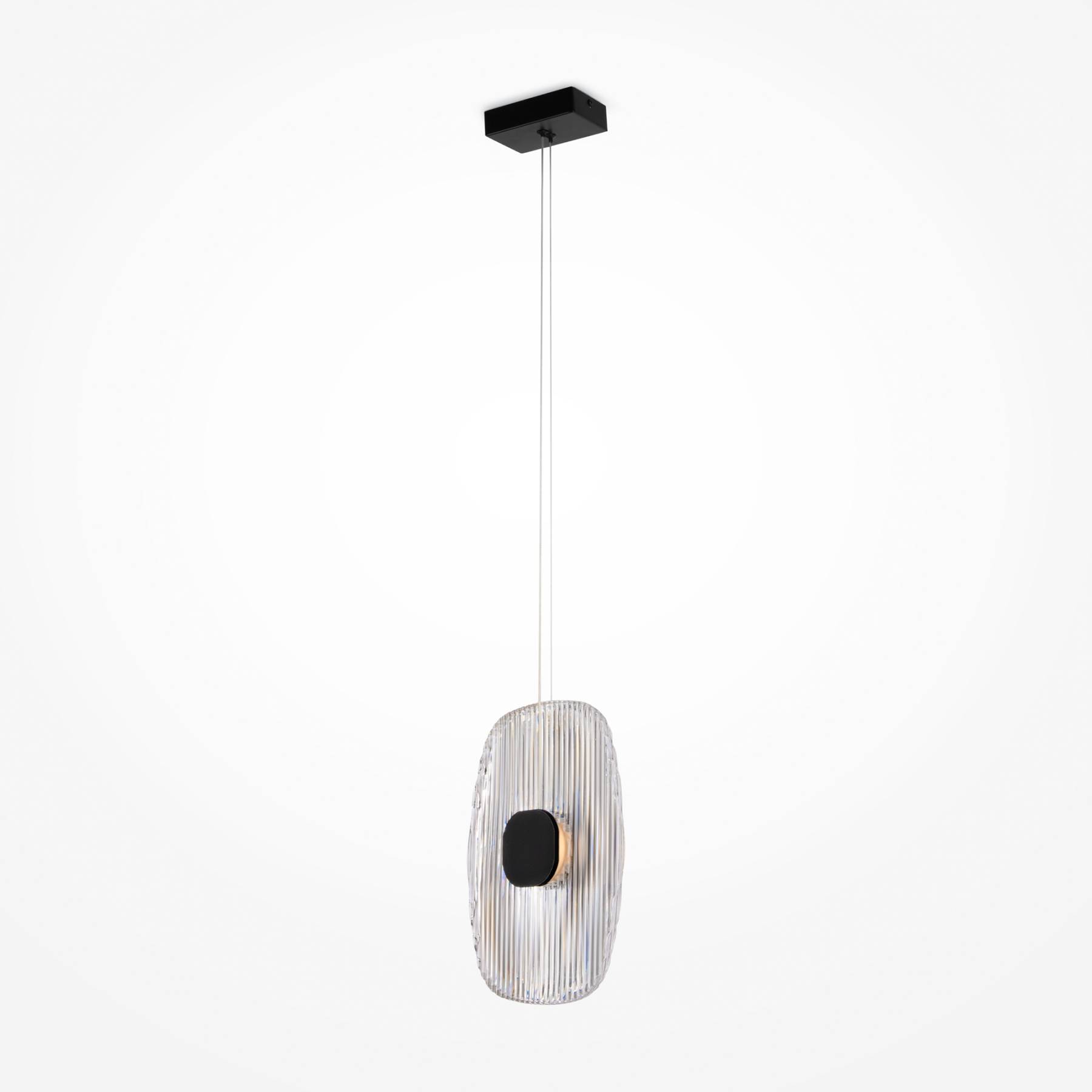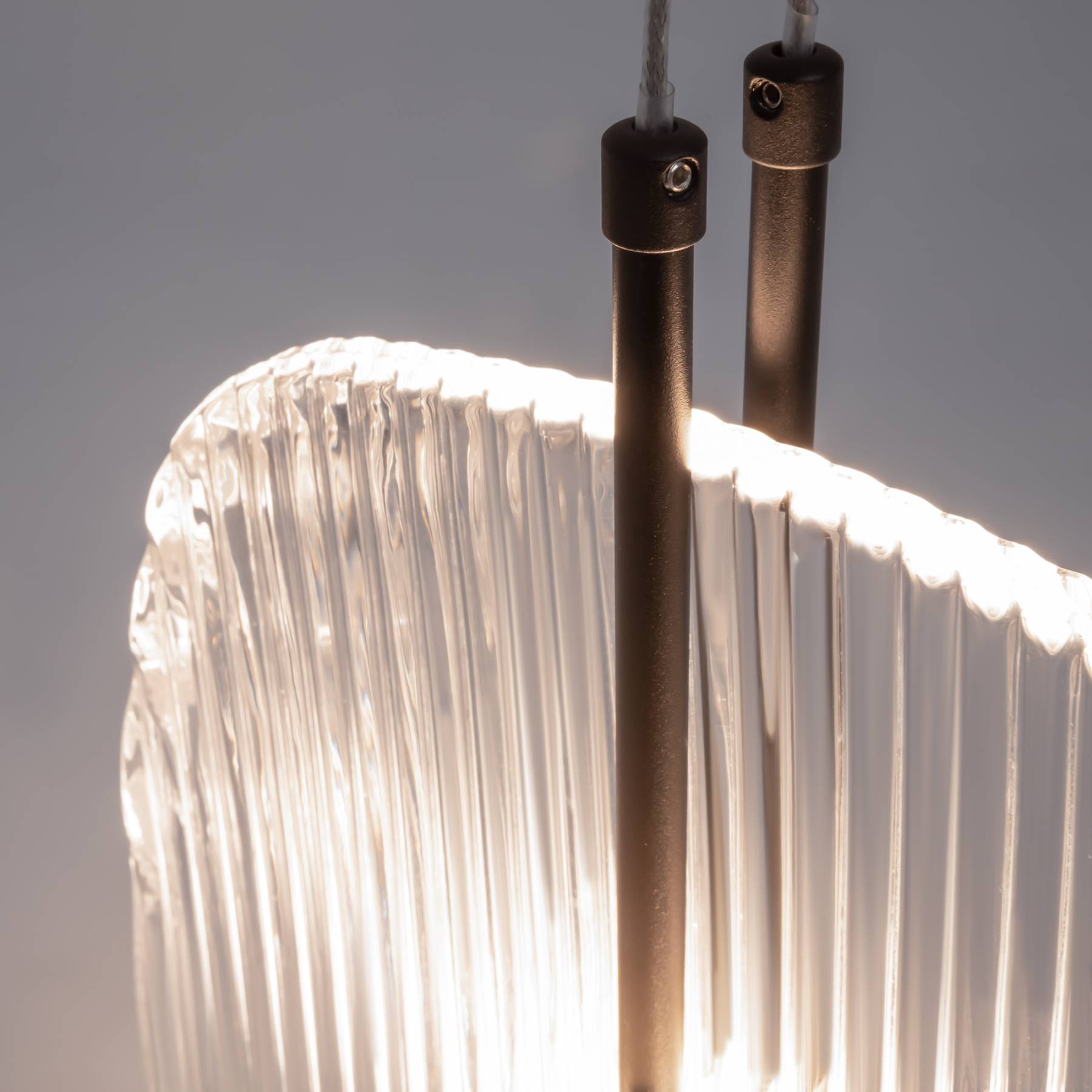 Металлическая арматура. Цвет – матовый черный. Декор – литое стекло. Фактурный орнамент. Высота подвесного светильника регулируется. LED-источник света.