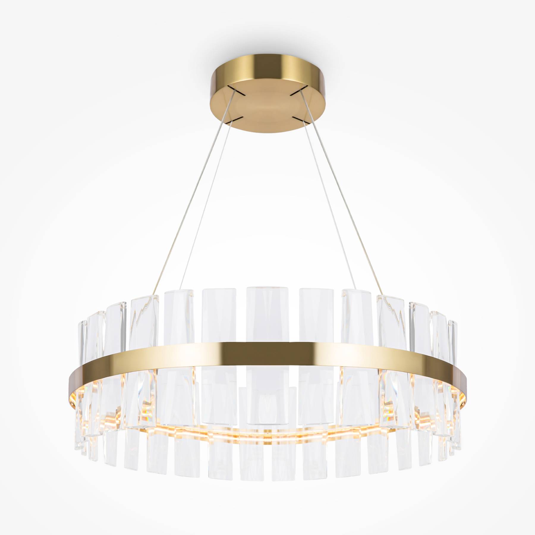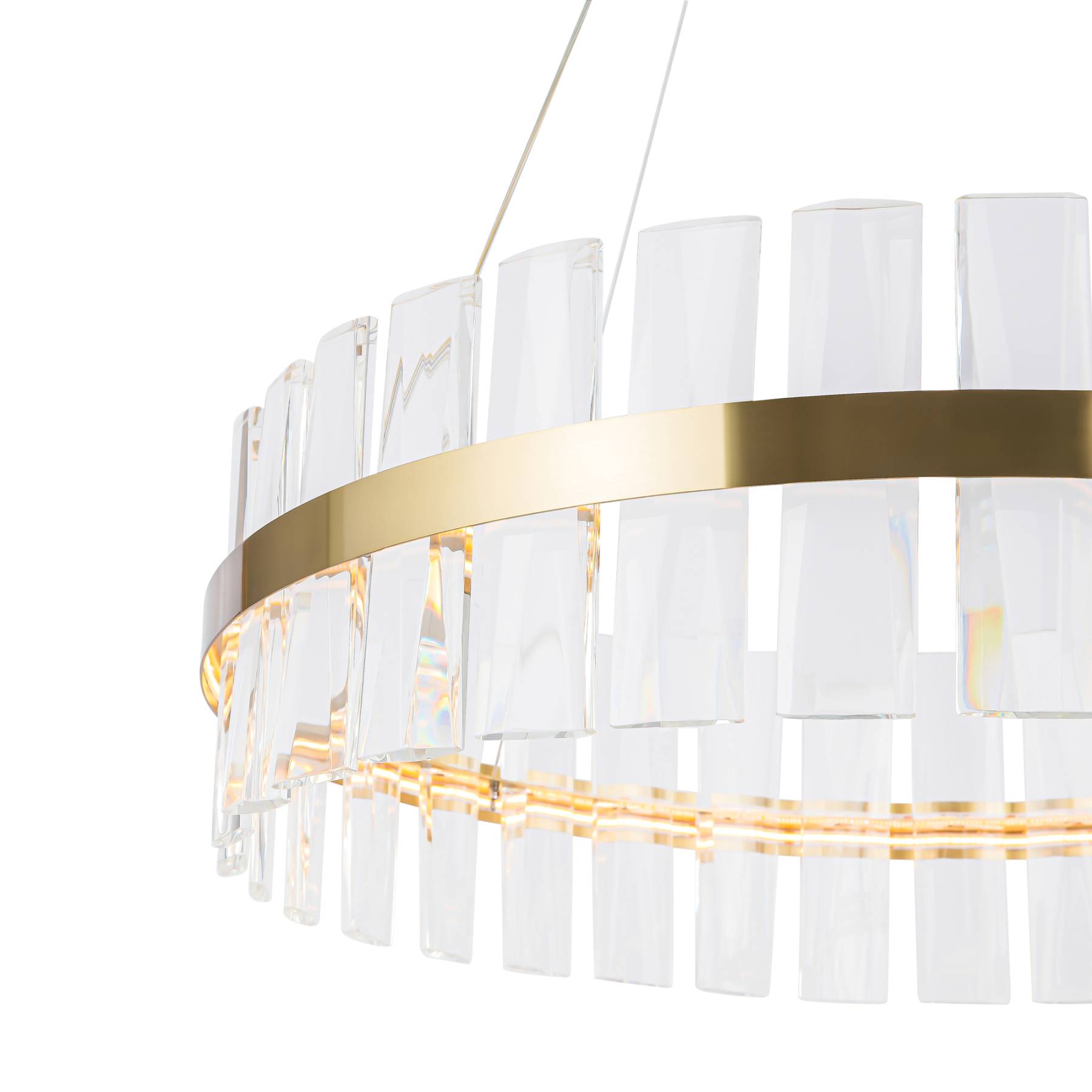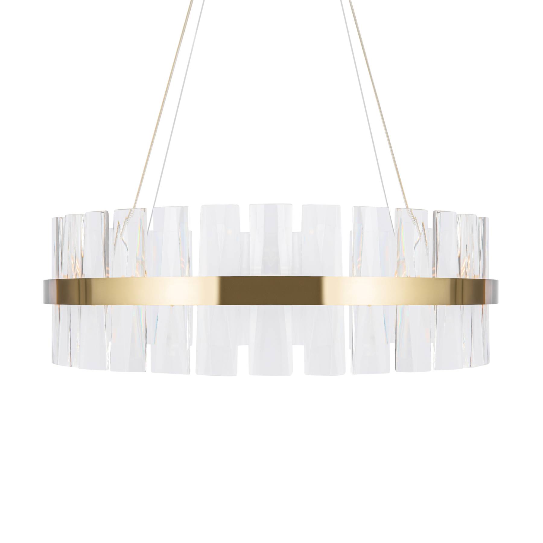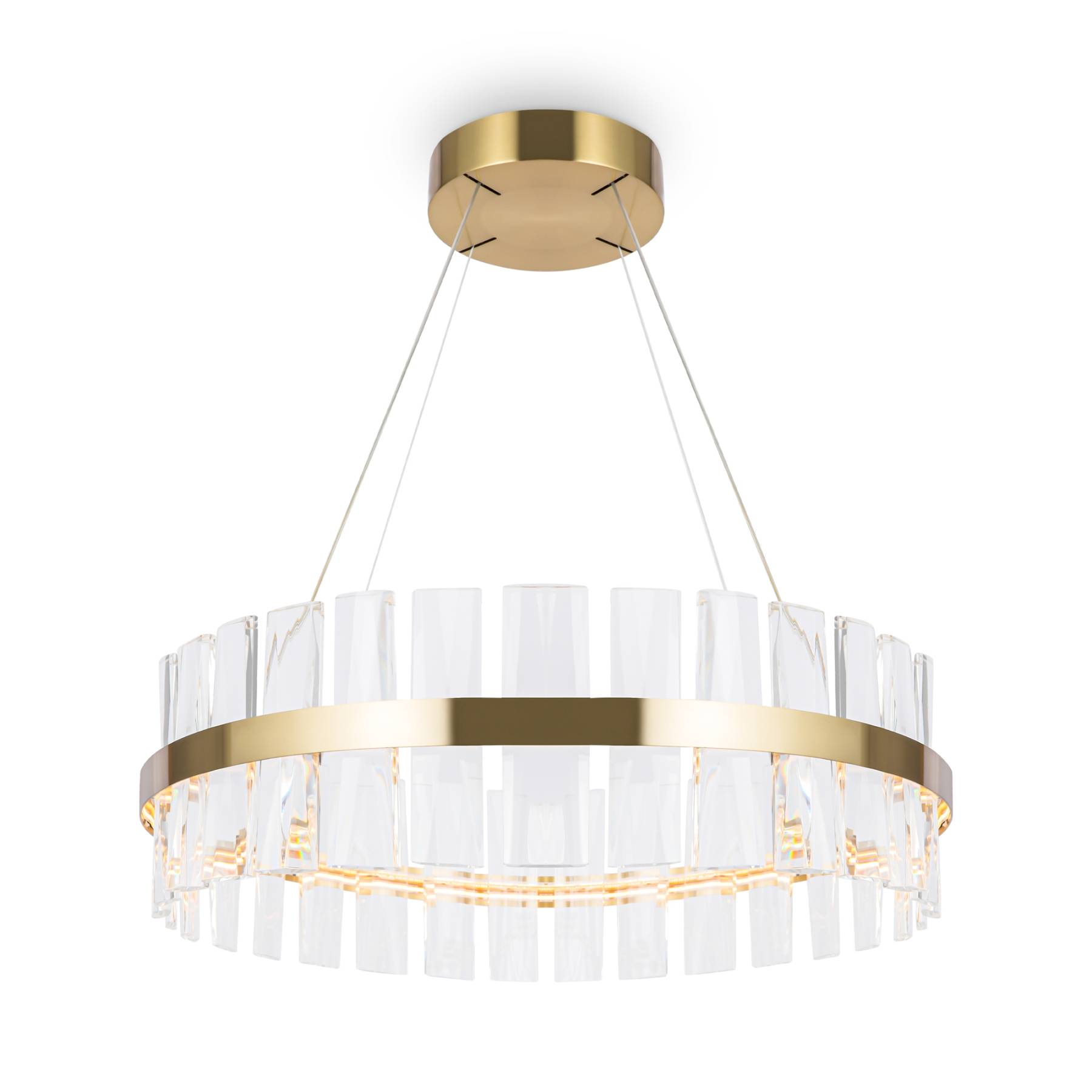 Материал арматуры - металл, цвет - латунь. Декор - объемные прозрачные хрустальные элементы с чередующимся рисунком. LED источник света, цветовая температура - 3000К. Регулируемая длина тросов.