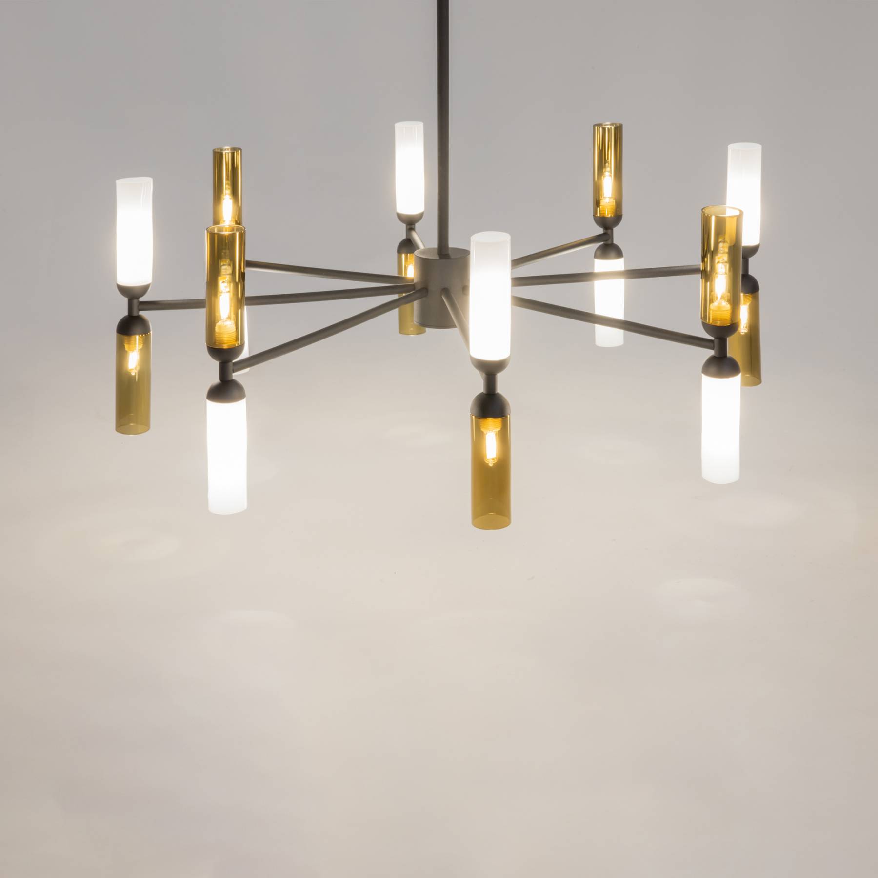 Металлическая арматура, цвет - черный. Светильники стилизованы под форму песочных часов с обтекаемой формой. Керамические элементы с глянцеовй глазурью. Подвесные светильники с плафонами из белой керамики с прозрачным, черно-белым, золото-белым и белым стеклом. Регулируемая высота подвесных светильников.