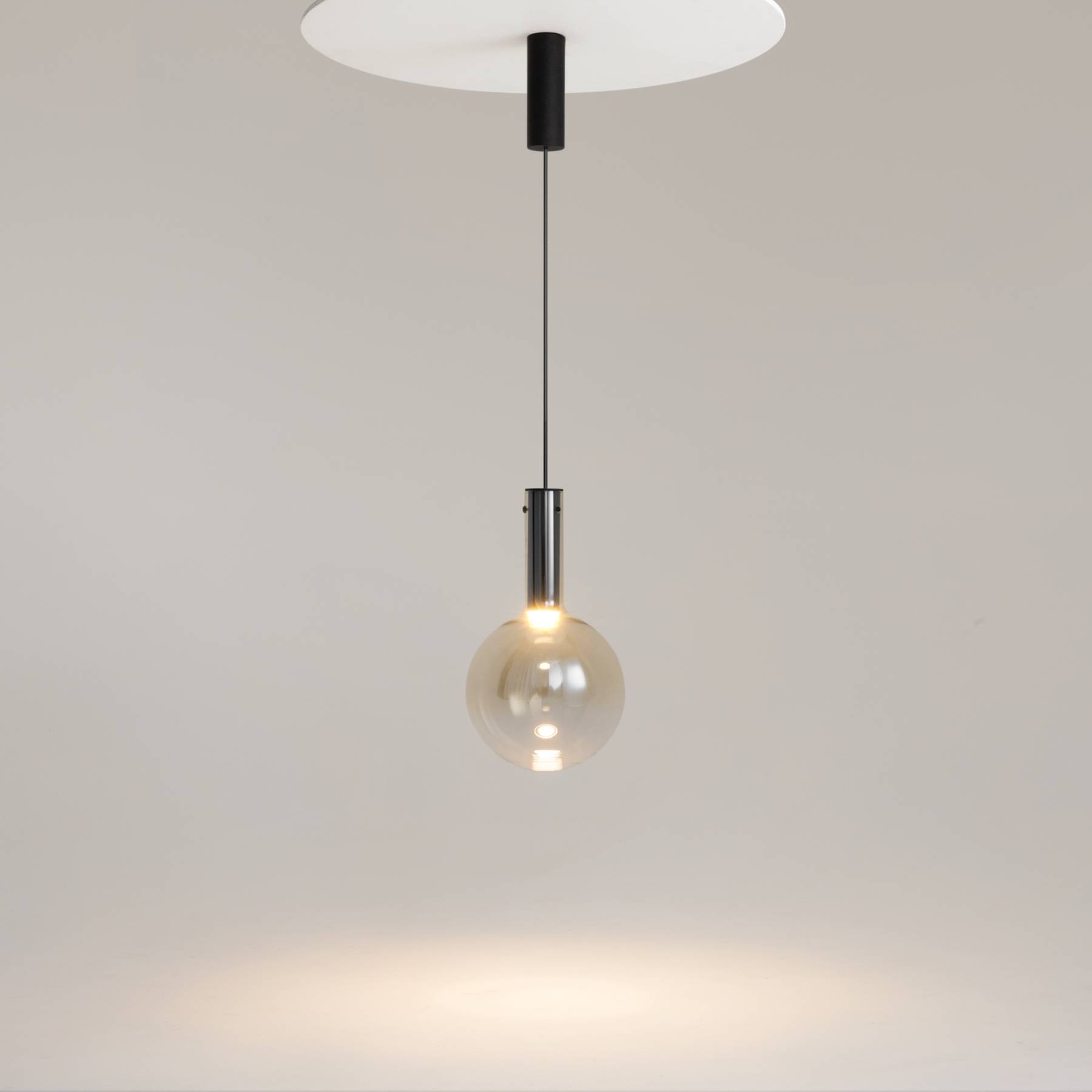 Металлическая арматура, цвет - черный, белый. Выдувной плафон-шар из стекла с вытянутым цилиндрическим основанием в трех цветах: дымчато-черный, туманно-белый, бежево-коньячный. LED-источник света в основании плафона. Цветовая температура 3000К. Два диаметра плафонов и регулируемая длина проводов для создания разнообразных композиций.