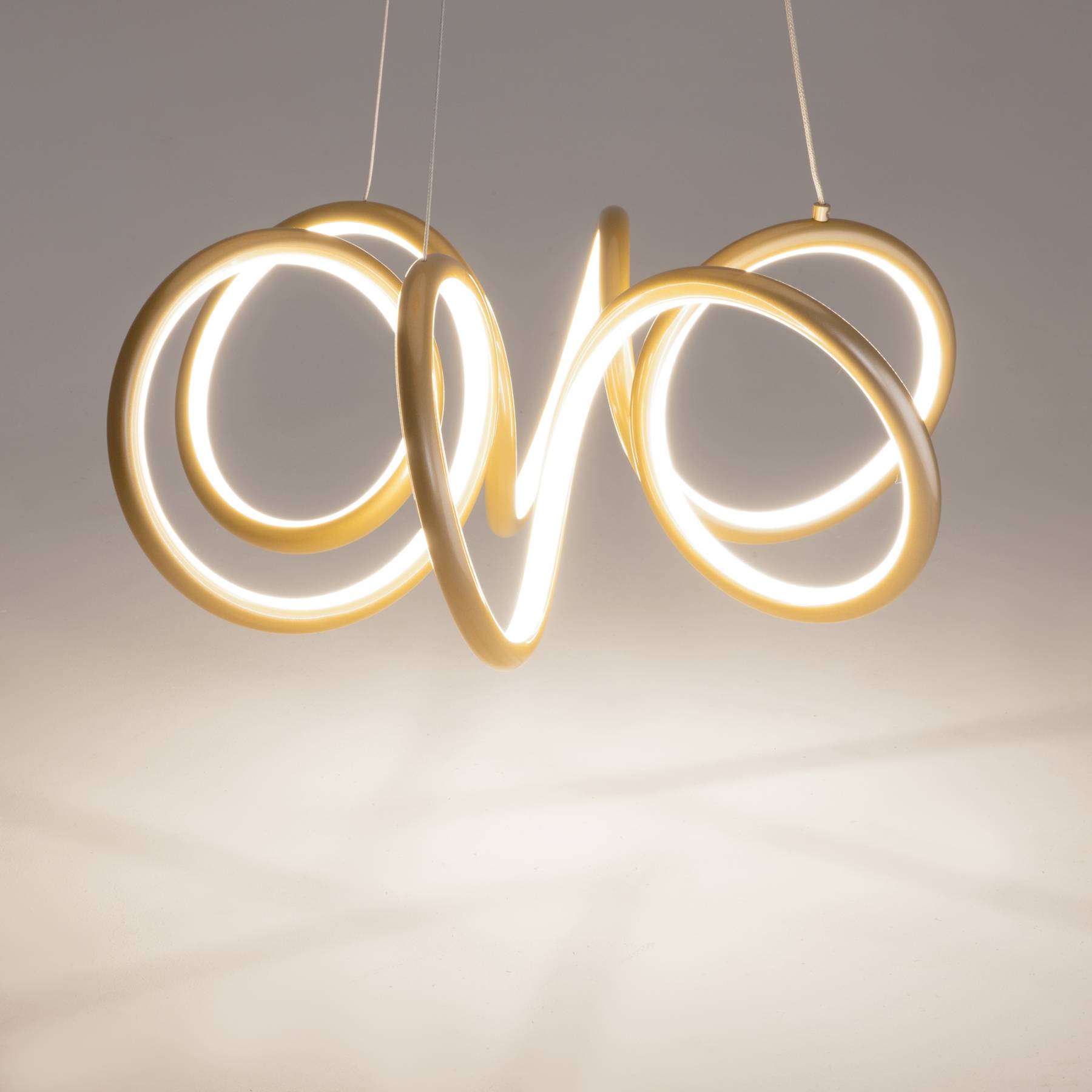 Металлическая арматура, цвета - черный, латунь. Закругленные световые элементыиз силикона со встроенным LED-источником света по всему периметру. Регулируемый диапазон цветовой тмепературы 2600К-3500К для светильников в латуни и 3000К-4000К для черных. Регулируема длина тросов. Фантазийный образ хаотичных фрагментов свободно парящих в пространстве.