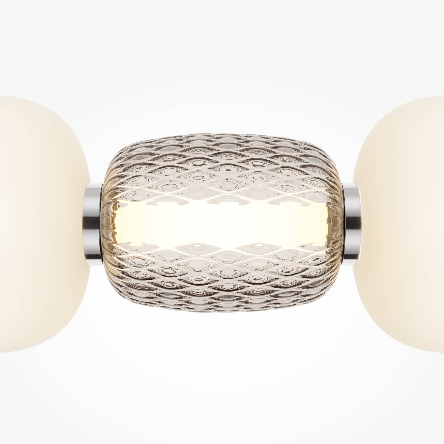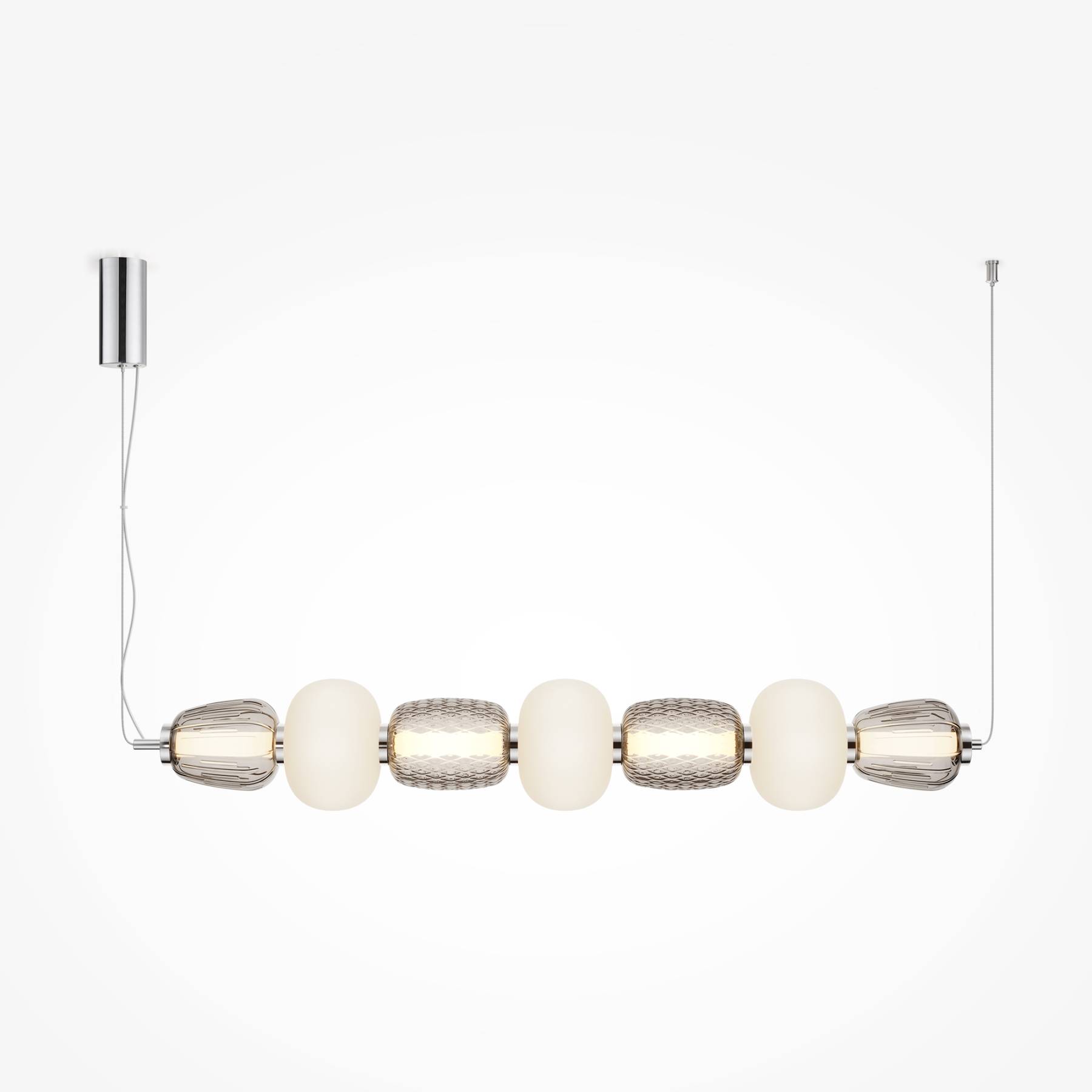 Металлическая арматура, цвет - золото, хром. Микс плафонов округлых и вытянутых форм из белого  матового и прозрачного стекла с сетчатым и с линейным повторяющимся рельефным рисунком. Регулируемая высота подвесных моделей, провод - 3 метра. LED-источник света, цветовая температура  3000К.