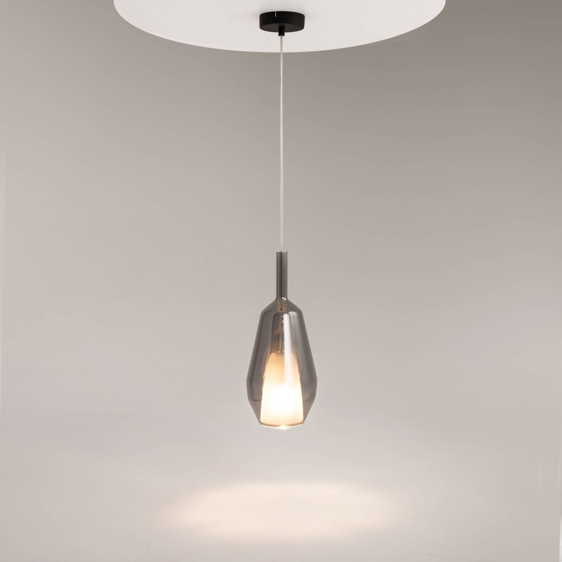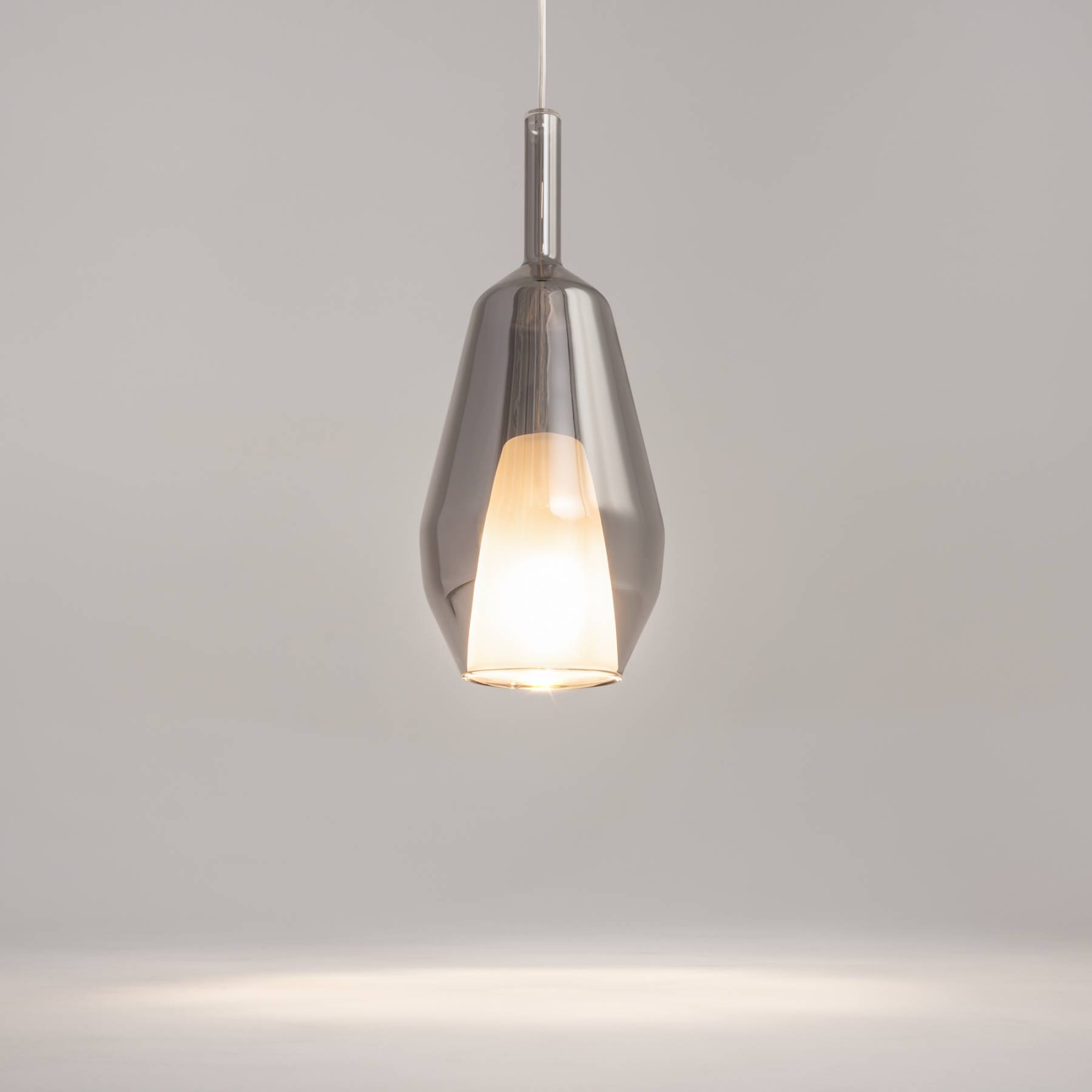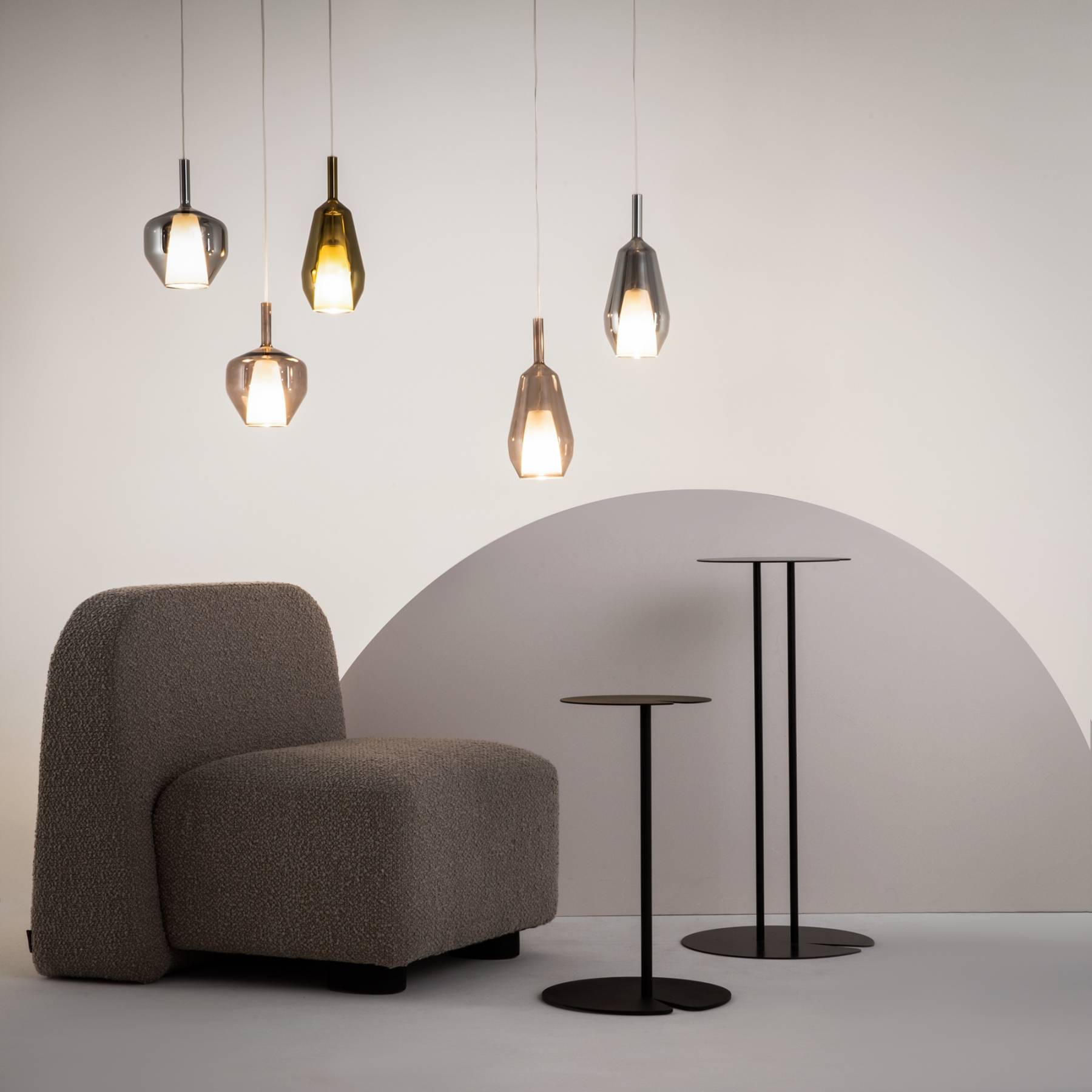 Металлическое основание, цвет — черный. Двойные стеклянные плафоны. Многообразные геометрические формы плафонов. Цвет стекла: зеркальный золотой, кофейный и дымчатый, а также градиентный белый. Регулируемая длина провода — 3 метра. Источник света — лампа с цоколем Е27.