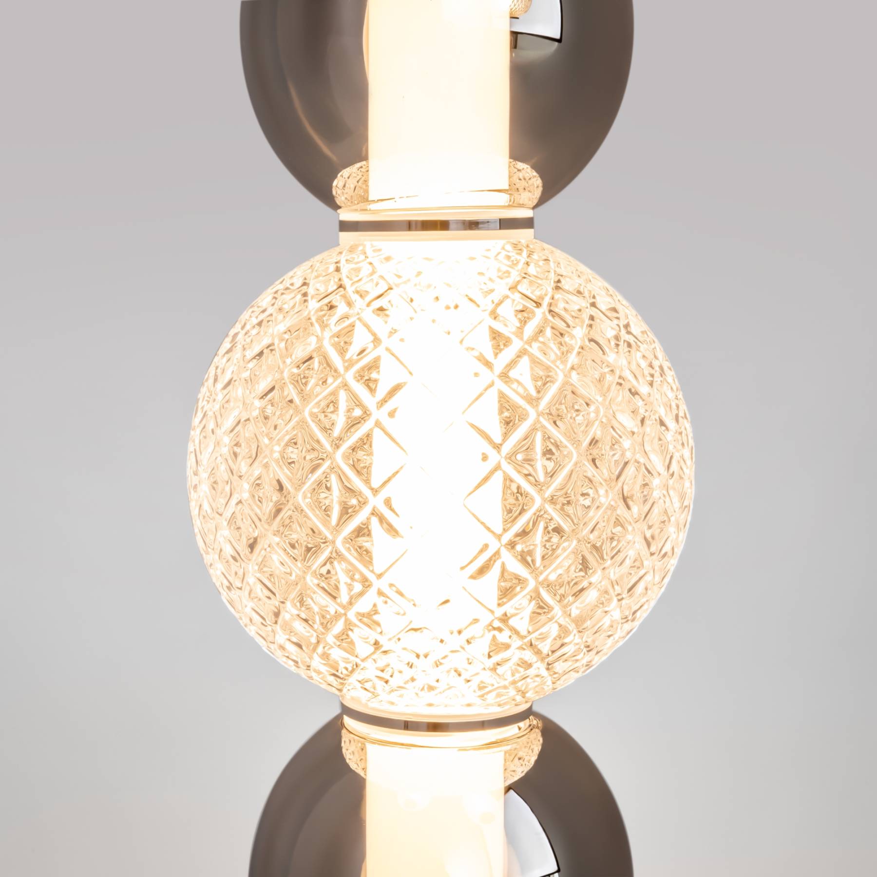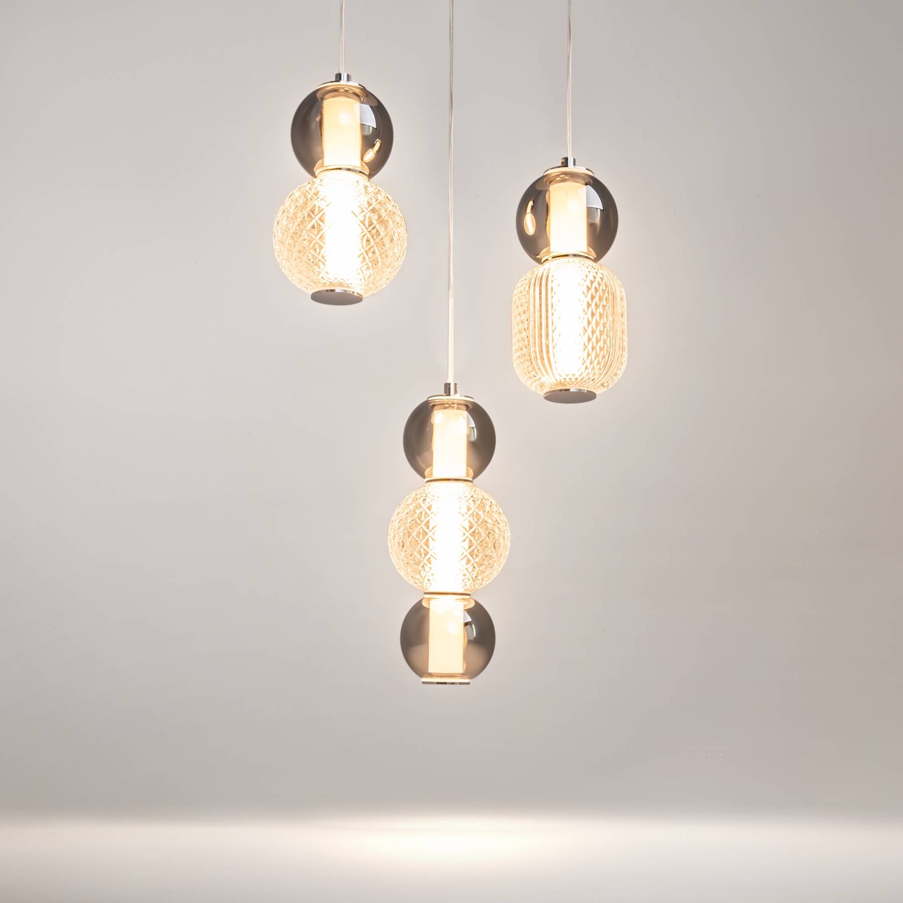 Материал арматуры - металл, цвета - золото, хром. Микс плафонов: гладкие cферы коньячного или дымчатого оттенка + округлые рельефные с ромбовидным узором из прозрачного стекла. Регулируемая высота подвесных моделей - максимальная длина провода 3 метра. LED-источник света, цветовая температура 3000К