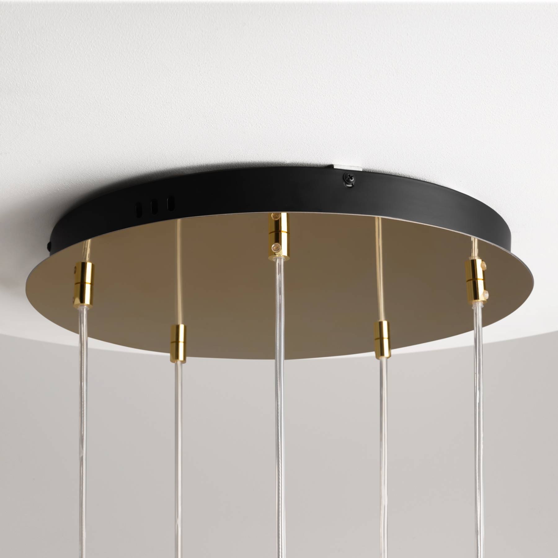 Материал арматуры - металл, цвета - золото, хром. Микс плафонов: гладкие cферы коньячного или дымчатого оттенка + округлые рельефные с ромбовидным узором из прозрачного стекла. Регулируемая высота подвесных моделей - максимальная длина провода 3 метра. LED-источник света, цветовая температура 3000К