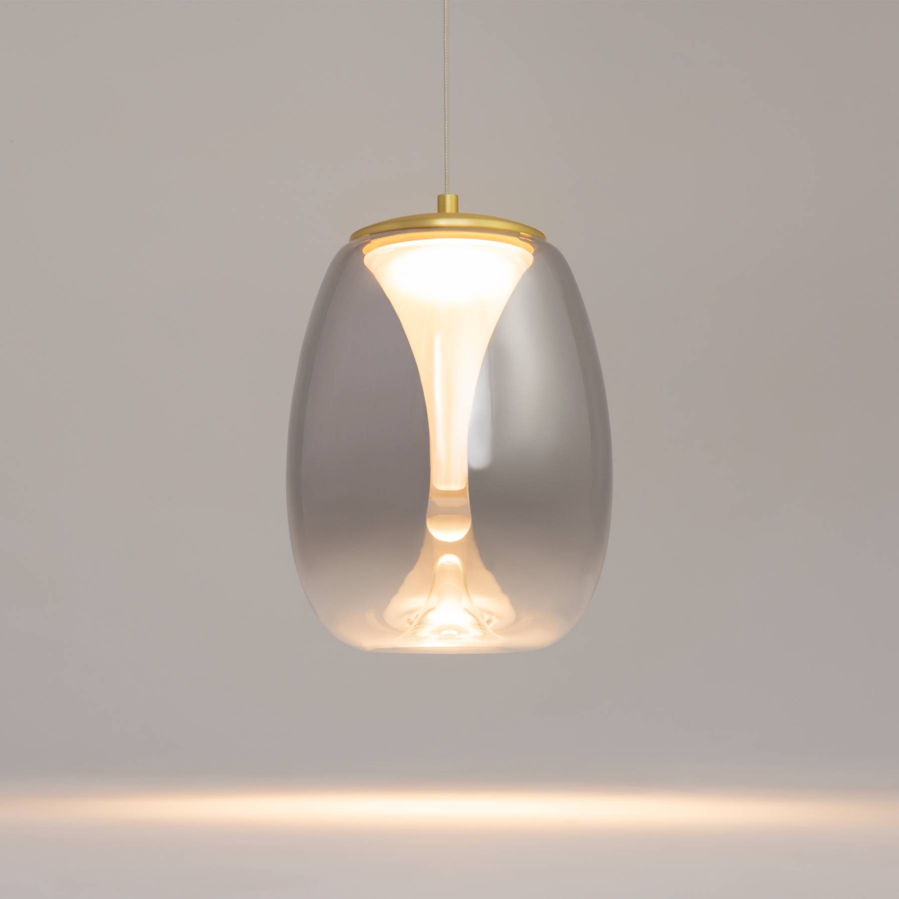 Цвет арматуры - сатинированное золото. Плафоны из двойного стекла. Внешние плафоны в двух цветах: прозрачный и гальванизированный серый с эффектным градиентом - придают освещению глубину и насыщенность. LED источник света с цветовой температурой 3000K. Провод подвесных светильников регулируемый - длина 3 метра. Идеальны для помещений с высокими потолками.