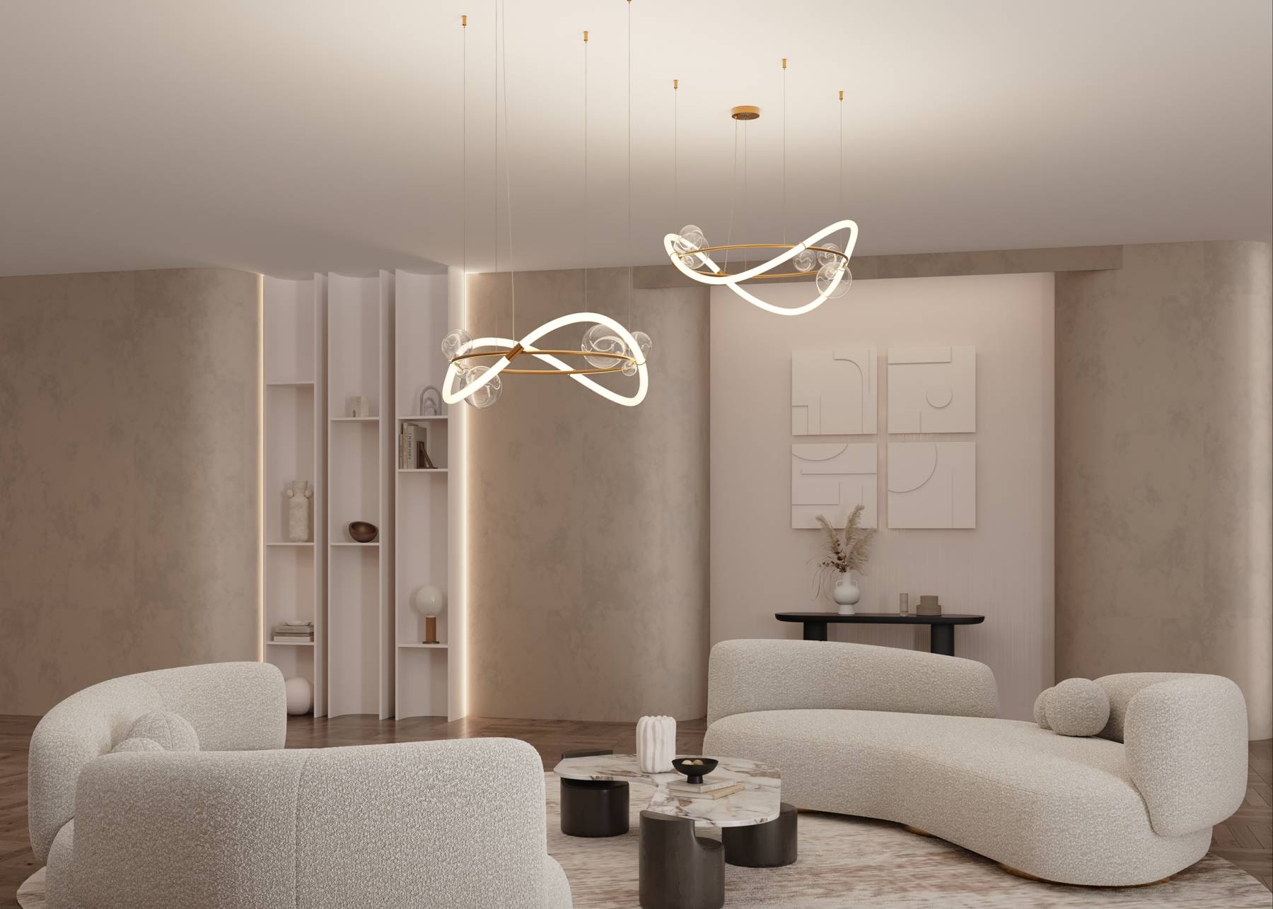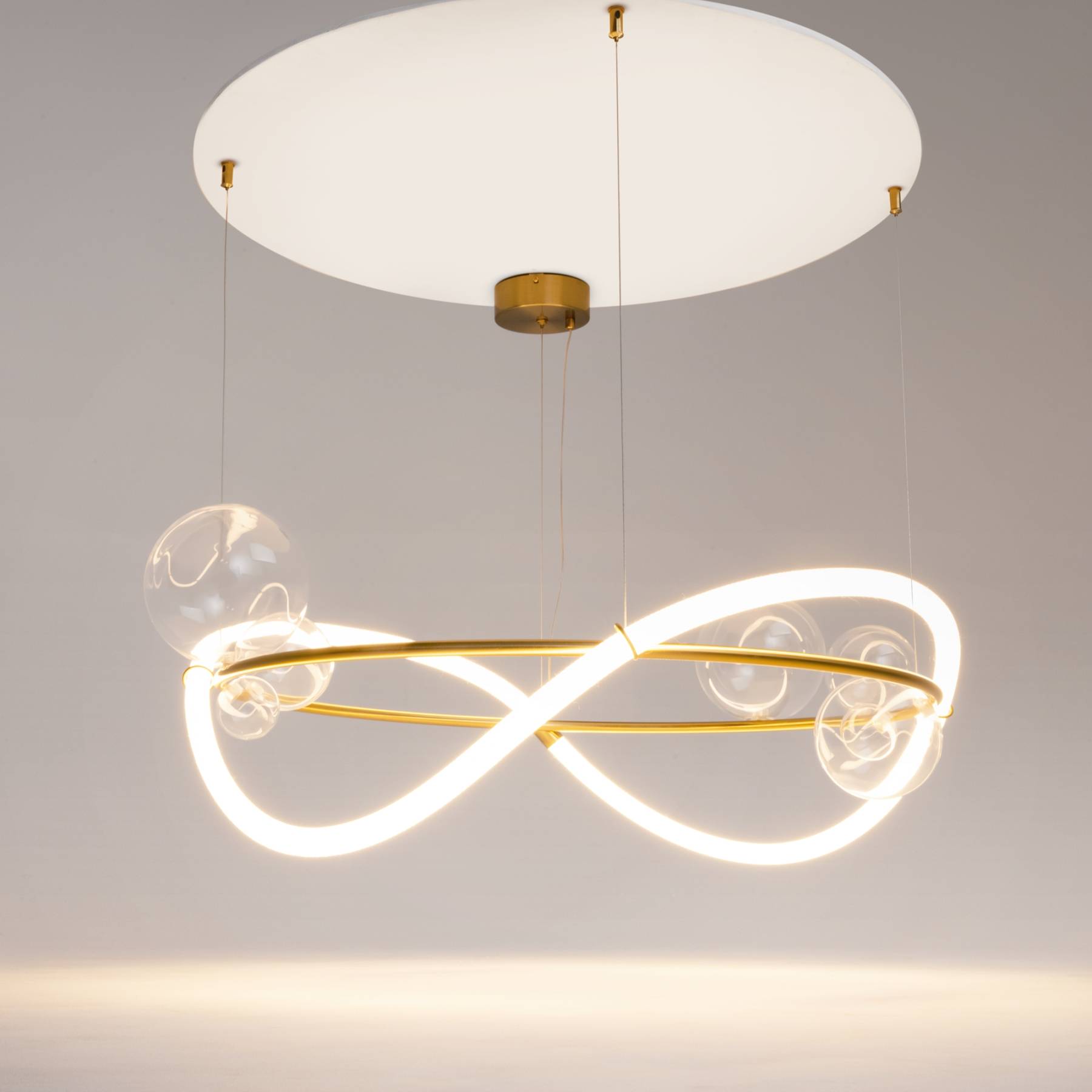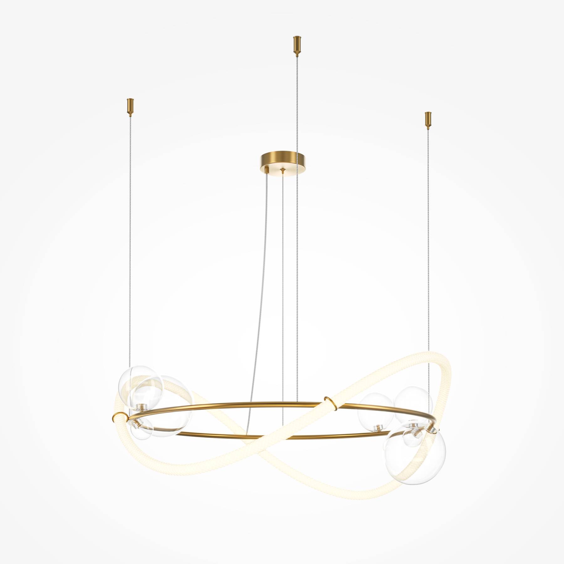 Арматура из металла цвета латуни, материал рассеивателя – текстильный жгут, декоративные элементы выполнены из прозрачного выдувного стекла. LED-источник света. Цветовая температура 3000К, угол рассеивания света 360°. Вертикальное настенное бра включается touch-сенсором. Тканевый шнур. Высота подвесных светильников регулируется.