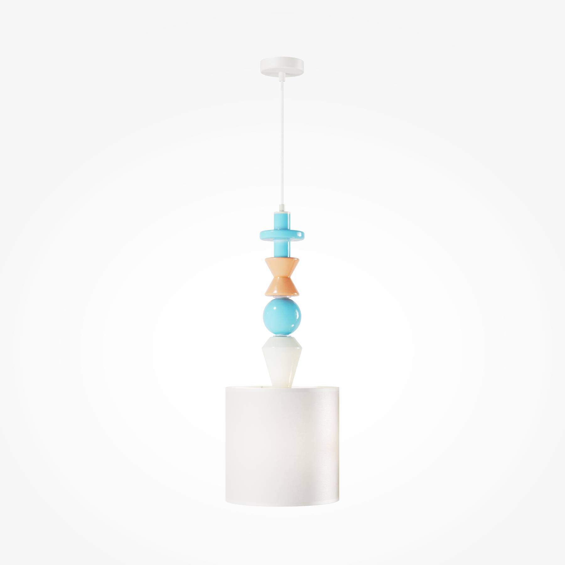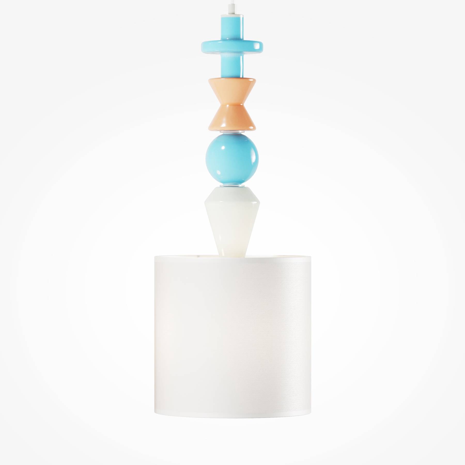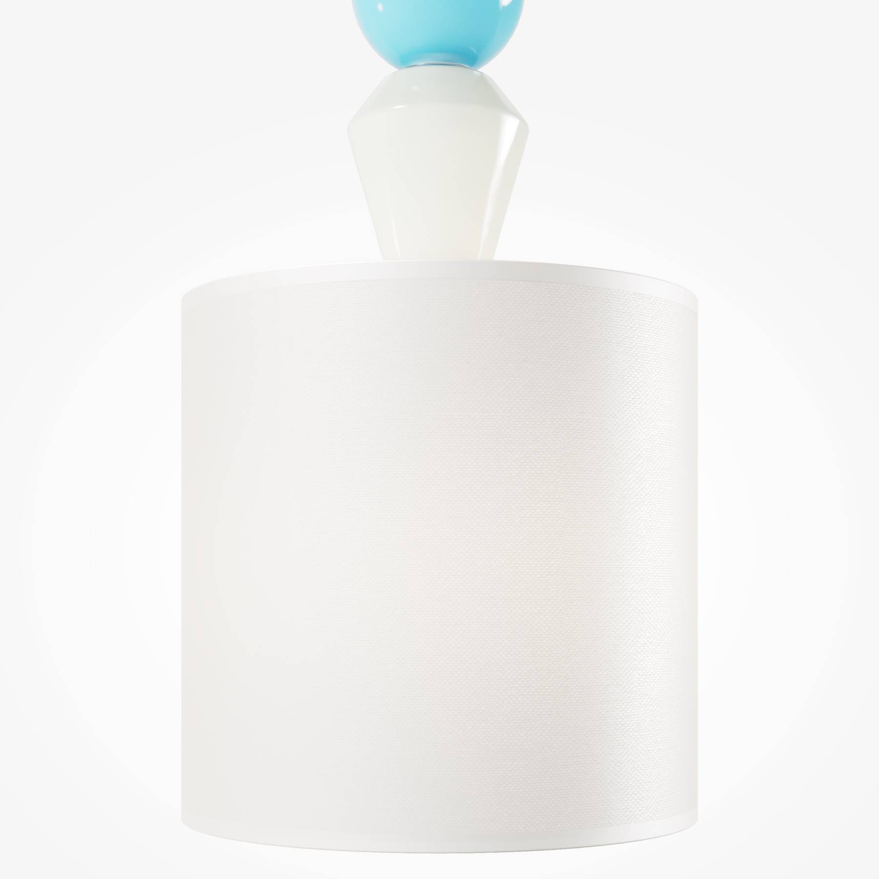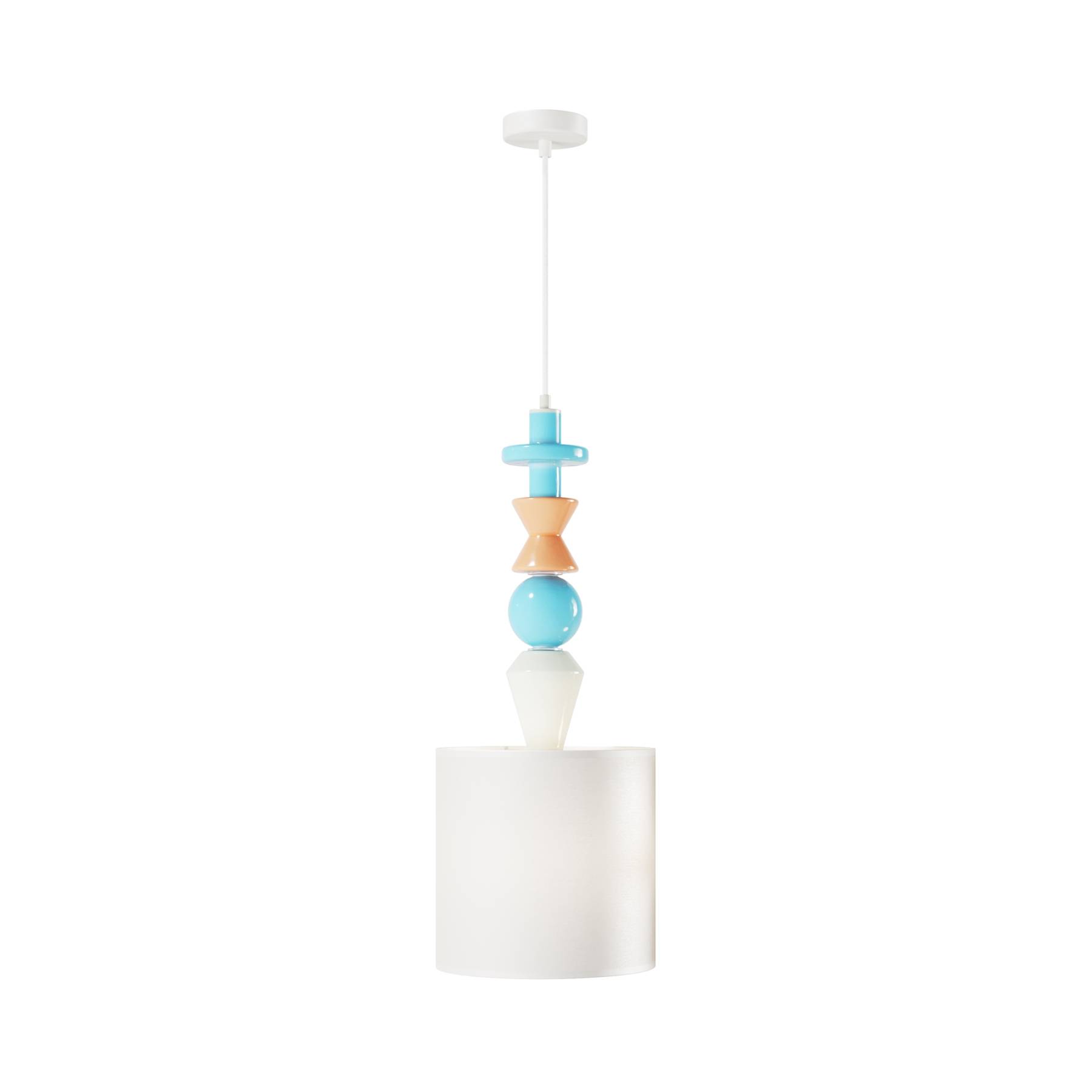 Арматура из металла, цвет - белый. Абажур выполнен из натуральной ткани, цветные декоративные элементы в пастельных тонах — из керамики. Белый абажур имеет классическую цилиндрическую форму, ткань дает мягкий рассеянный свет. Светильники комплектуются сменными лампами с цоколем Е27 (не входят в комплект). Провод подвесного светильника можно регулировать по длине. Декор напоминает стилистику  крафтового искусства