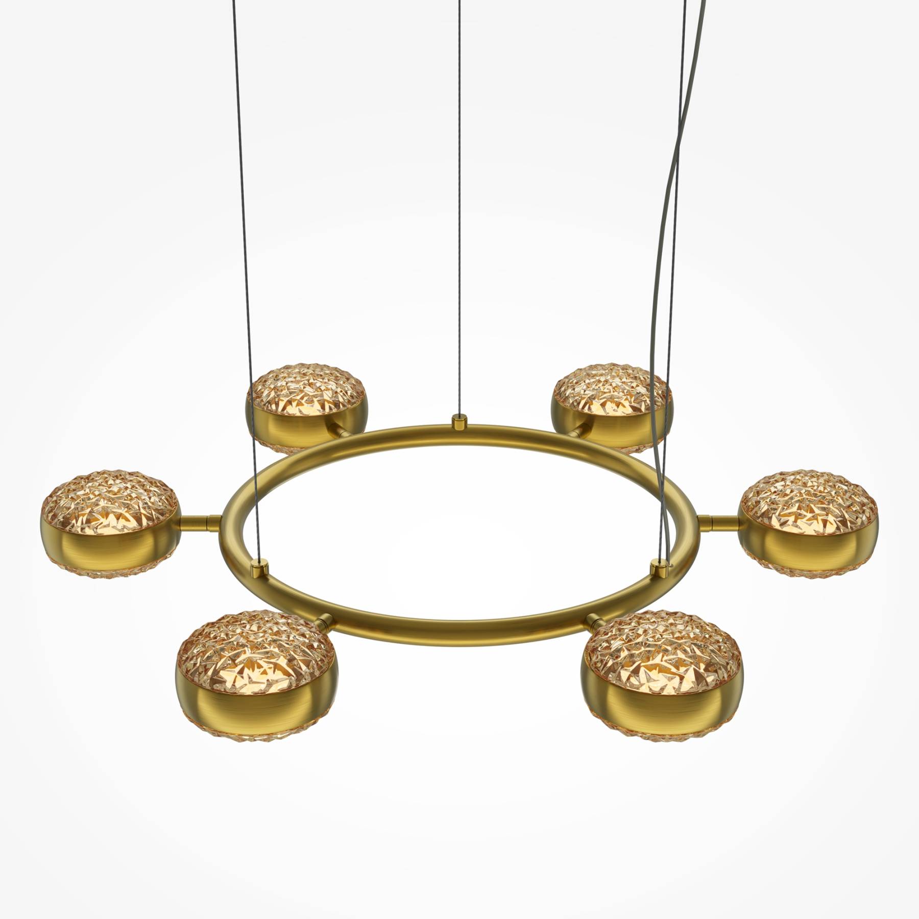 Два цветовых сочетания: сатинированная арматура из металла в цвете латунь в комбинации со стеклянными плафонами янтарного оттенка или трендовый черный хром с глянцевым финишем в сочетании с тонированными светло-серыми плафонами. Источник света: LED. Цветовая температура 3000К, угол рассеивания 120 градусов. Провод длиной 3 м можно регулировать по высоте — светильник подходит для помещений с высокими потолками.