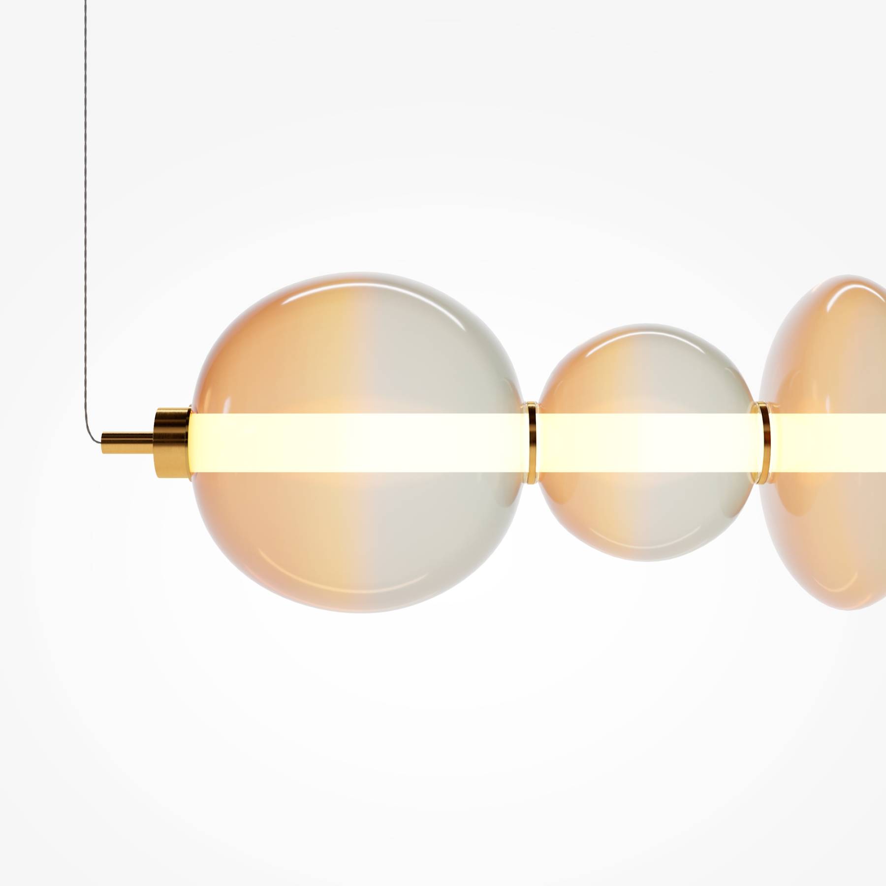 Светильники с тонированными выдувными стеклянными плафонами (дымчатыми  или янтарными) и металлической арматурой (черной или цвета латуни). Окрашивание плафонов градиентное. Источник света: LED. Световой элемент установлен внутри акрилового рассеивателя. Цветовая температура источника света – 3000К, угол рассеивания — 120°. Торшеры снабжены Push-кнопкой на проводе.