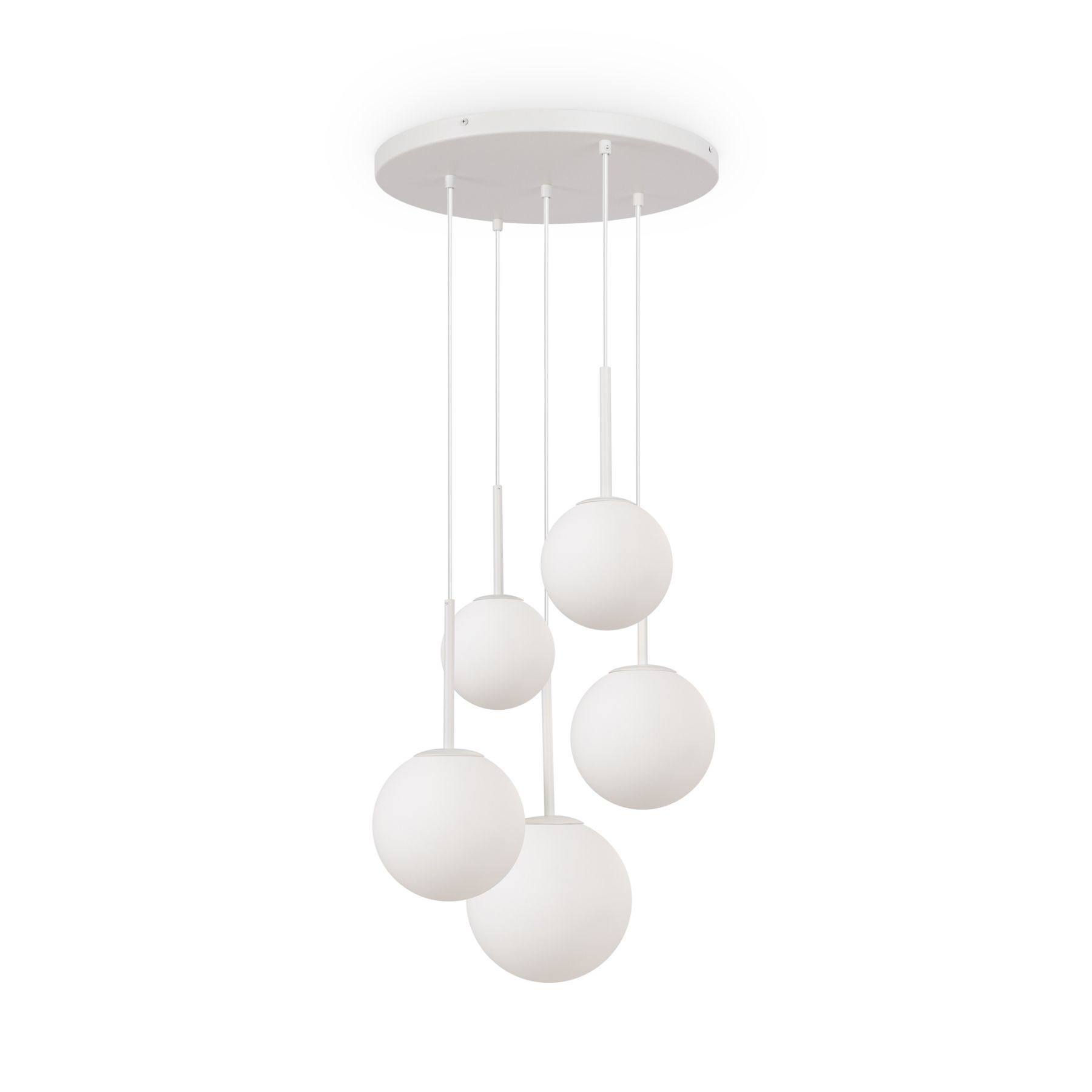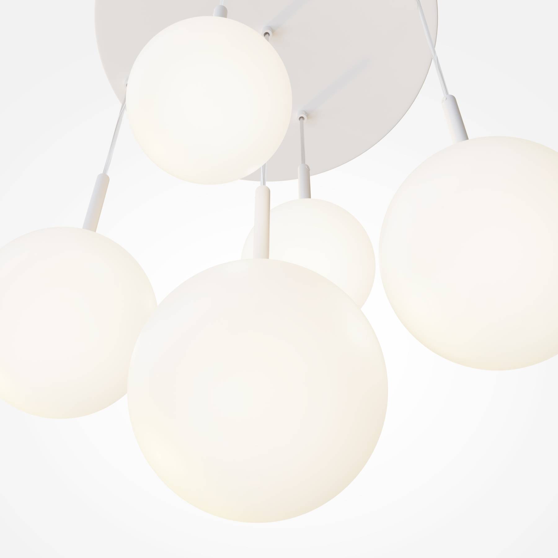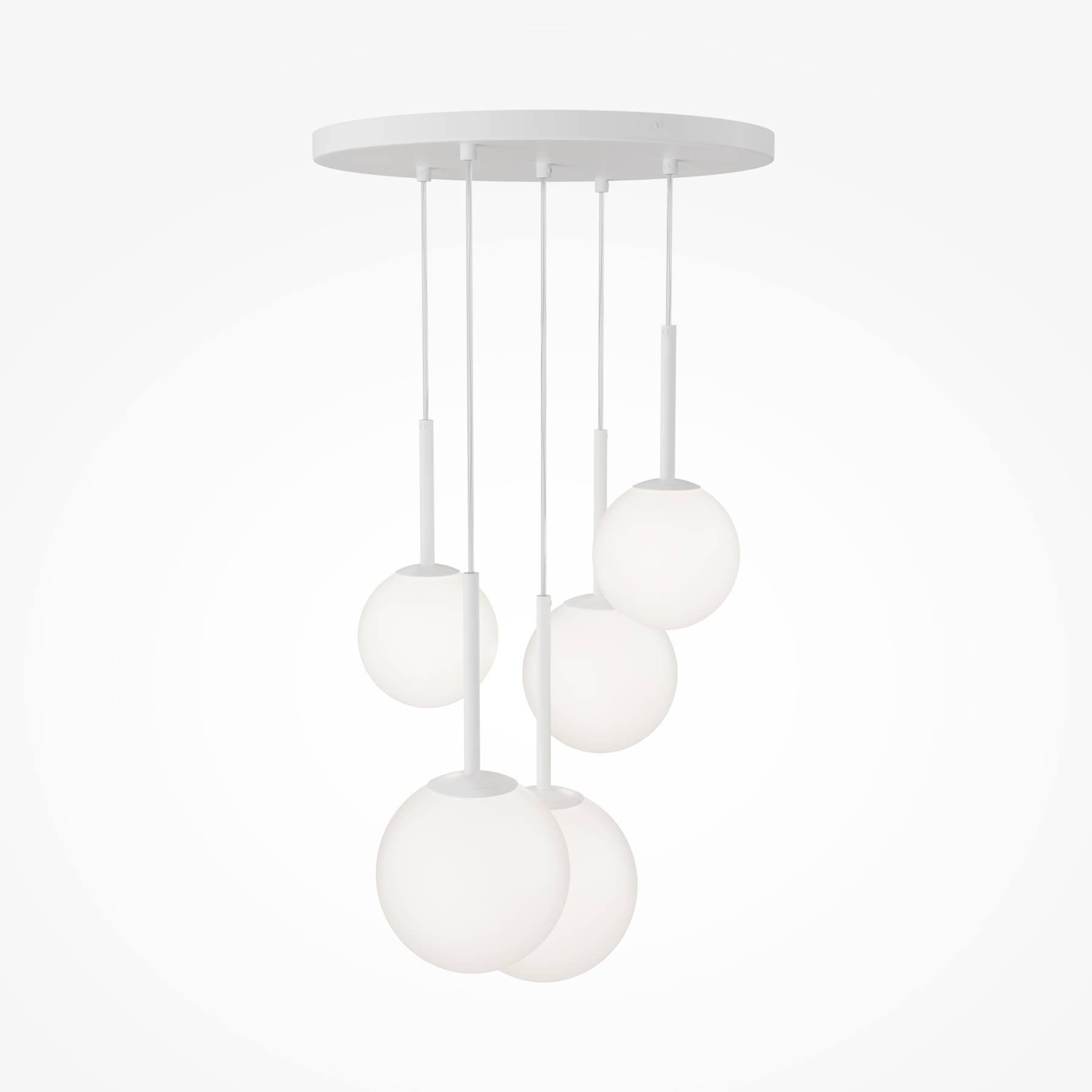 Материал арматуры – металл, цвет - золото, белый, черный. Округлые плафоны из матового белого стекла. Универсальные формы, минималистичный дизайн. Цоколь - E14. Лампы не входят в комплект. Регулируемая высота подвесных светильников.