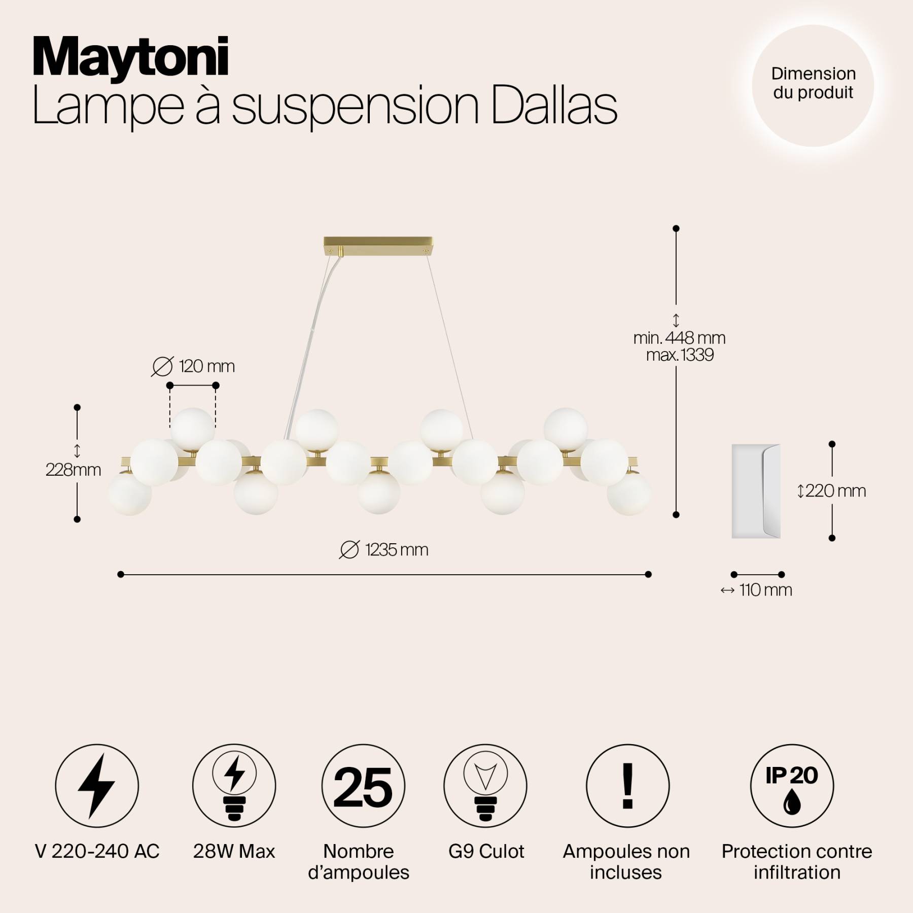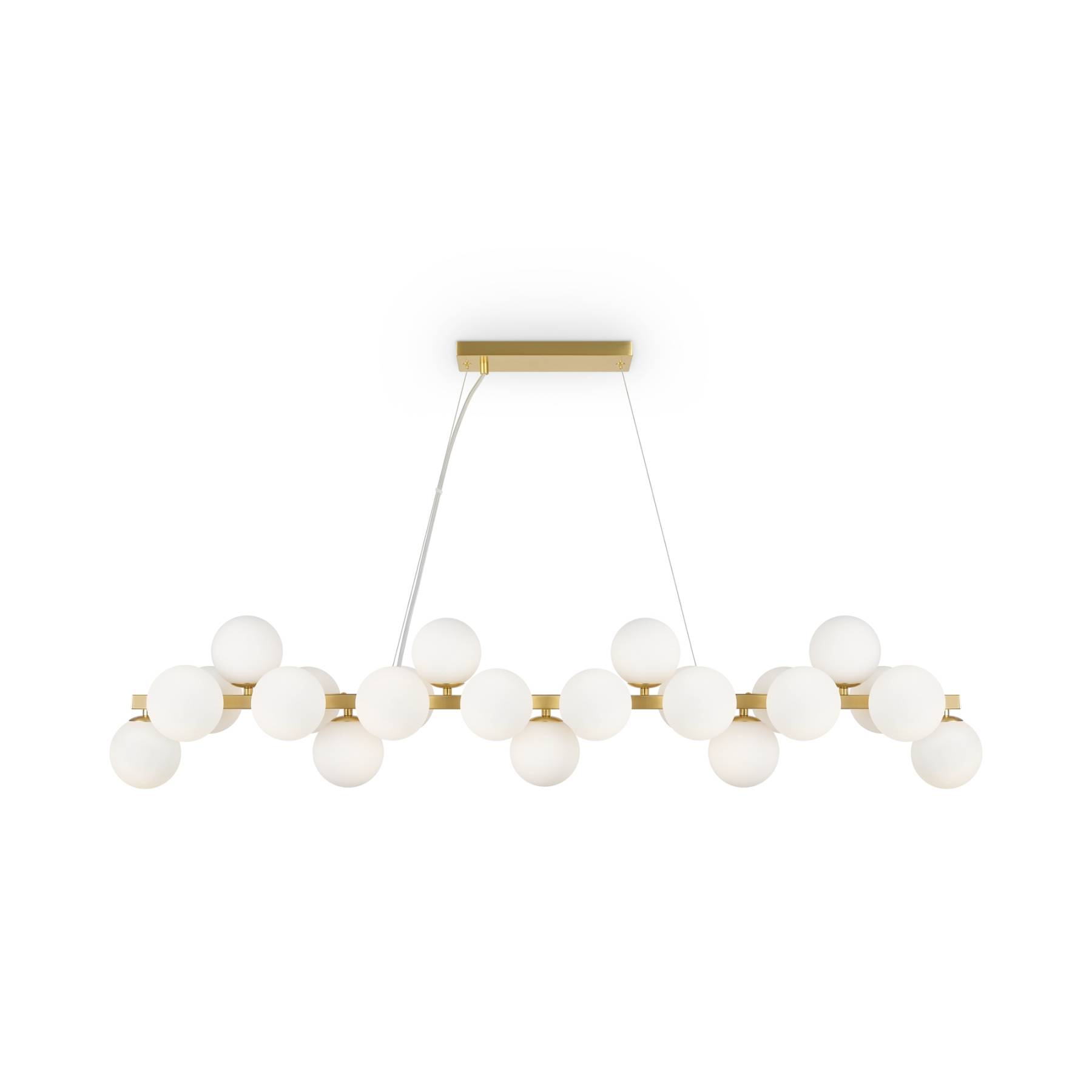 Металлическая арматура в четырех цветах: матовый черный, хром, золото, латунь. Плафоны — выдувное стекло. Цвета — дымчатый, янтарный, коньячный. Дизайн с имитацией молекулярной структуры. Высота подвесных светильников регулируется тросом. Лампа с цоколем G9.