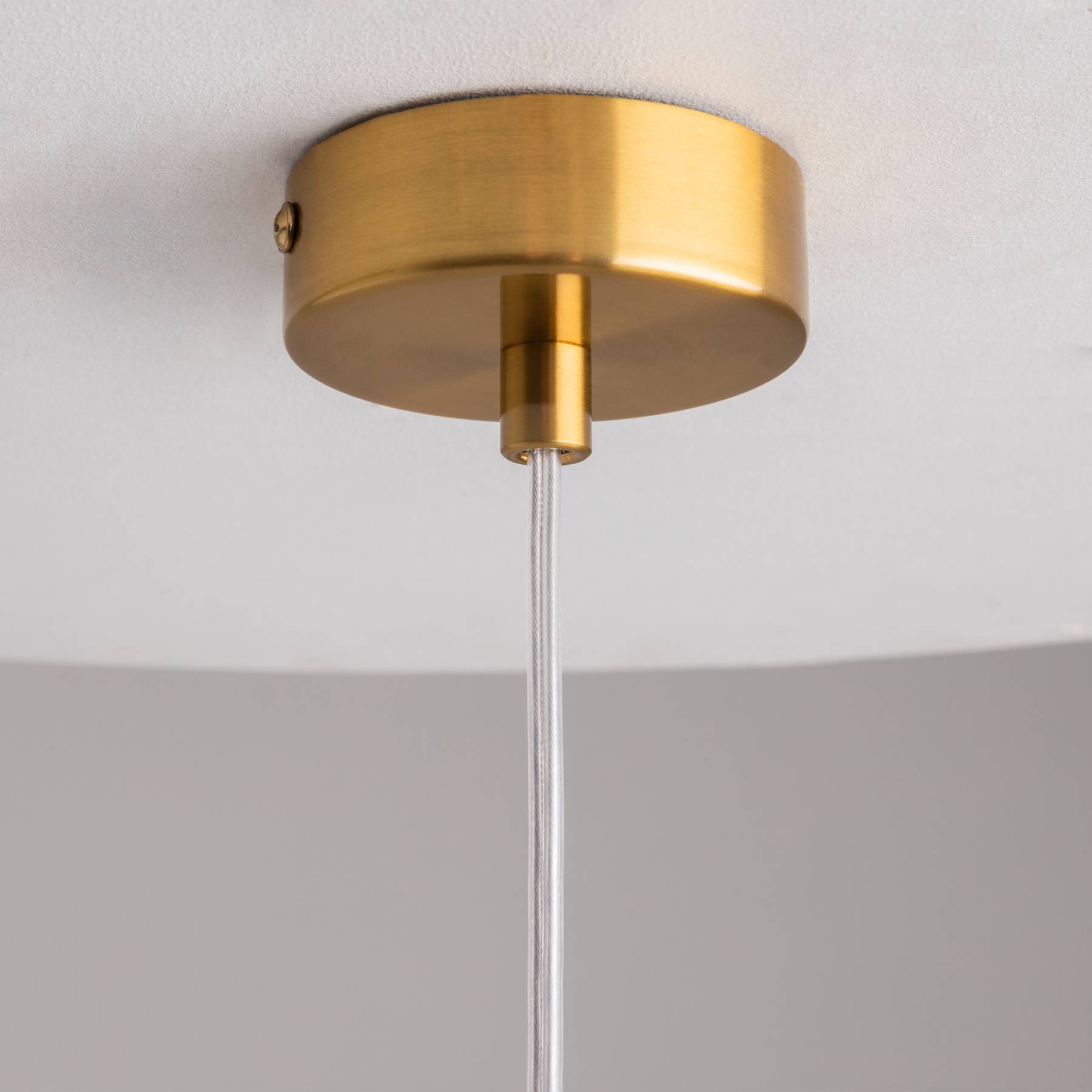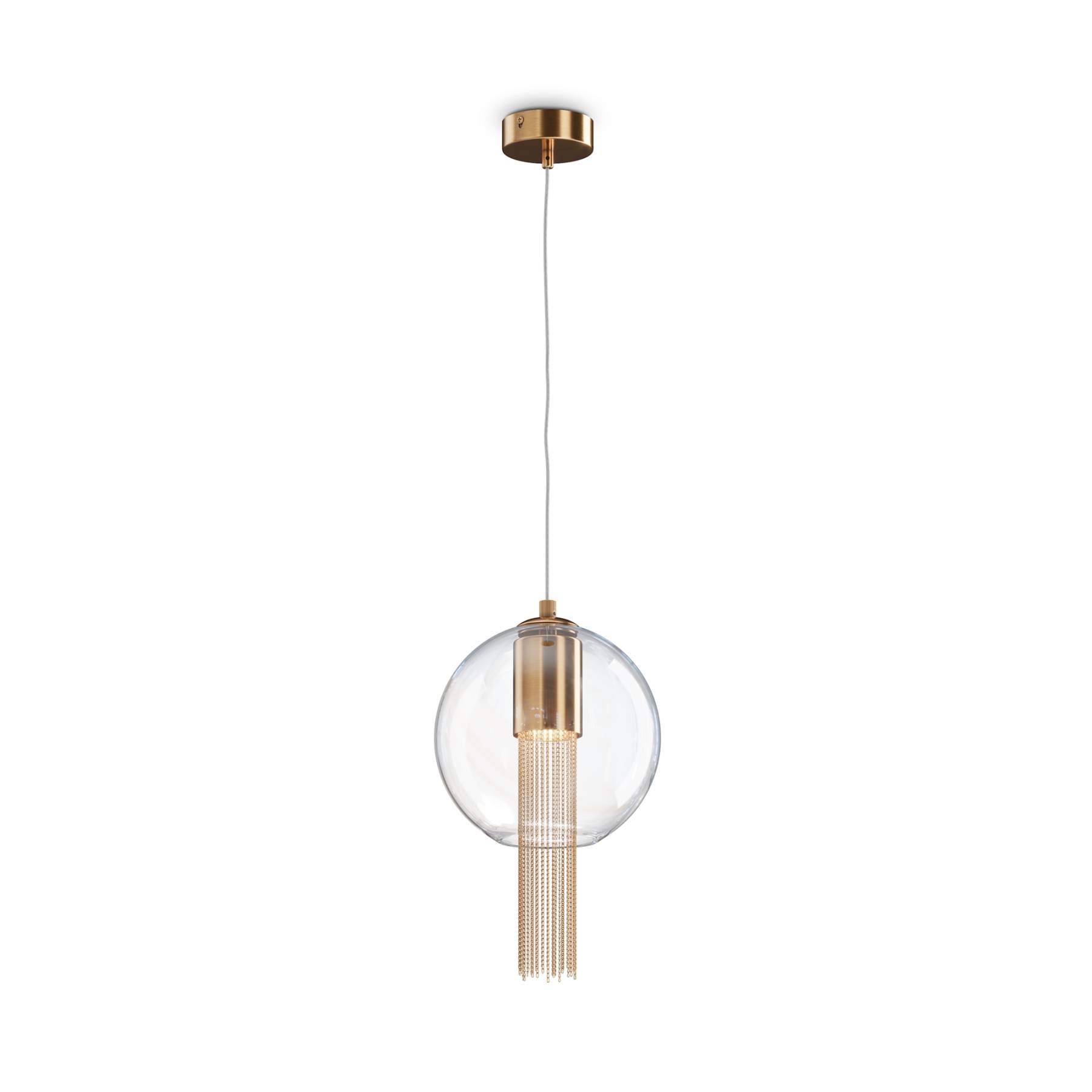 Металлическая арматура в бронзовом оттенке. Плафон-сфера – прозрачное выдувное стекло. Декор – подвесные цепочки внутри плафона. Скрытый источник света.