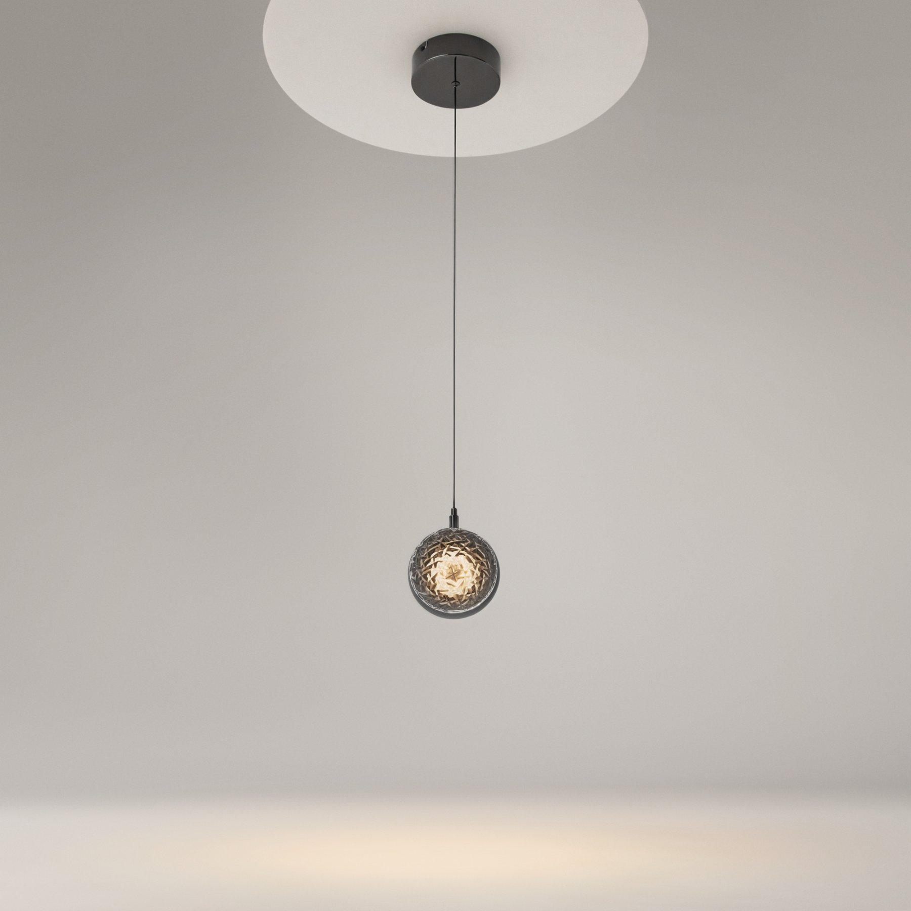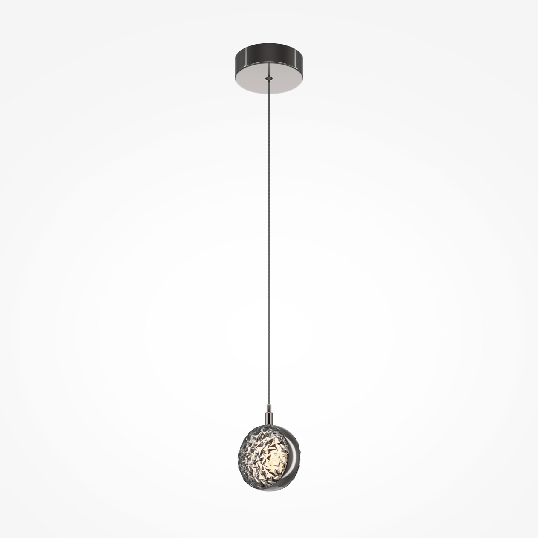 Два цветовых сочетания: сатинированная арматура из металла в цвете латунь в комбинации со стеклянными плафонами янтарного оттенка или трендовый черный хром с глянцевым финишем в сочетании с тонированными светло-серыми плафонами. Источник света: LED. Цветовая температура 3000К, угол рассеивания 120 градусов. Провод длиной 3 м можно регулировать по высоте — светильник подходит для помещений с высокими потолками.