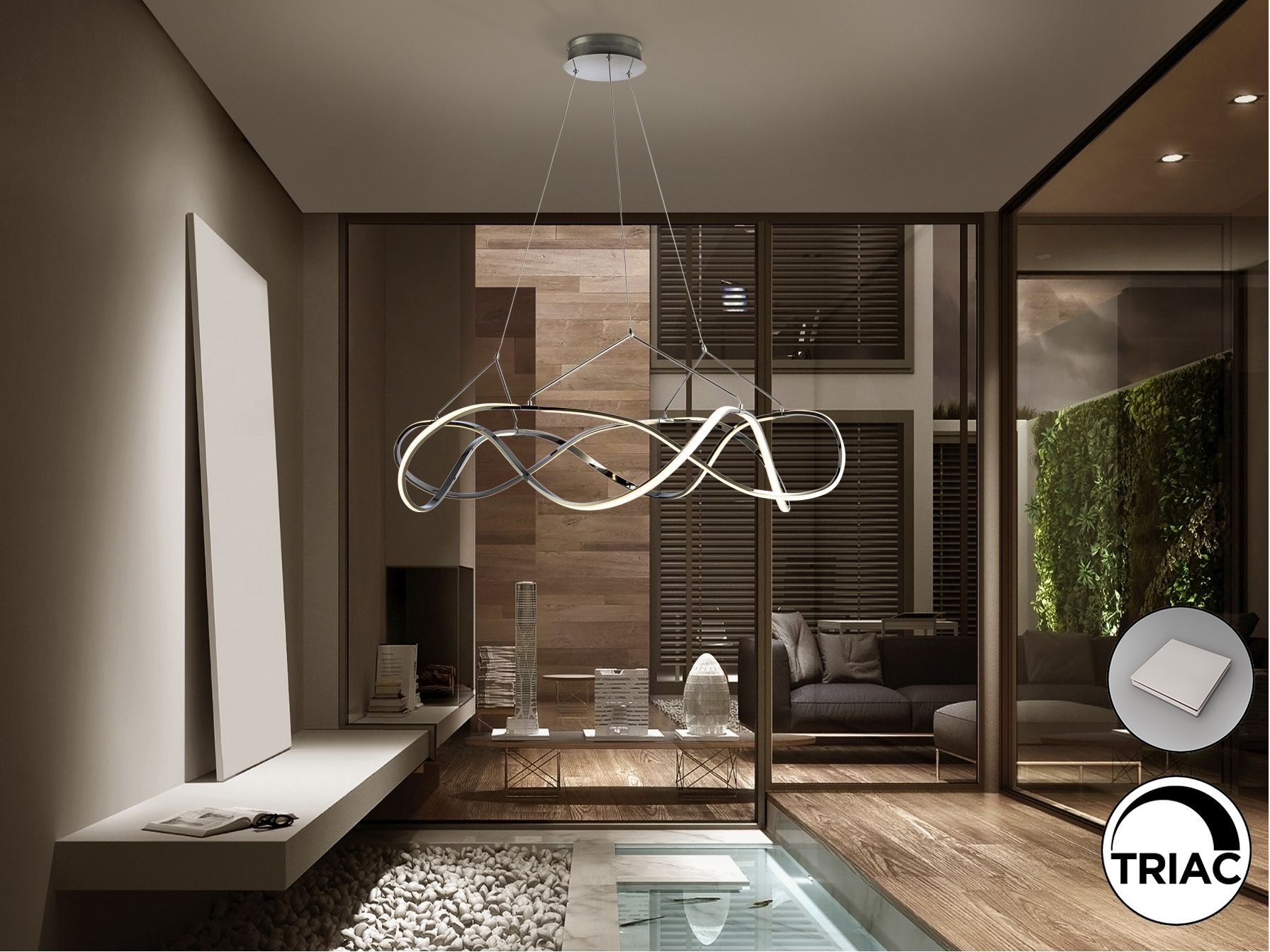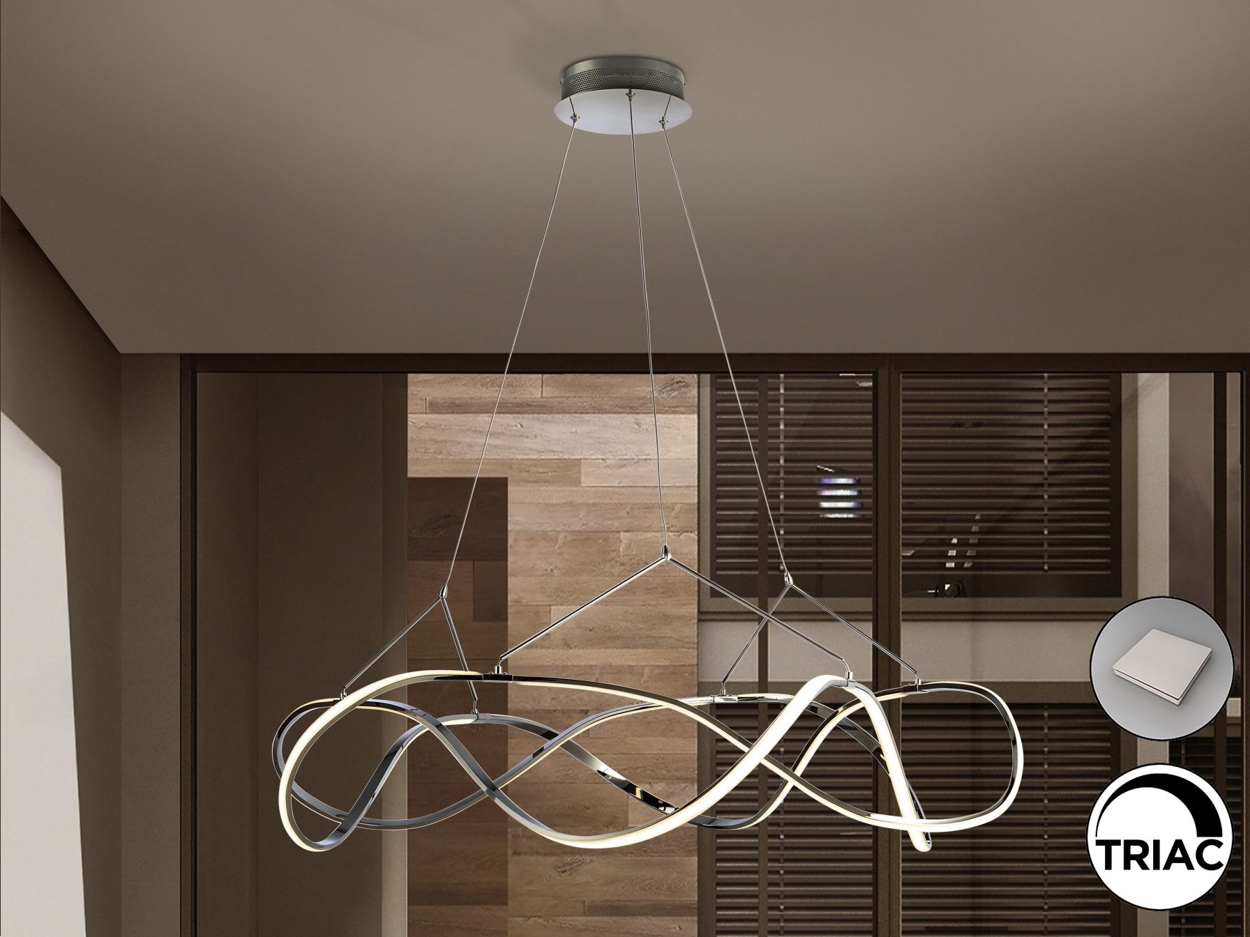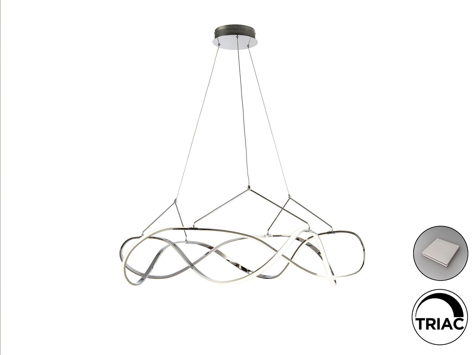 Подвесной светильник LED из алюминия с покрытием "хром". Рассеиватели из силикона опалового цвета, с регулируемой высотой, 63W LED, 5670 Lm, 3000 K. Диммируемый. В комплекте с пультом ДУ.