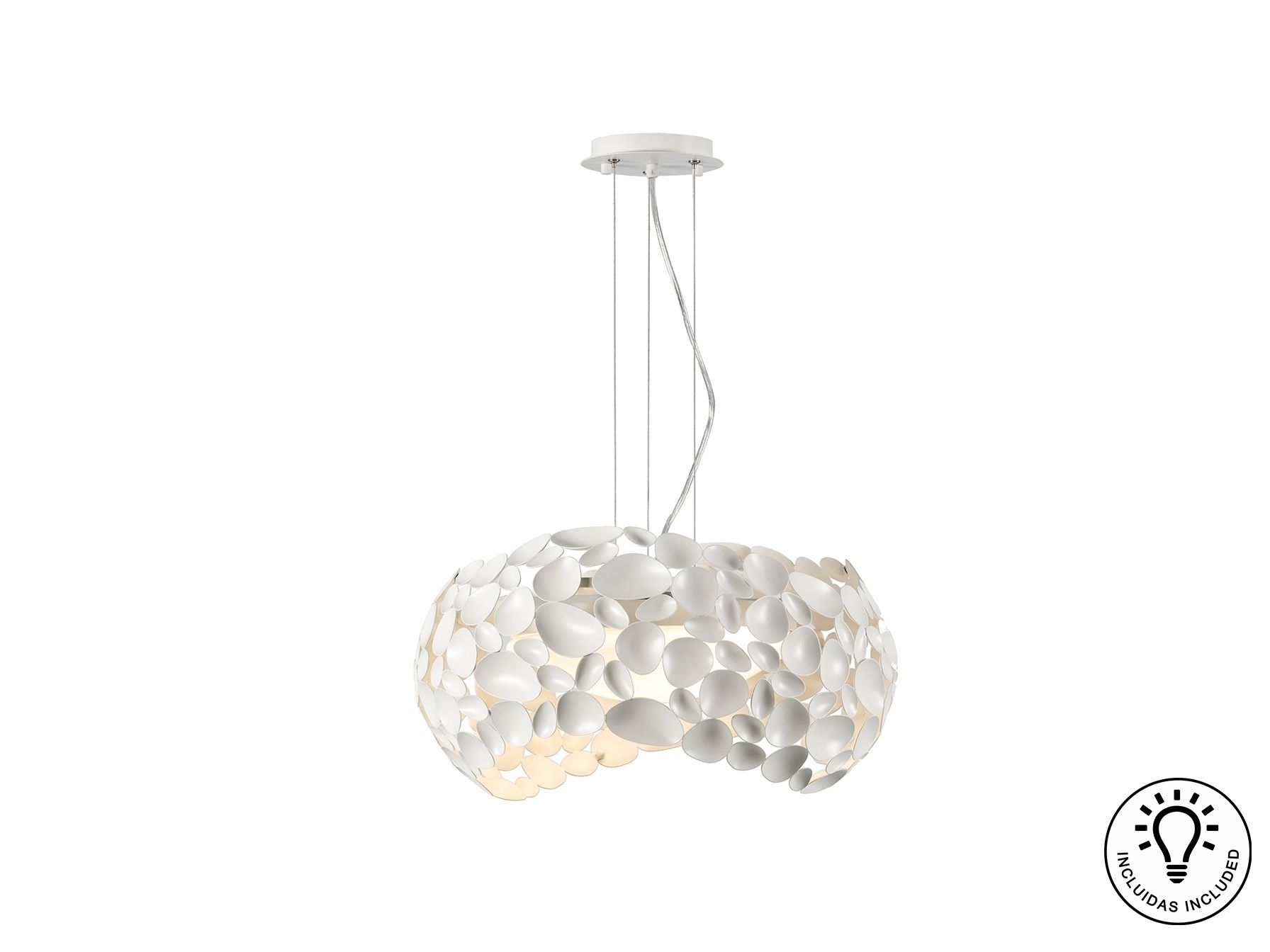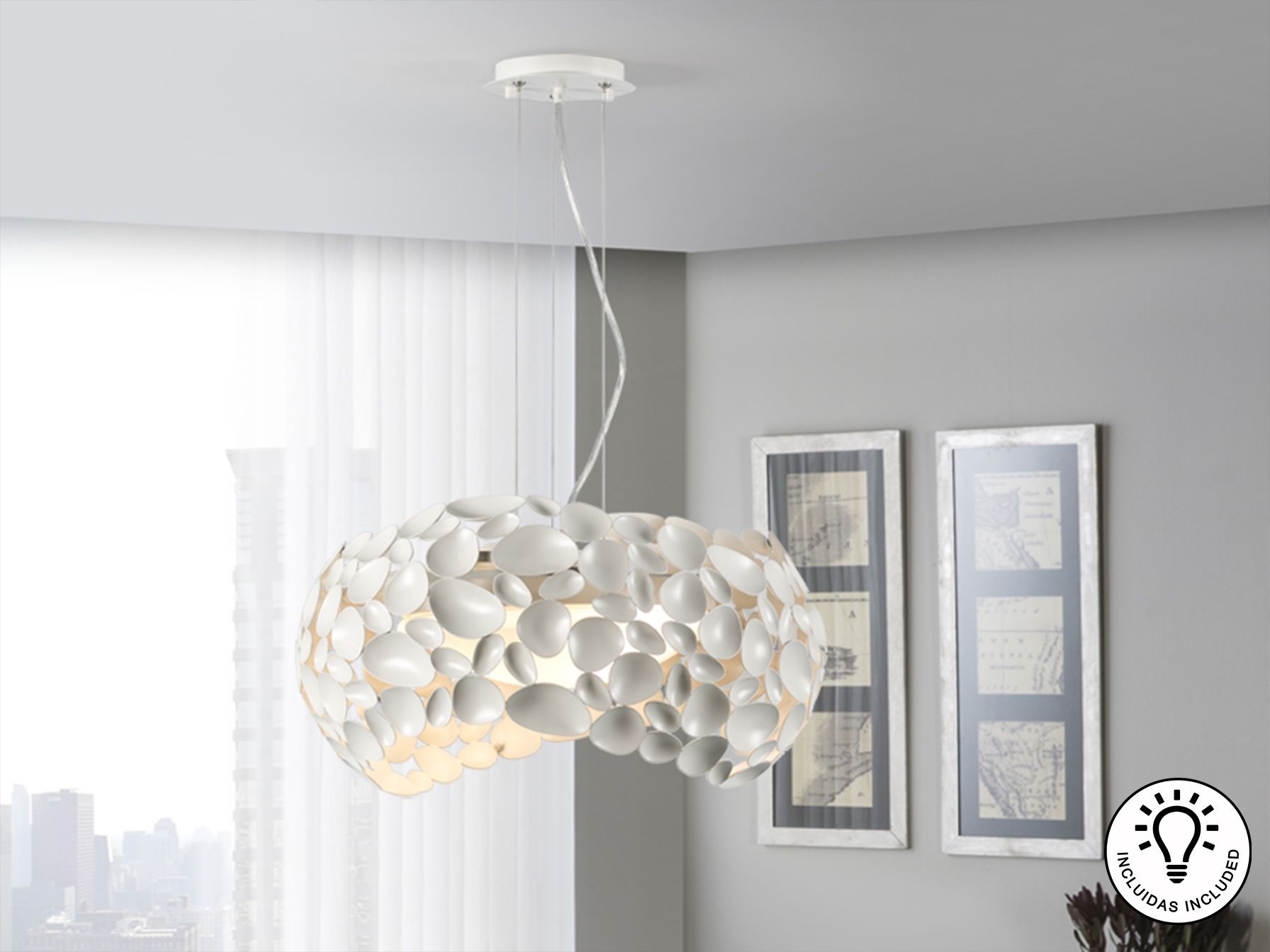 Подвесной светильник с 5 лампами, из металла с матовым белым лаковым покрытием, акриловый рассеиватель внутри, с регулируемой высотой.
