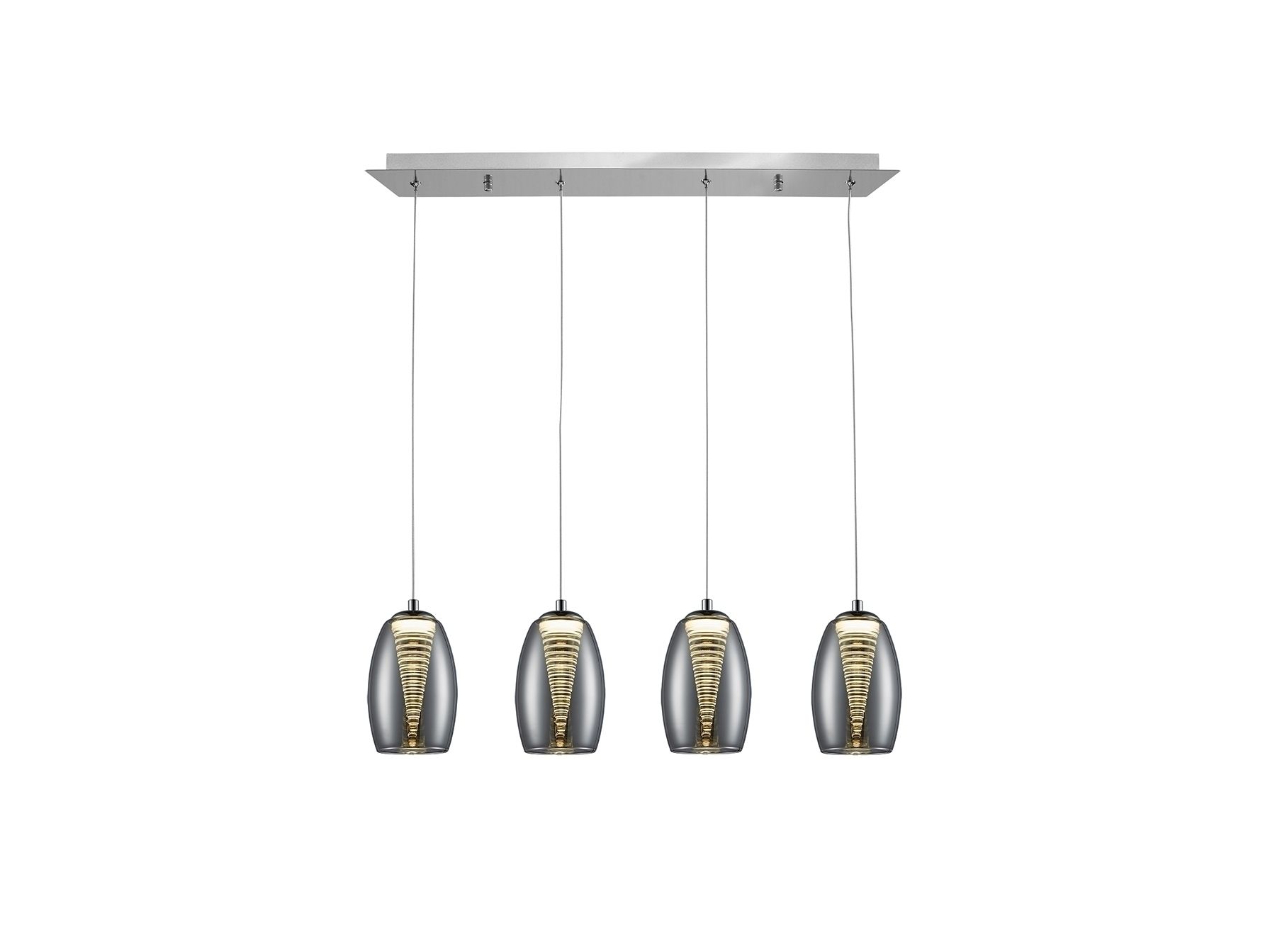 Подвесной светильник с 4 лампами LED, из металла с покрытием "хром". Двойной абажур: внешний - из зеркального стекла, внутренний - из прозрачного поликарбоната в форме конуса, с регулируемой высотой, 4 х 5W LED, 3000 K.