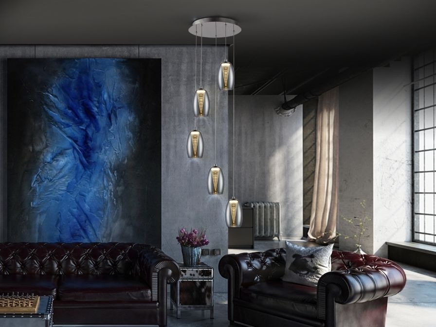 Подвесной светильник с 5 лампами LED, из металла с покрытием "хром". Двойной абажур: внешний - из зеркального стекла, внутренний - из прозрачного поликарбоната в форме конуса, с регулируемой высотой, 5 х 5W LED, 3000 K.