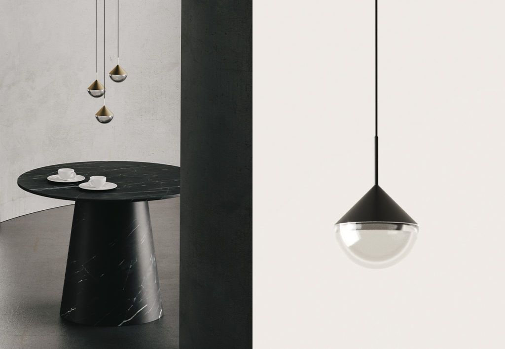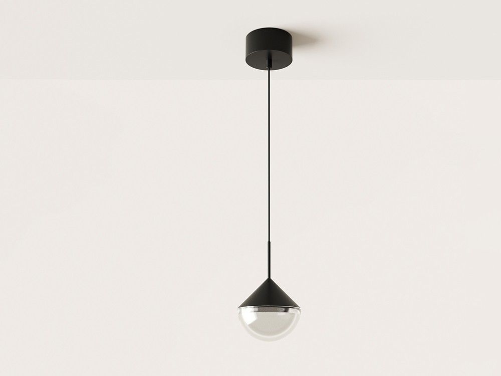 Подвесной светильник с металлическим плафоном в черном матовом или латунном цвете и абажуром из прозрачного оптического стекла. Он включает в себя регулируемую светодиодную пластину мощностью 7 Вт 2700K.