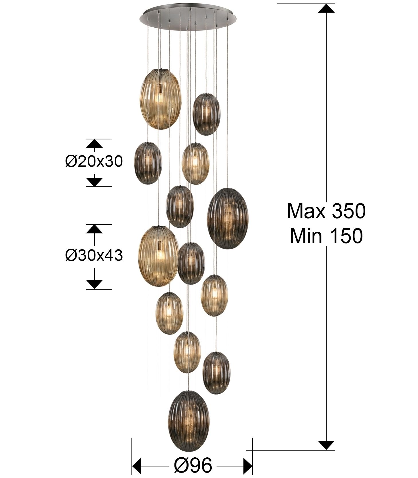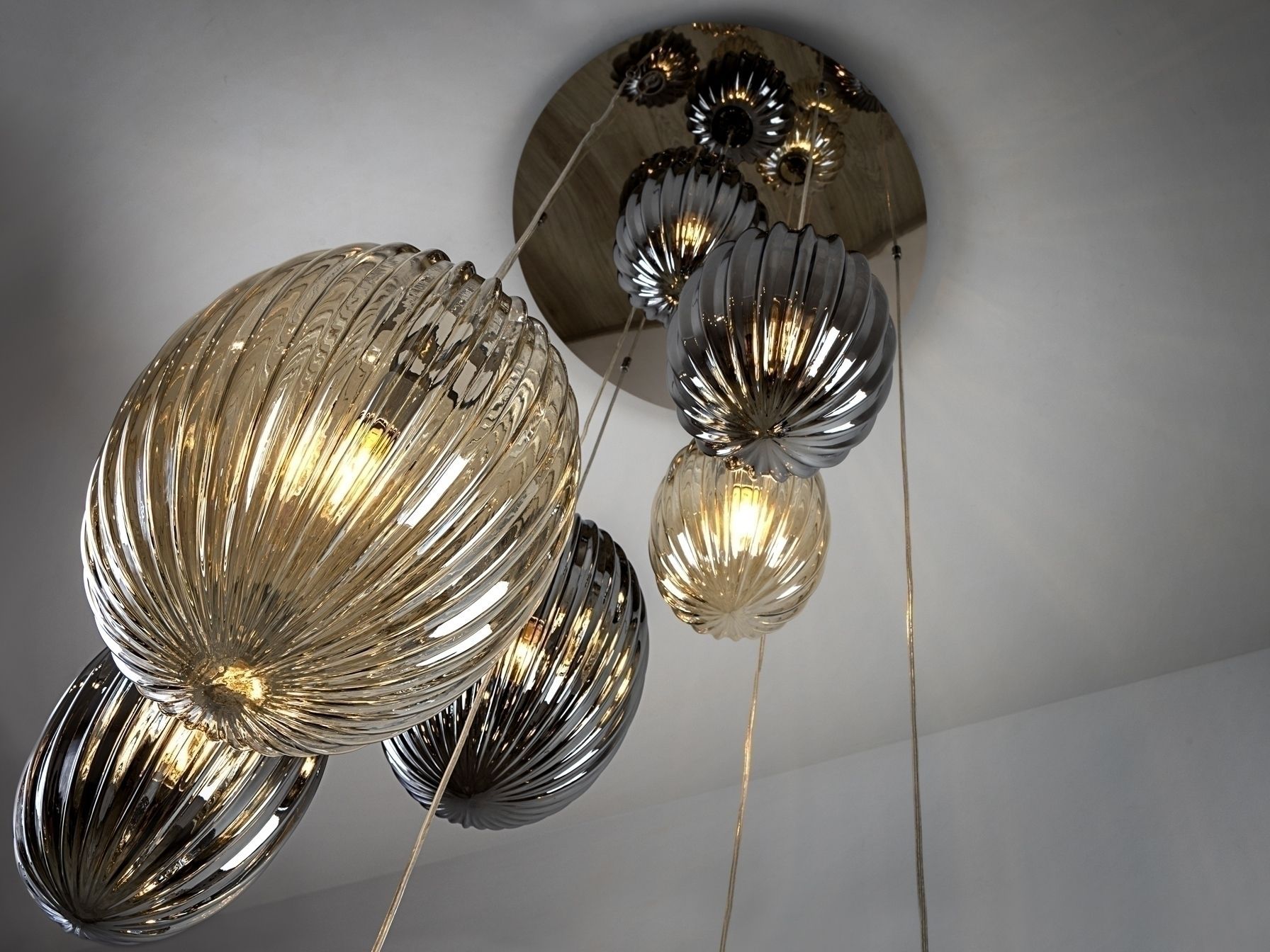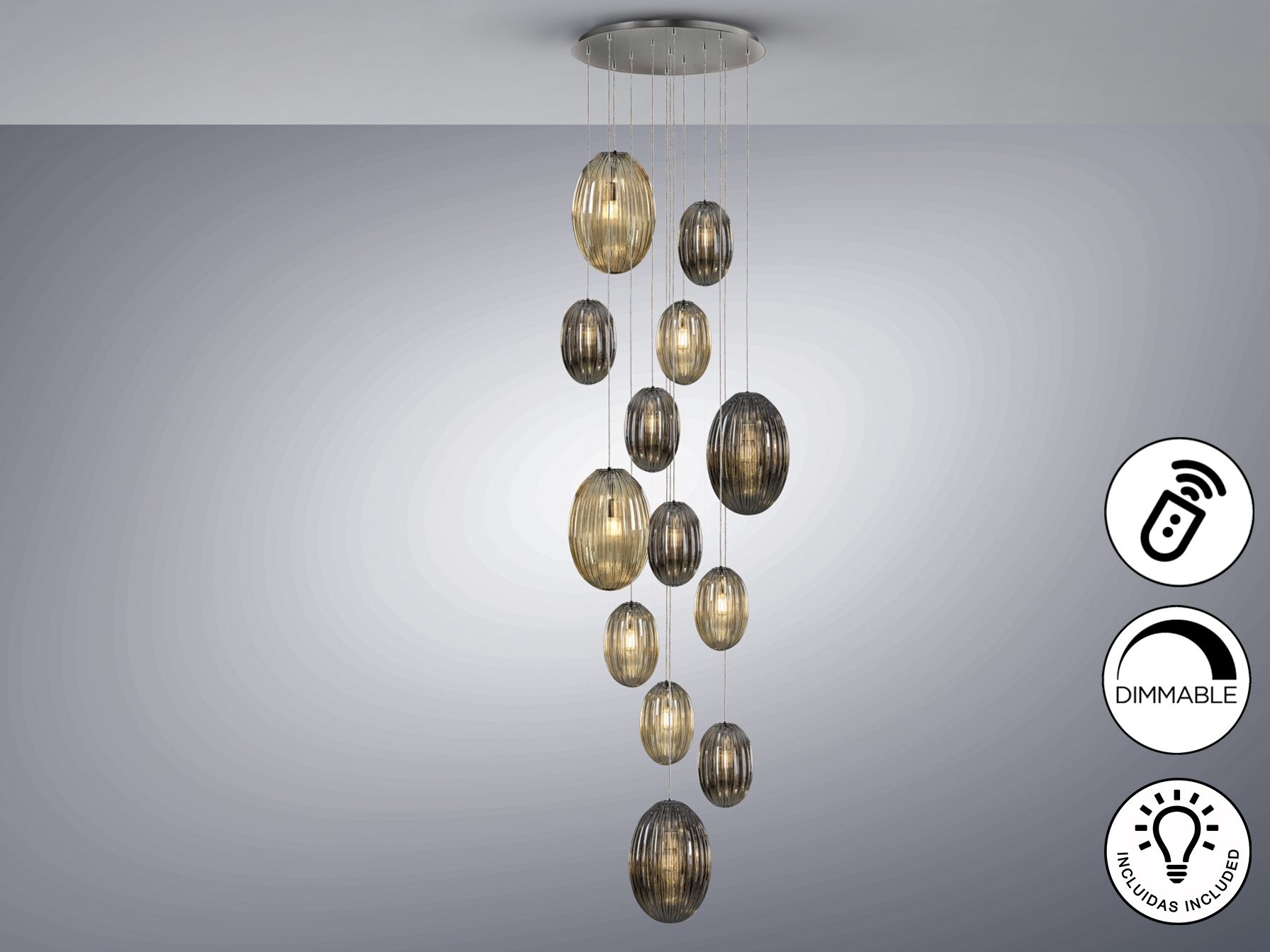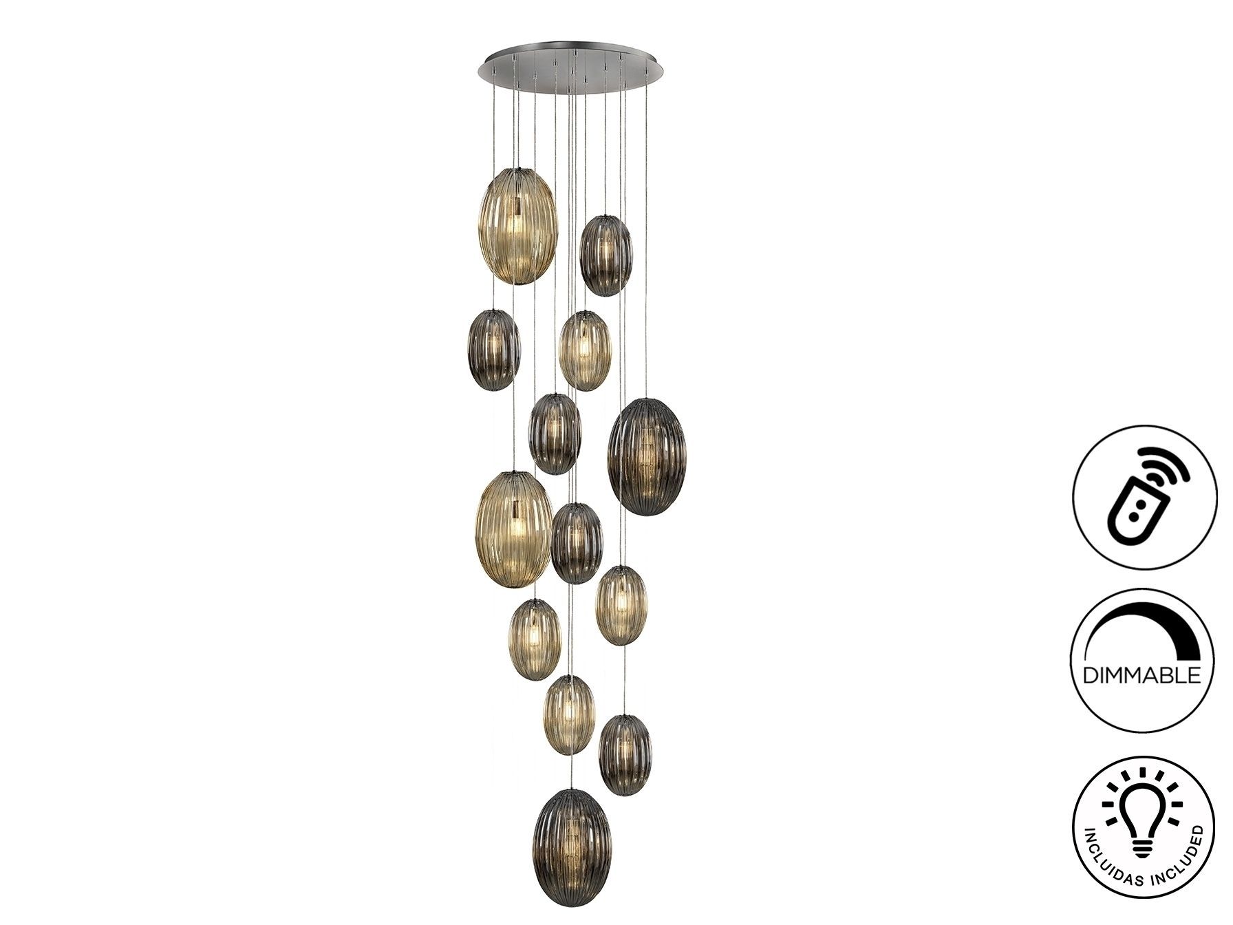Подвесной светильник с 13 лампами, из металла с покрытием "хром". Маленькие и большие плафоны из стекла дымчато-зеркального цвета и янтарного цвета. С регулируемой высотой. Диммируемый. В комплекте с пультом ДУ.
