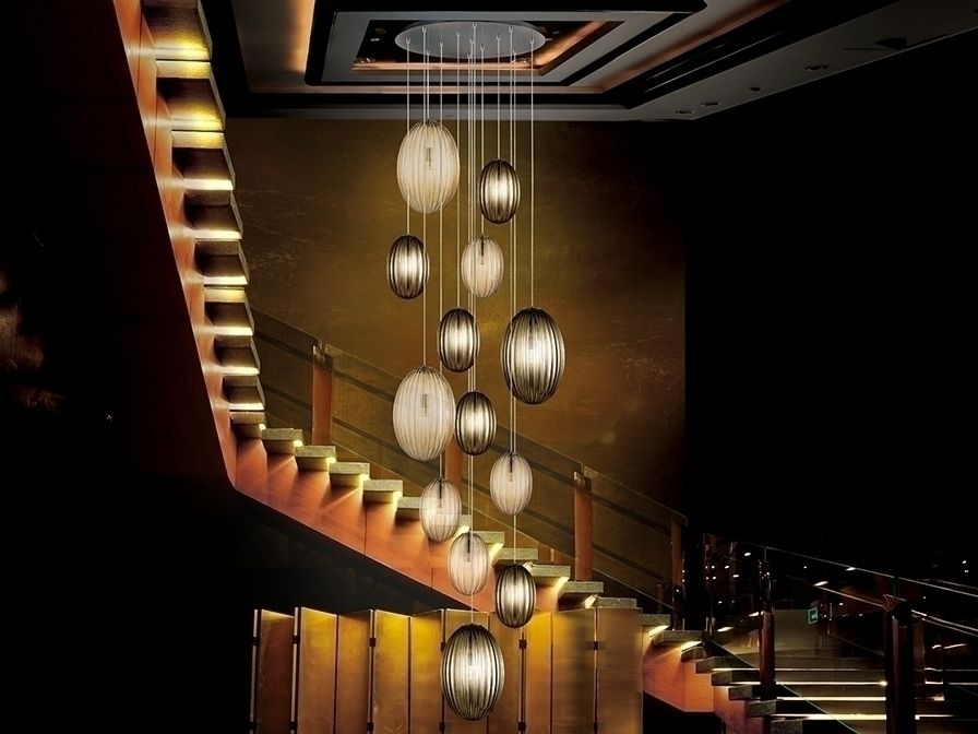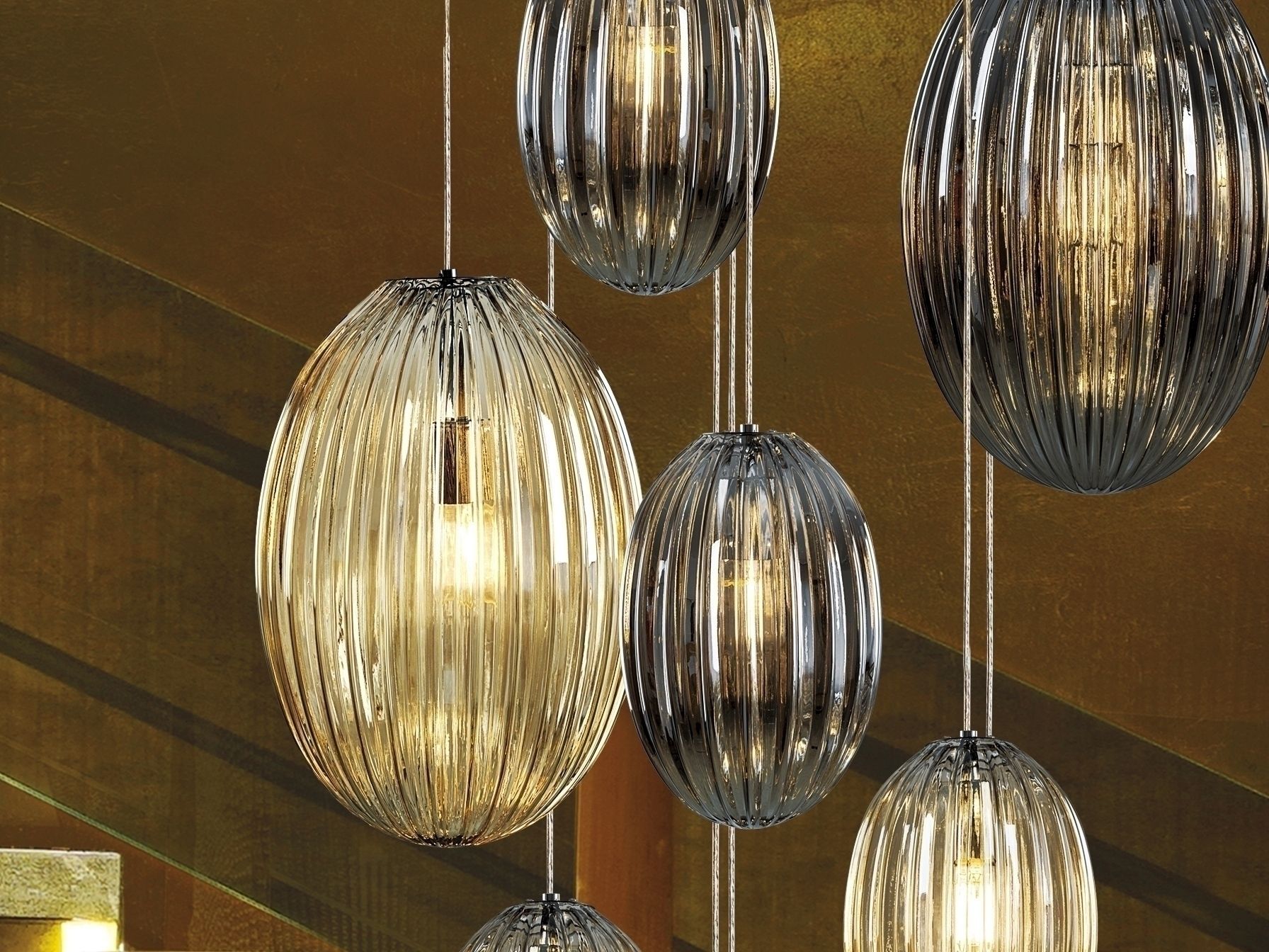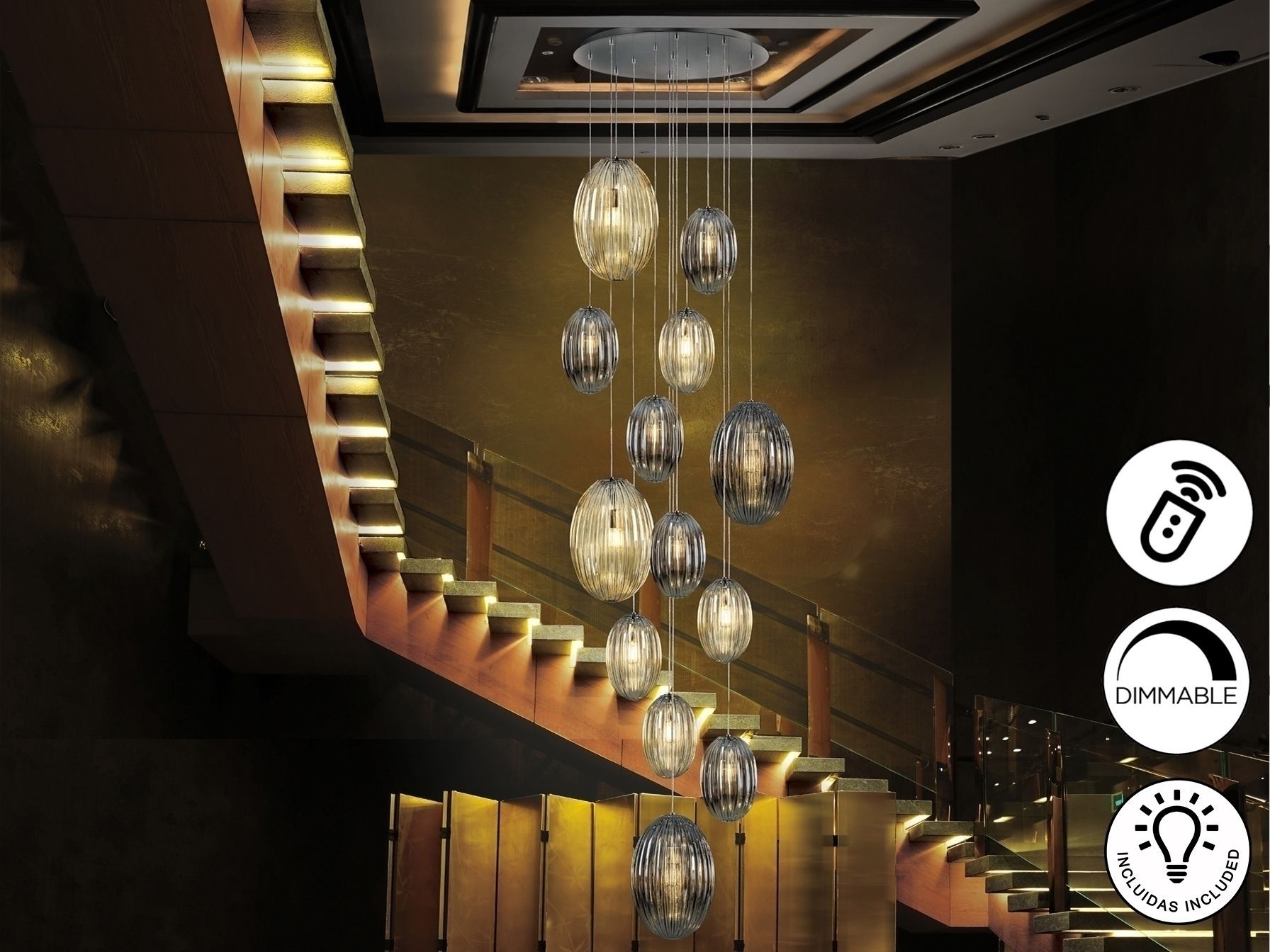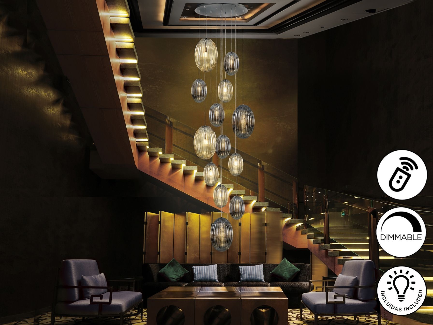 Подвесной светильник с 13 лампами, из металла с покрытием "хром". Маленькие и большие плафоны из стекла дымчато-зеркального цвета и янтарного цвета. С регулируемой высотой. Диммируемый. В комплекте с пультом ДУ.