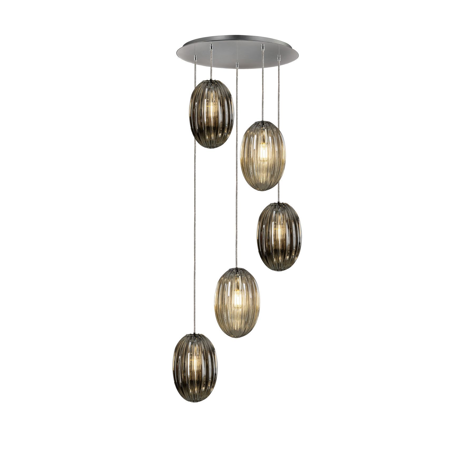 Подвесной светильник с 5 лампами, из металла с покрытием "хром". Маленькие плафоны 2 тонов: из стекла дымчато-зеркального цвета и янтарного цвета. С регулируемой высотой.
