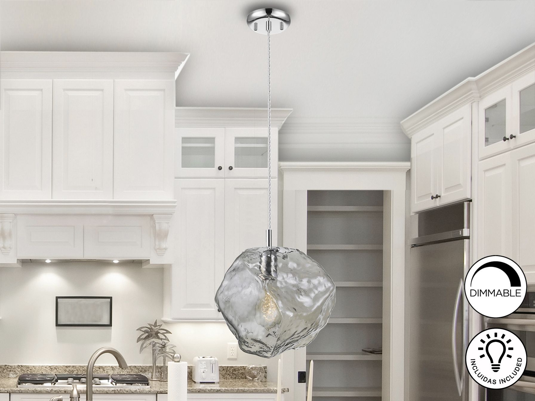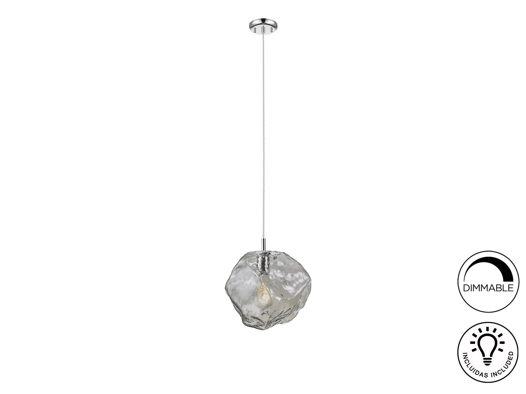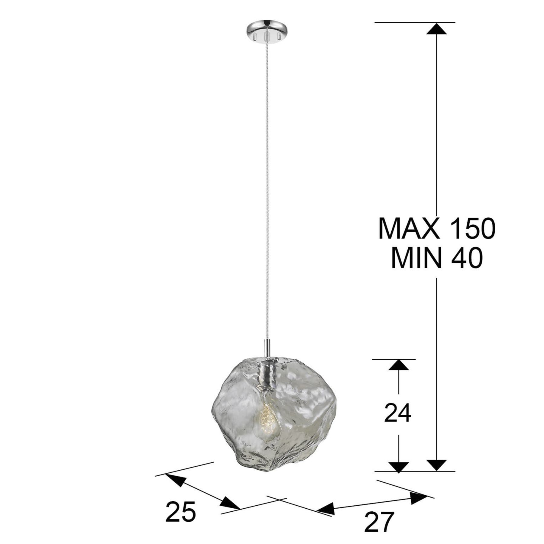 Подвесной светильник с 1 лампой, из металла с покрытием "хром". Большой плафон из стекла светло-дымчатого цвета. С регулируемой высотой.