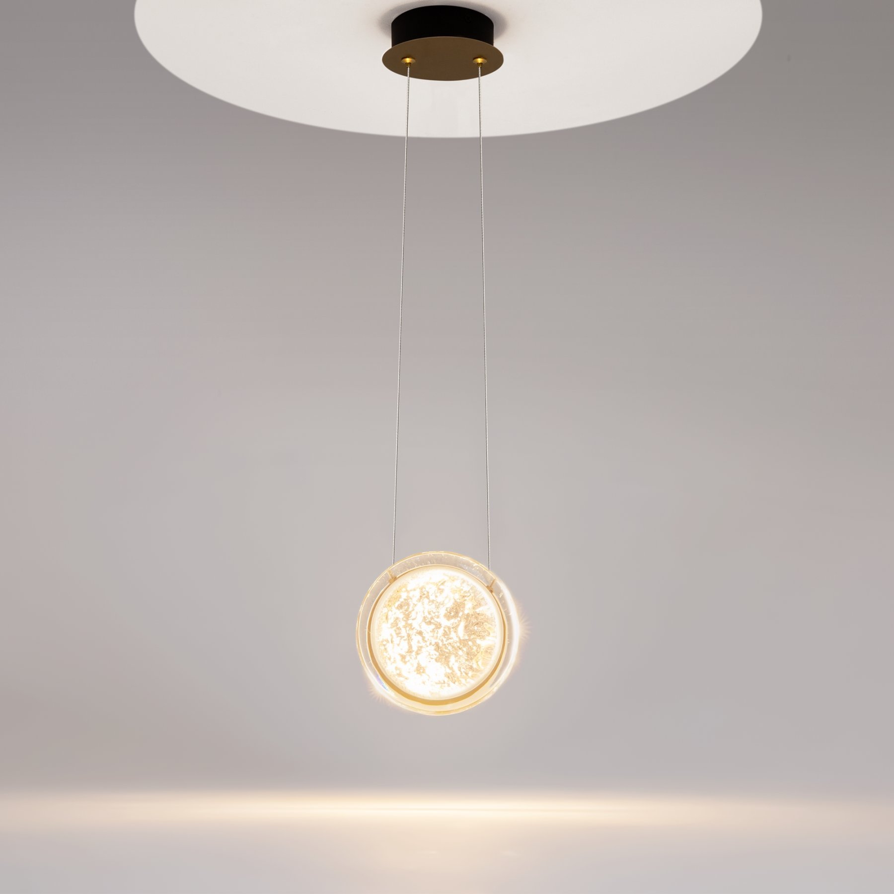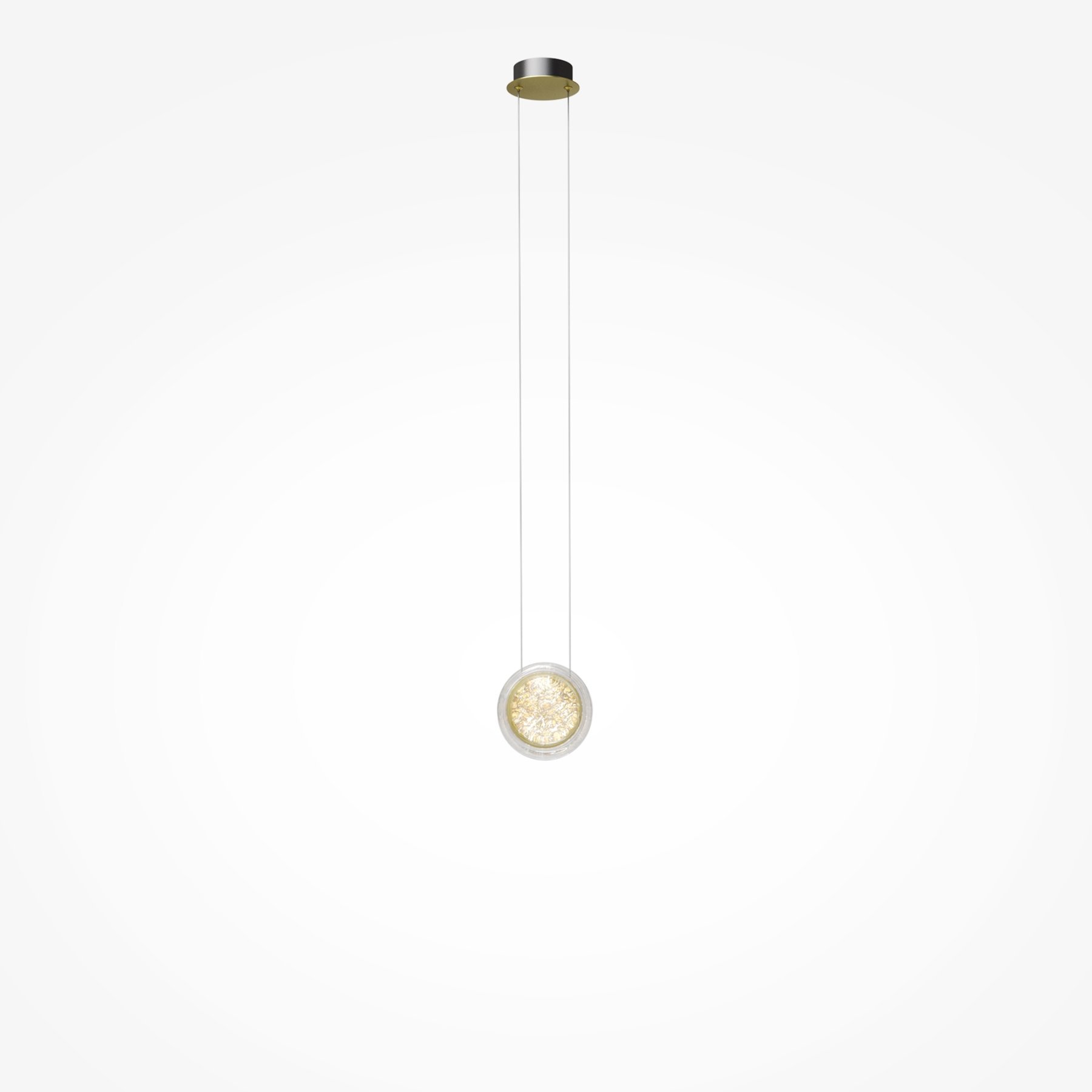 Арматура из металла цвета латунь с сатинированным финишным покрытием сочетается с прозрачными плафонами. Подвесные одинарные, горизонтальный и каскадные светильники оснащаются LED-модулем с двумя плоскими плафонами из акрила со сложным, актуальным паттерном на поверхности. Цветовая температура — 3000К, угол рассеивания — 125 градусов.