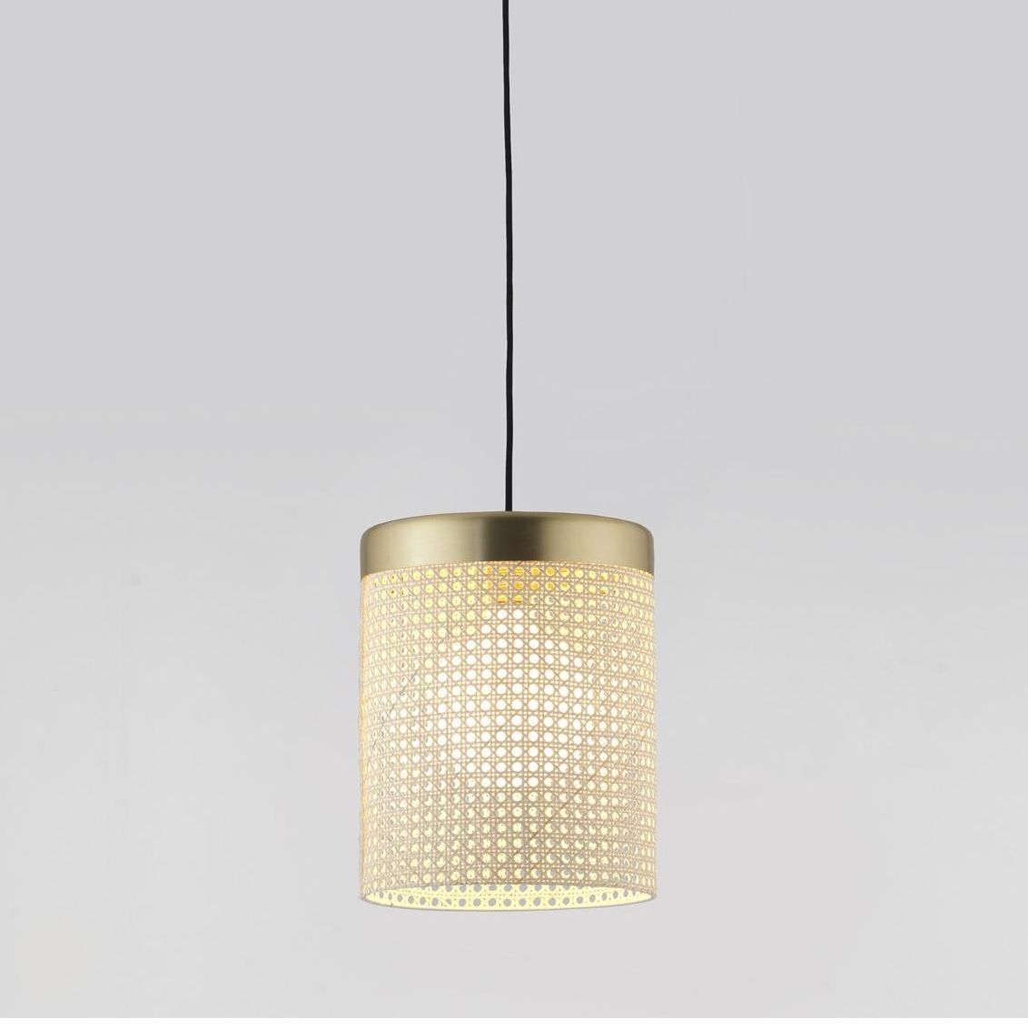 Подвесной светильник, изготовленный из стали и натурального или черного ротанга, и представленный в двух цветах — черном и матовом латунном.