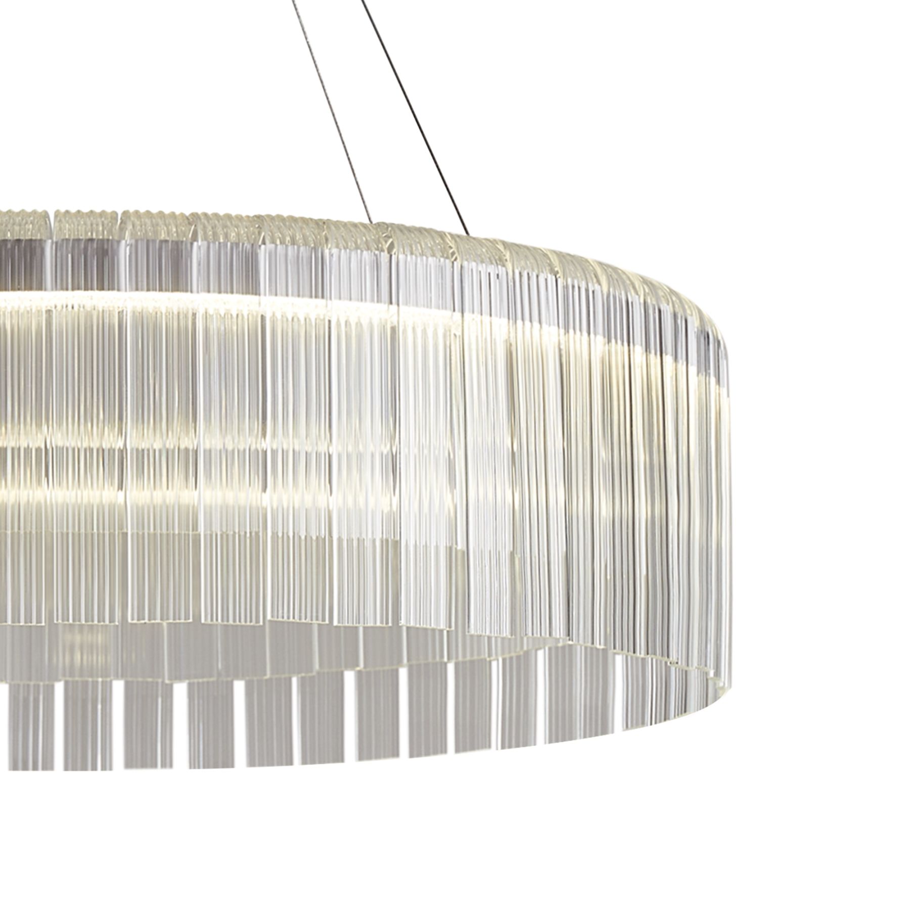 Материал арматуры — металл, выполненный в белом цвете. Подвесной светильник оснащен LED-источником света с цветовой температурой 2700К, который растекается по рельефным, стеклянным декоративным элементам плафона.  Подходит для современных светлых интерьеров.