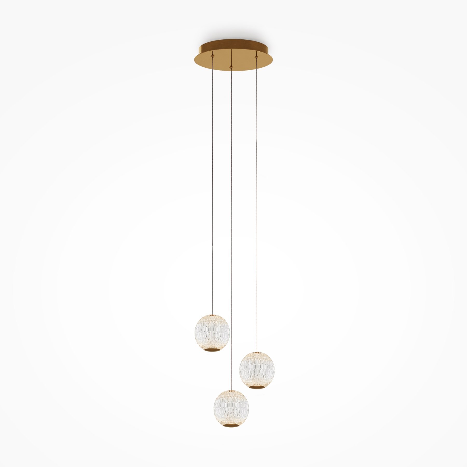 Цвет арматуры — латунь, плафоны из прозрачного акрила. Подвесной светильник с прочными и легкими плафонами из акрилового стекла снаб жен встроенным LED-источником света. LED-модуль дает теплый свет с цветовой температурой 3000К. Длина провода — 3 метра, ее можно регулировать для установки в помещении с высокими потолками.