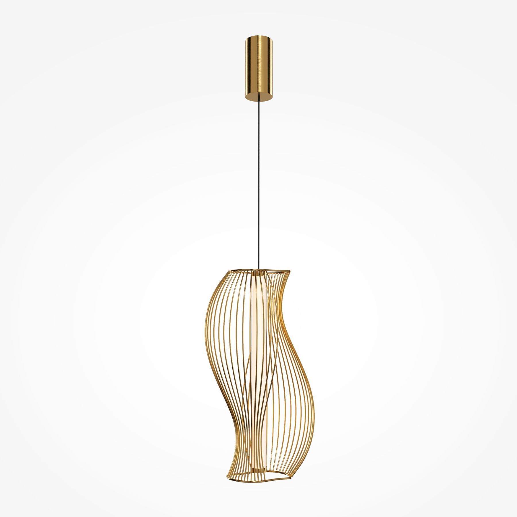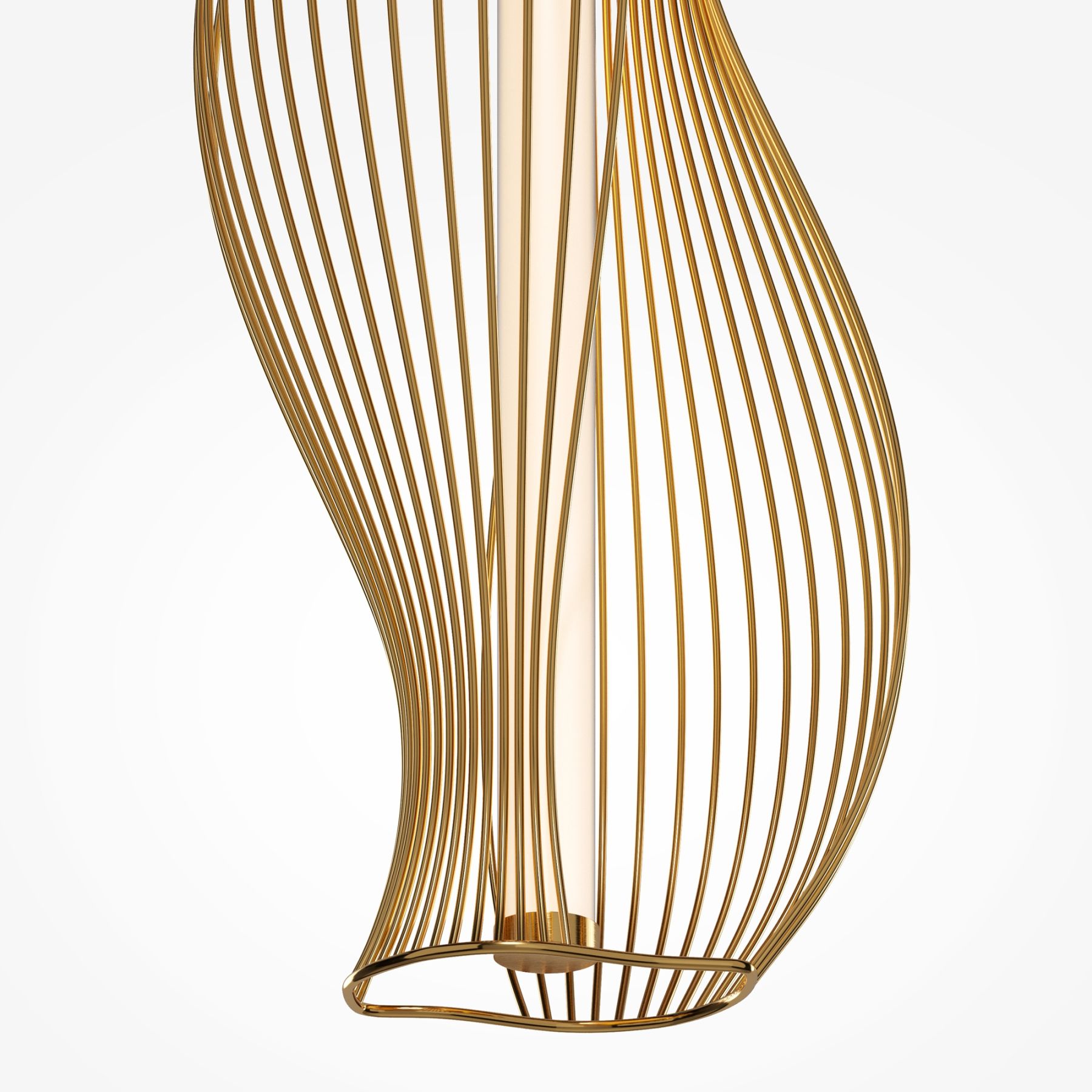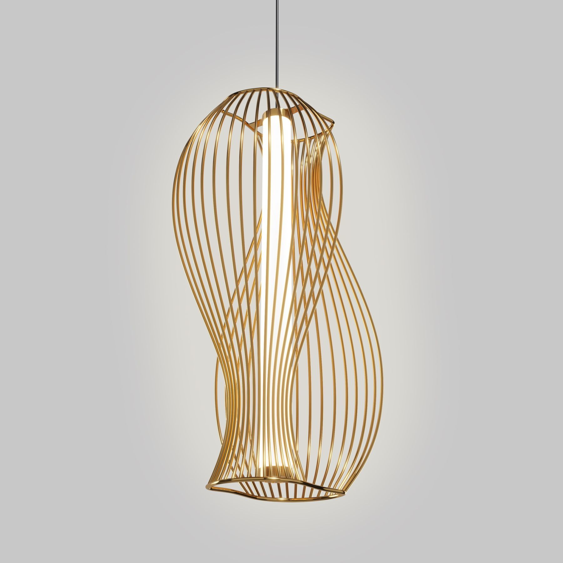 Два цветовых решения: черный и латунь. Абажуры из проволоки в асимметричном исполнении. Оригинальный дизайн, вдохновленный силуэтами античных амфор. Центральный LED-источник света с матовым рассеивателем. Регулируемая высота подвеса и провод длиной 3 метра. Возможность создания композиций.