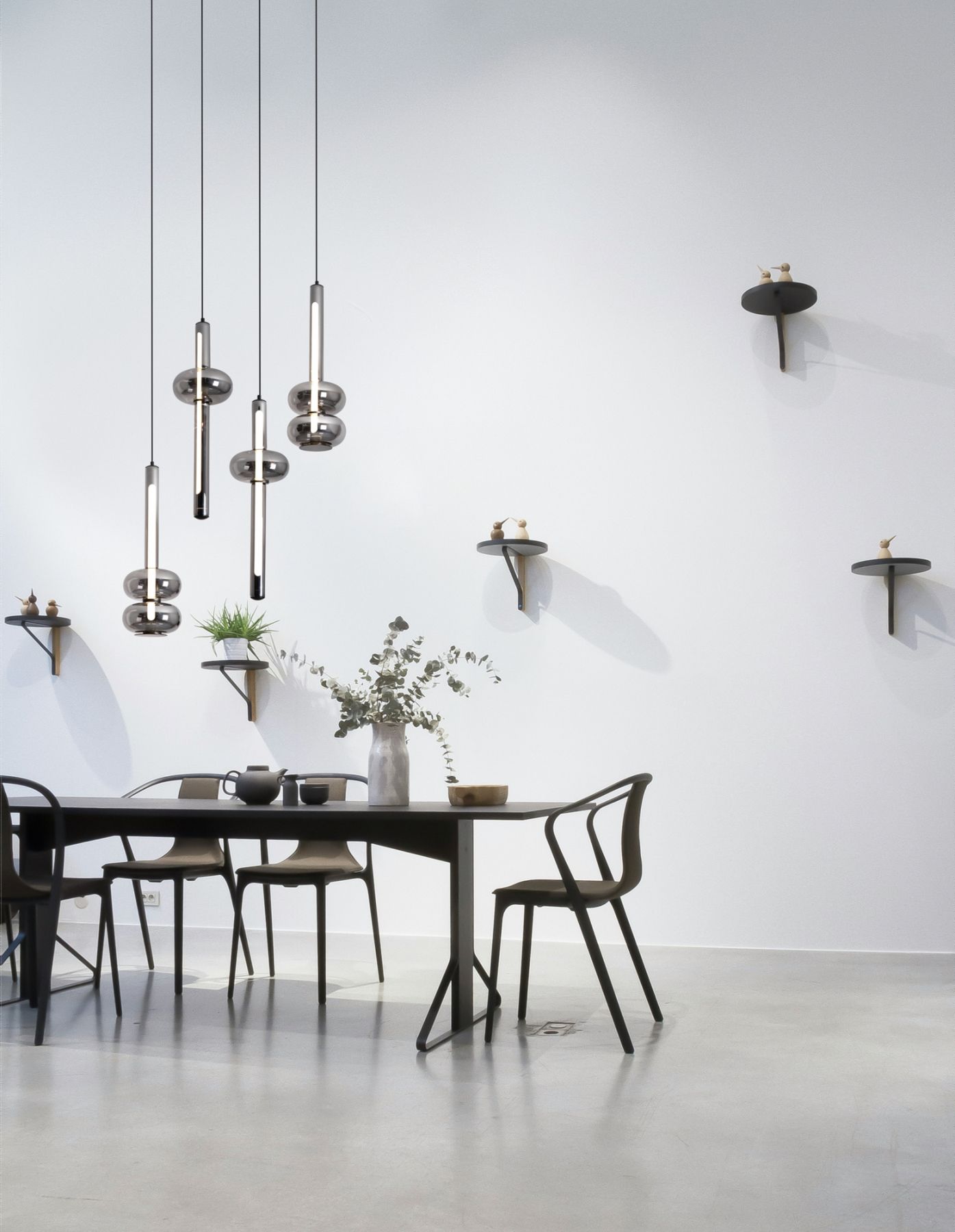 Серия Swim представлена двумя подвесными светильниками разных форм. LED источник света скрыт внутри стеклянного плафона. Арматура -металл чёрного цвета. Плафоны из стекла дымчато-серого цвета с гальваническим покрытием и Led трубкой внутри стекла. Серия раскрывает свой потенциал при комплексной развеске, следуя трендовому направлению в дизайне использовать разные формы. Создает мягкое, атмосферное освещение, подходящее для технологичных интерьеров.