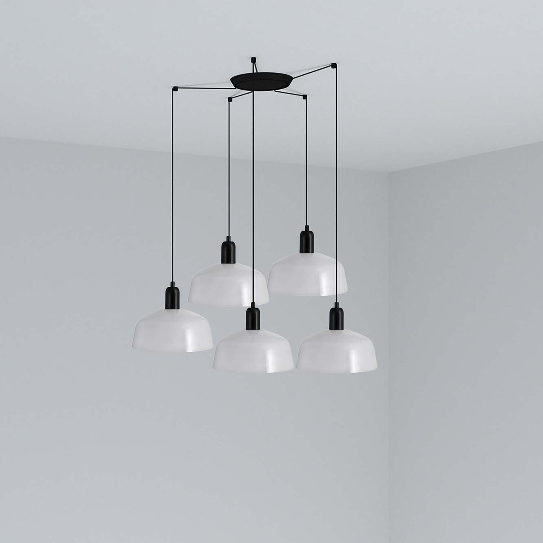 TATAWIN — это серия светильников, разработанная Адольфо Абейоном. Форма абажура напоминает верхнюю часть характерных домов Татауина, города, расположенного на юго-востоке Туниса. Этот подвесной светильник с черной конструкцией состоит из белого металлического абажура, который обеспечивает направленный свет.