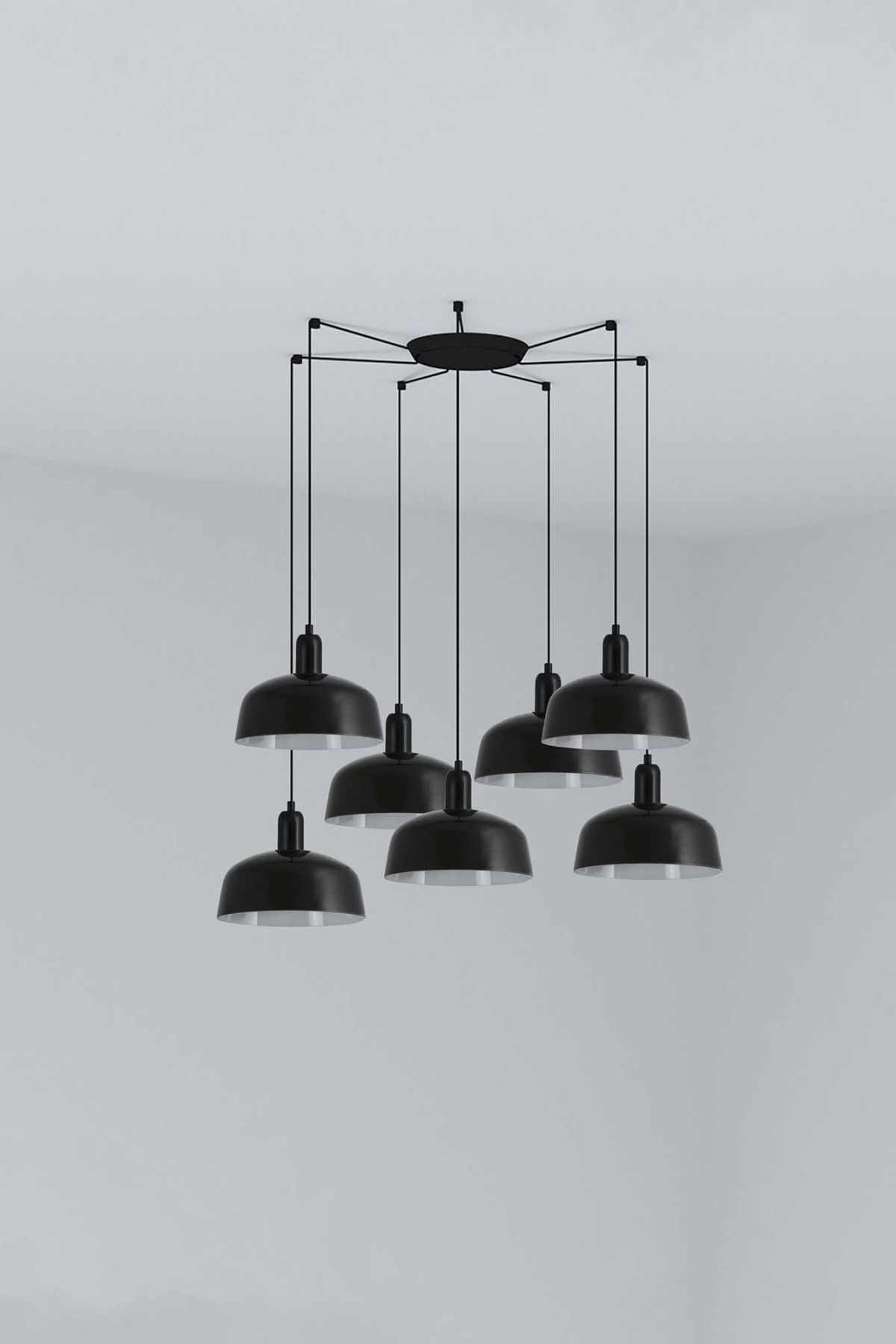 TATAWIN M — это семейство светильников, разработанное Адольфо Абейоном. Форма тени напоминает верхнюю часть характерных домов Татауина, города на юго-востоке Туниса. Он идеален для создания композиций из одной точки света как в контрактных помещениях, так и дома. Версия с абажуром из черного глянцевого стекла и несколькими потолочными розетками на 7 ламп.