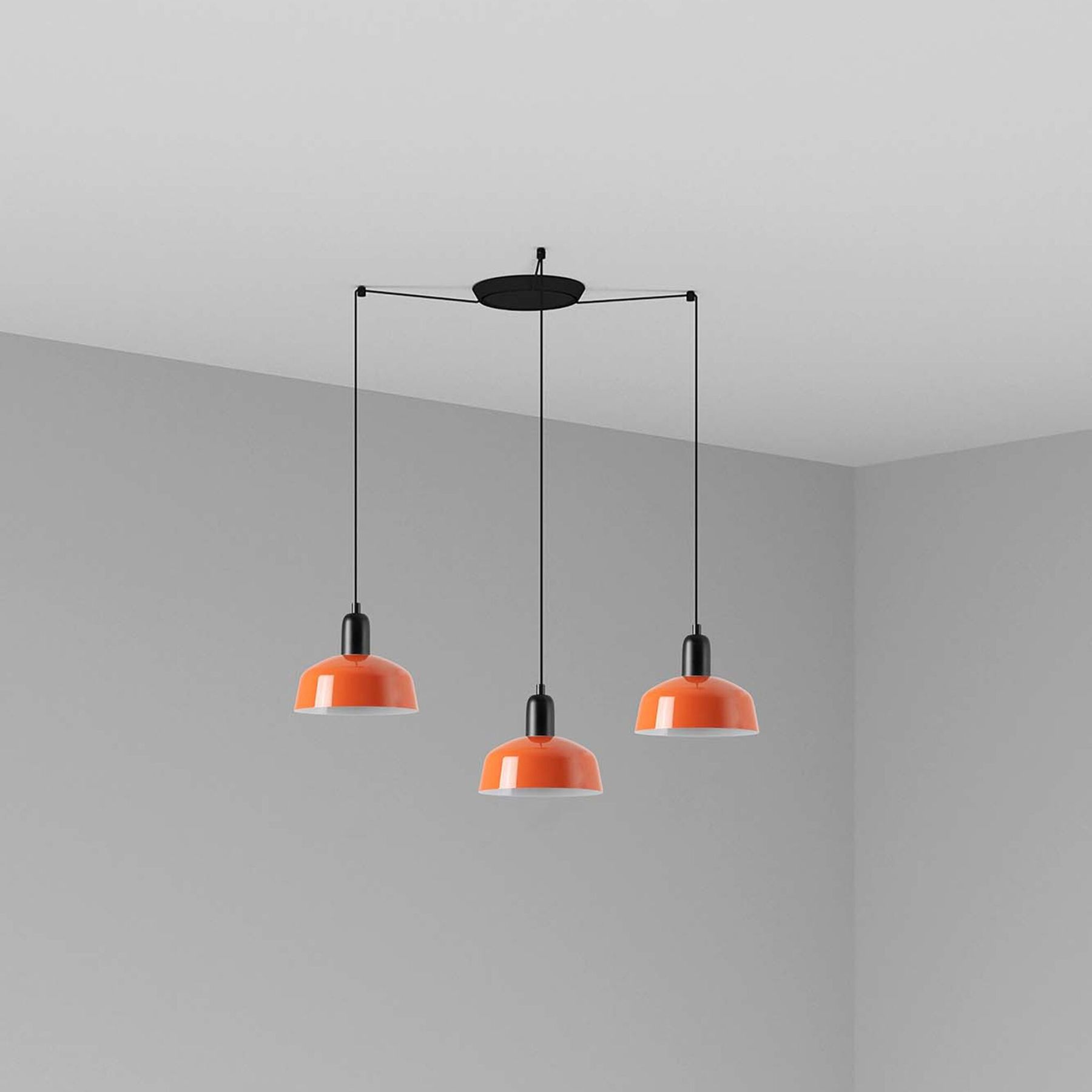 TATAWIN — это серия светильников, разработанная Адольфо Абейоном. Форма абажура напоминает верхнюю часть характерных домов Татауина, города, расположенного на юго-востоке Туниса. Этот подвесной светильник с черной конструкцией имеет красновато-оранжевый металлический абажур, который обеспечивает направленный свет.