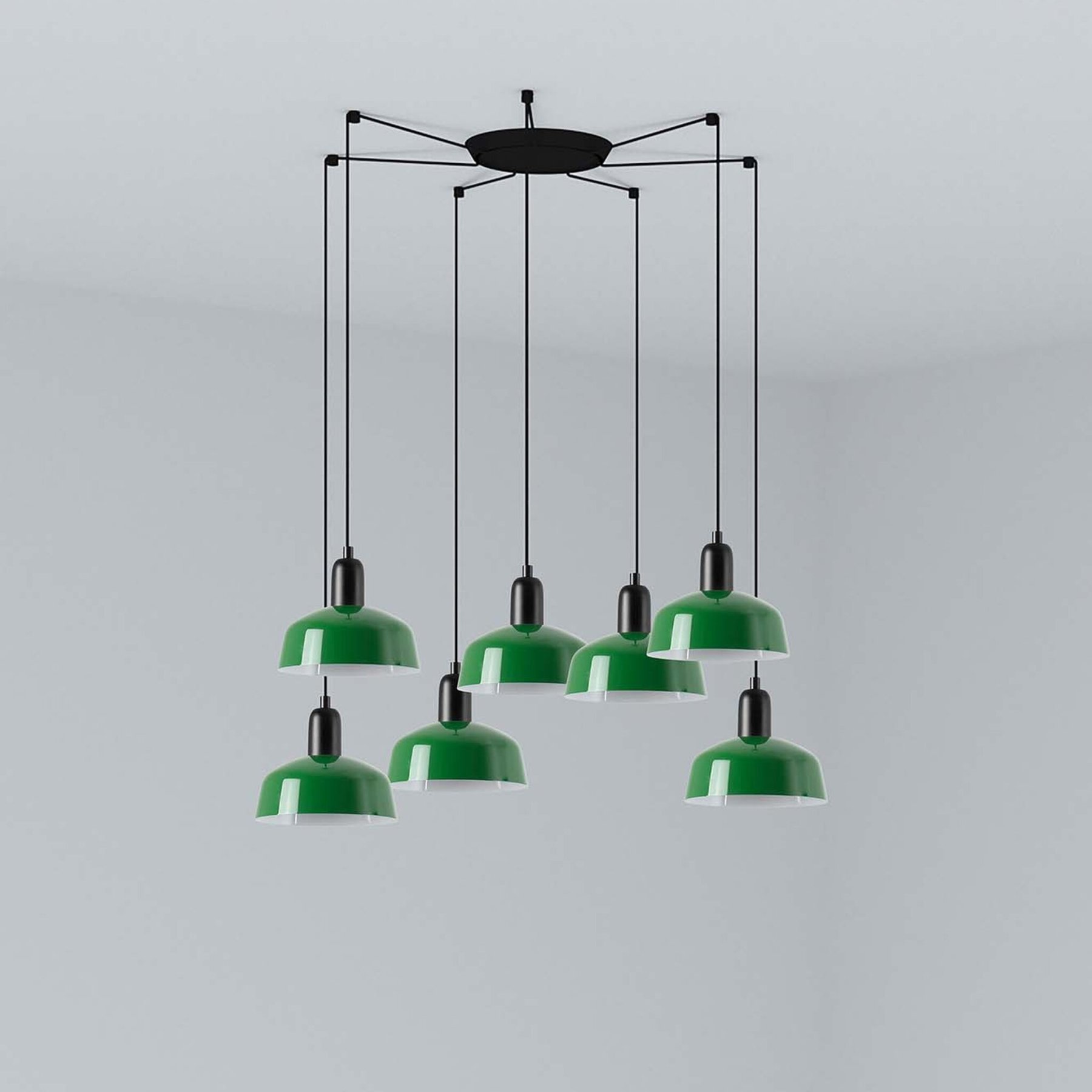 TATAWIN — это серия светильников, разработанная Адольфо Абейоном. Форма абажура напоминает верхнюю часть характерных домов Татауина, города, расположенного на юго-востоке Туниса. Этот подвесной светильник с черной конструкцией состоит из зеленого металлического абажура, который обеспечивает направленный свет.