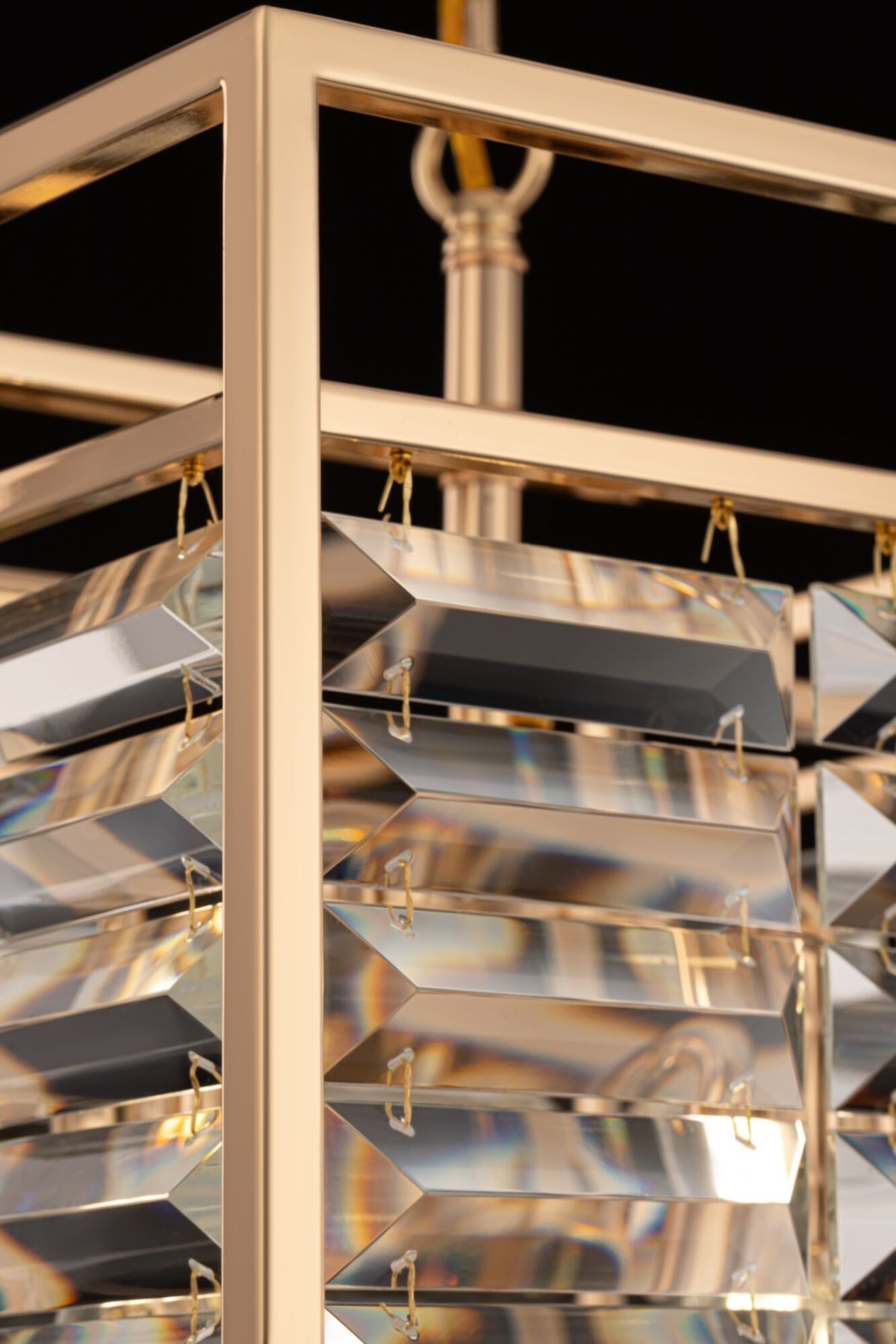 Арматура – металл, оттенки – хром, золото. Двойной геометрический плафон. Металлический каркас плафона окрашен в тон арматуре. Декор – стеклянные кри сталлы с трапециевидной огранкой. Высота подвесных моделей регулируется.