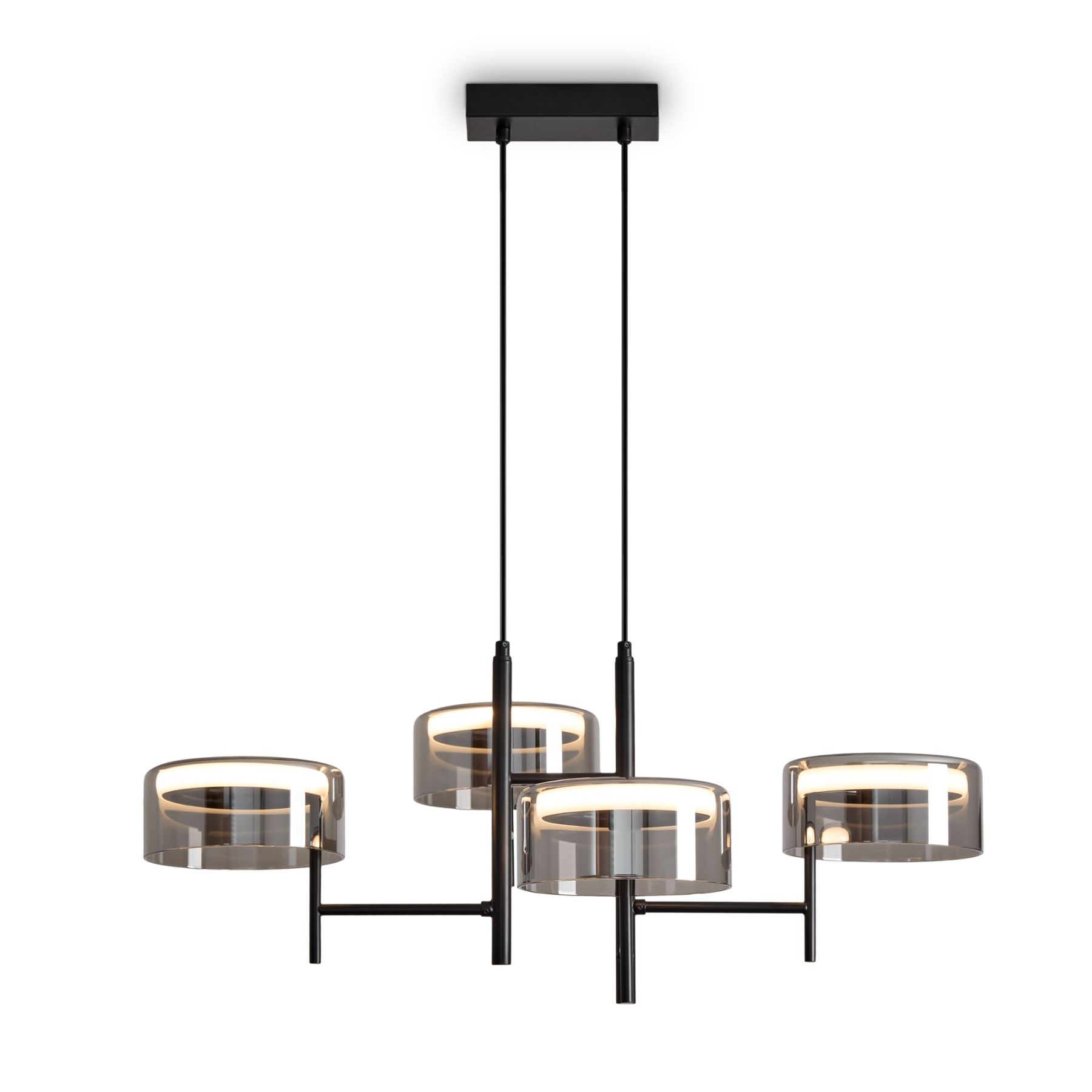 Материал арматуры — металл, цвет — черный. Плафоны выполнены из стекла дымчатого цвета. Светильники представлены в подвесном и напольном исполнении и оснащены LED-источником света с цветовой температурой 3000К. Сочетание металла и затемненного стекла создает выразительную атмосферу в современных интерьерах таких как минимализм и лофт.