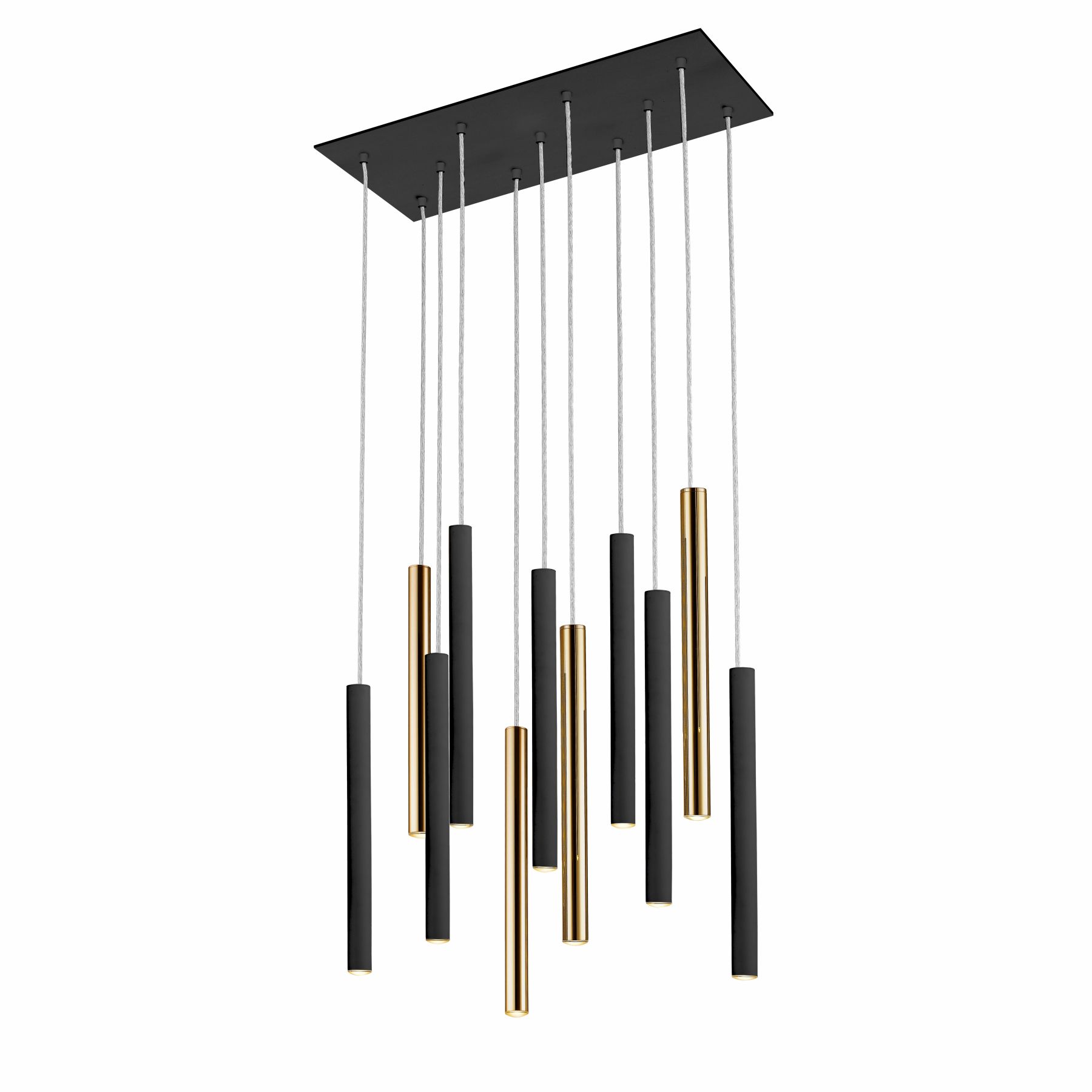 Подвесной светильник LED с 11 лампами из металла с покрытием "блестящее золото" и матовым чёрным покрытием. Акриловый рассеиватель опaлового цвета. 55W LED, 4950 Lm, 3000 K. ДИММИРУЕМЫЙ.
