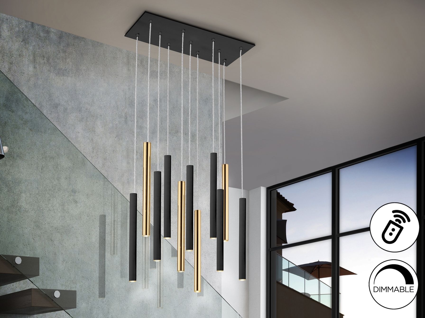 Подвесной светильник LED с 11 лампами из металла с покрытием "блестящее золото" и матовым чёрным покрытием. Акриловый рассеиватель опaлового цвета. 55W LED, 4950 Lm, 3000 K. ДИММИРУЕМЫЙ.