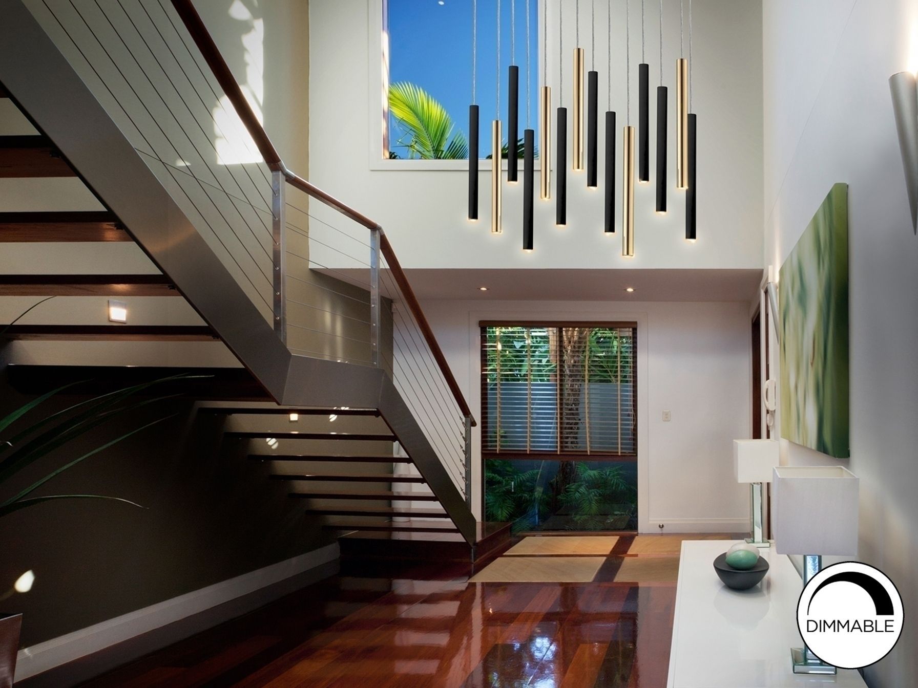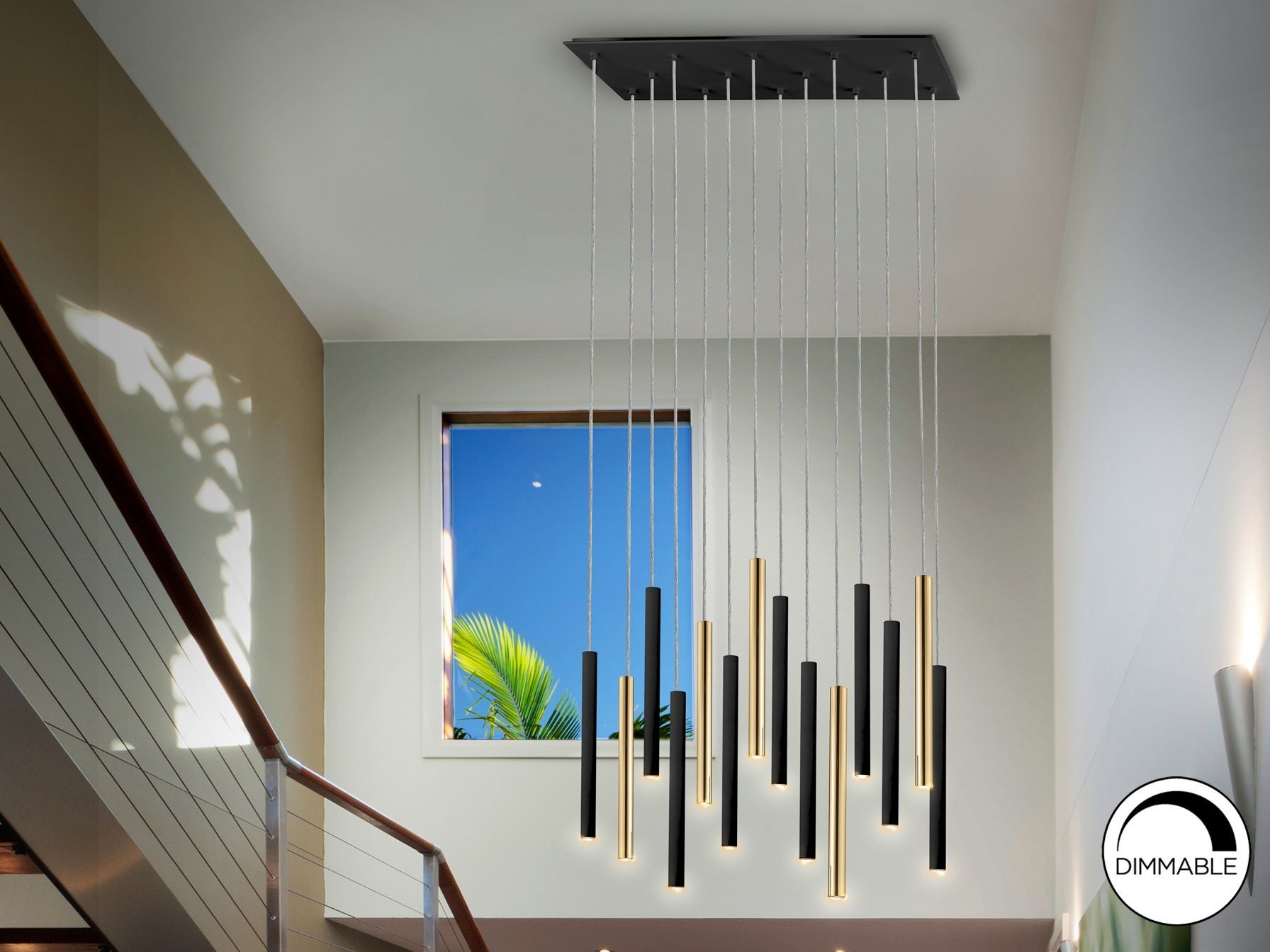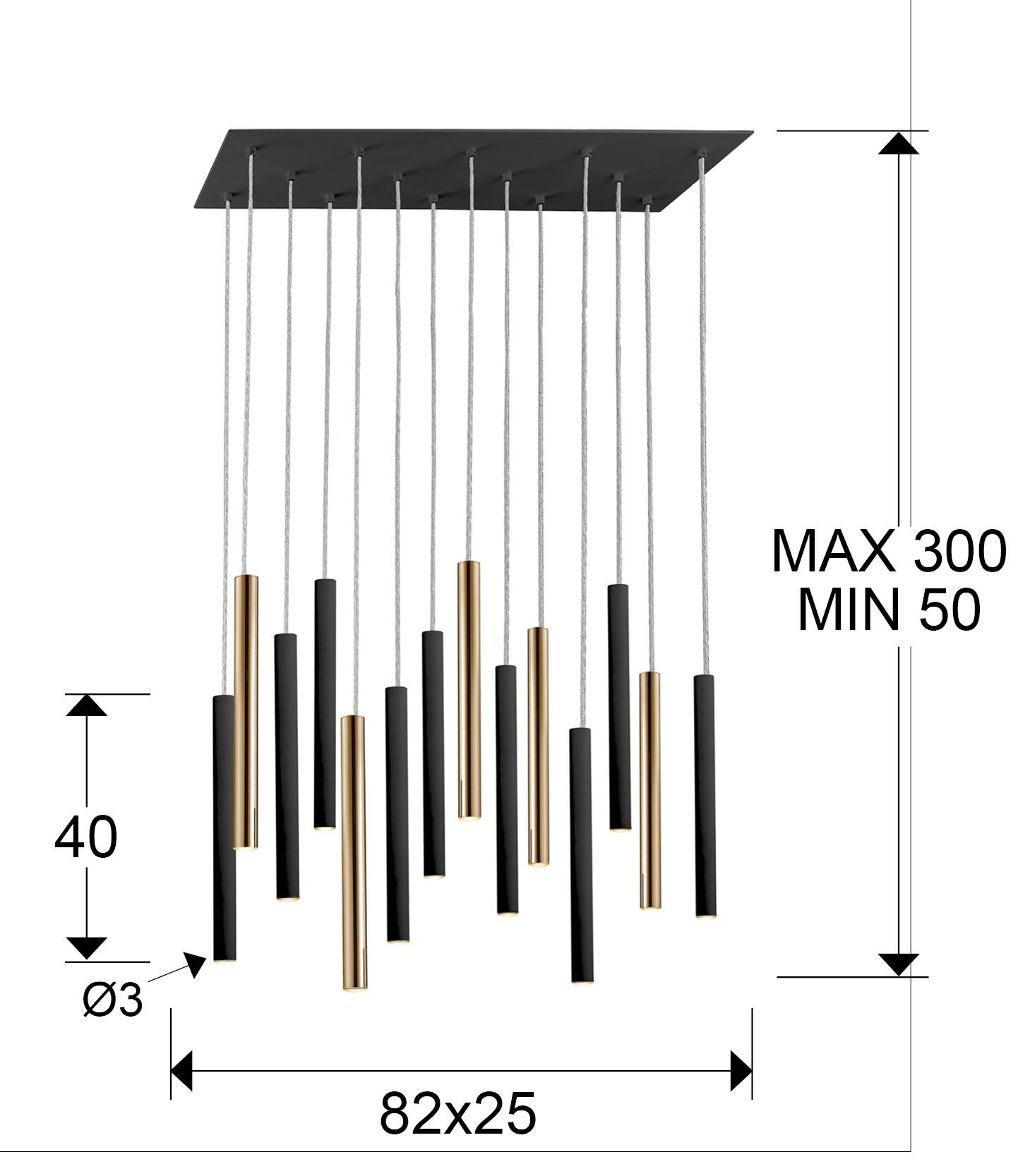 Лампа с 14 светодиодами. Изготовлен из металла с золотой и черной матовой отделкой. Рассеиватель из опалового акрила. Светодиод мощностью 70 Вт, 6300 лм, 3000 К. Максимальная высота 300 см. Диммируемый..