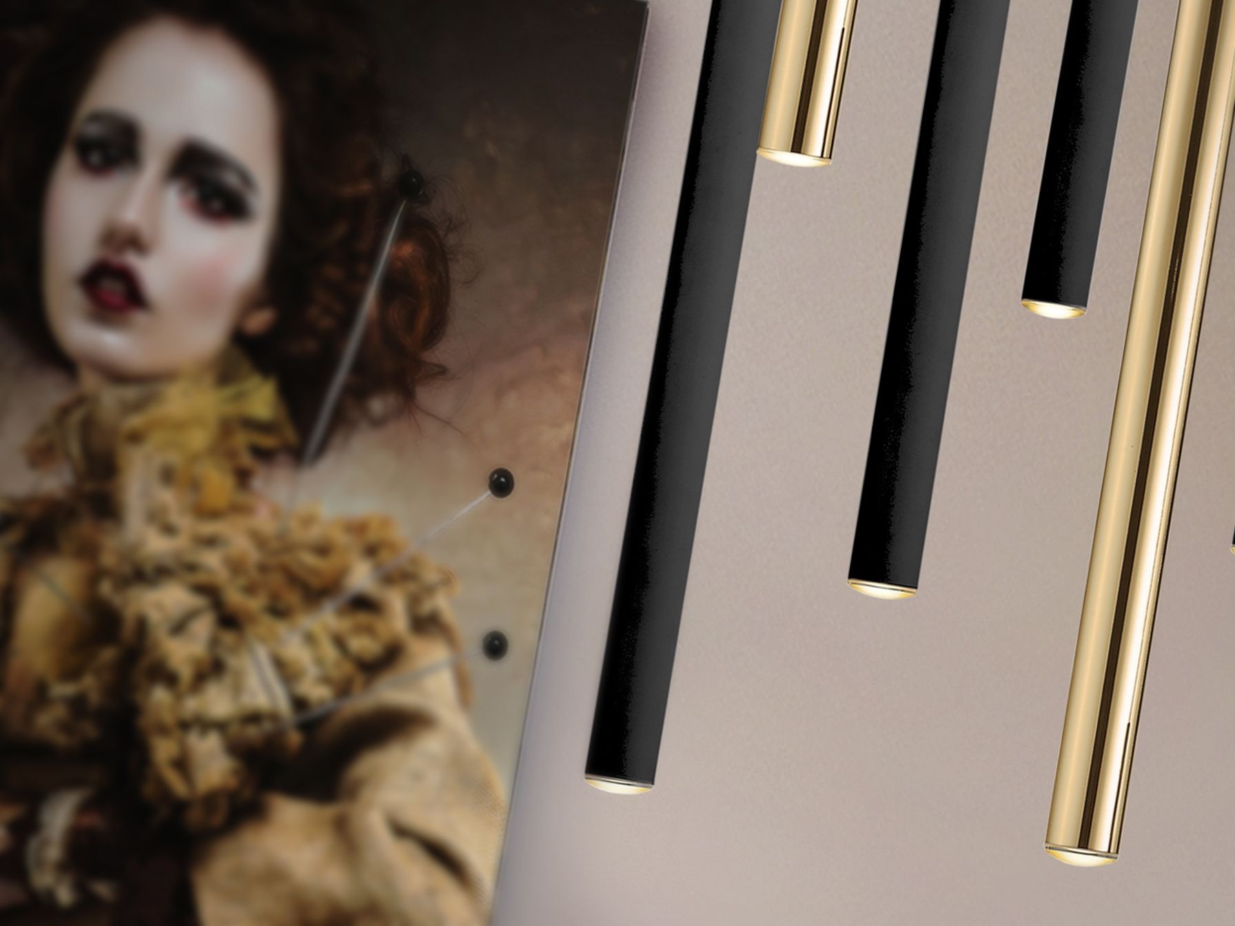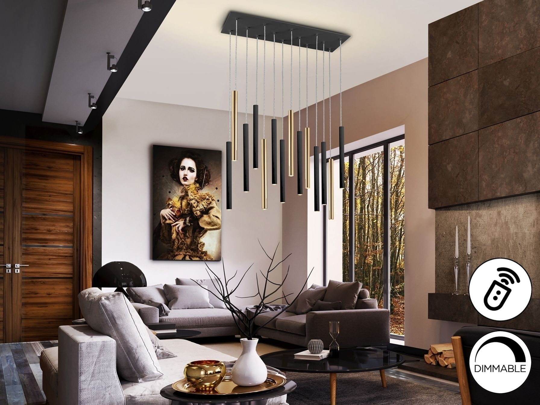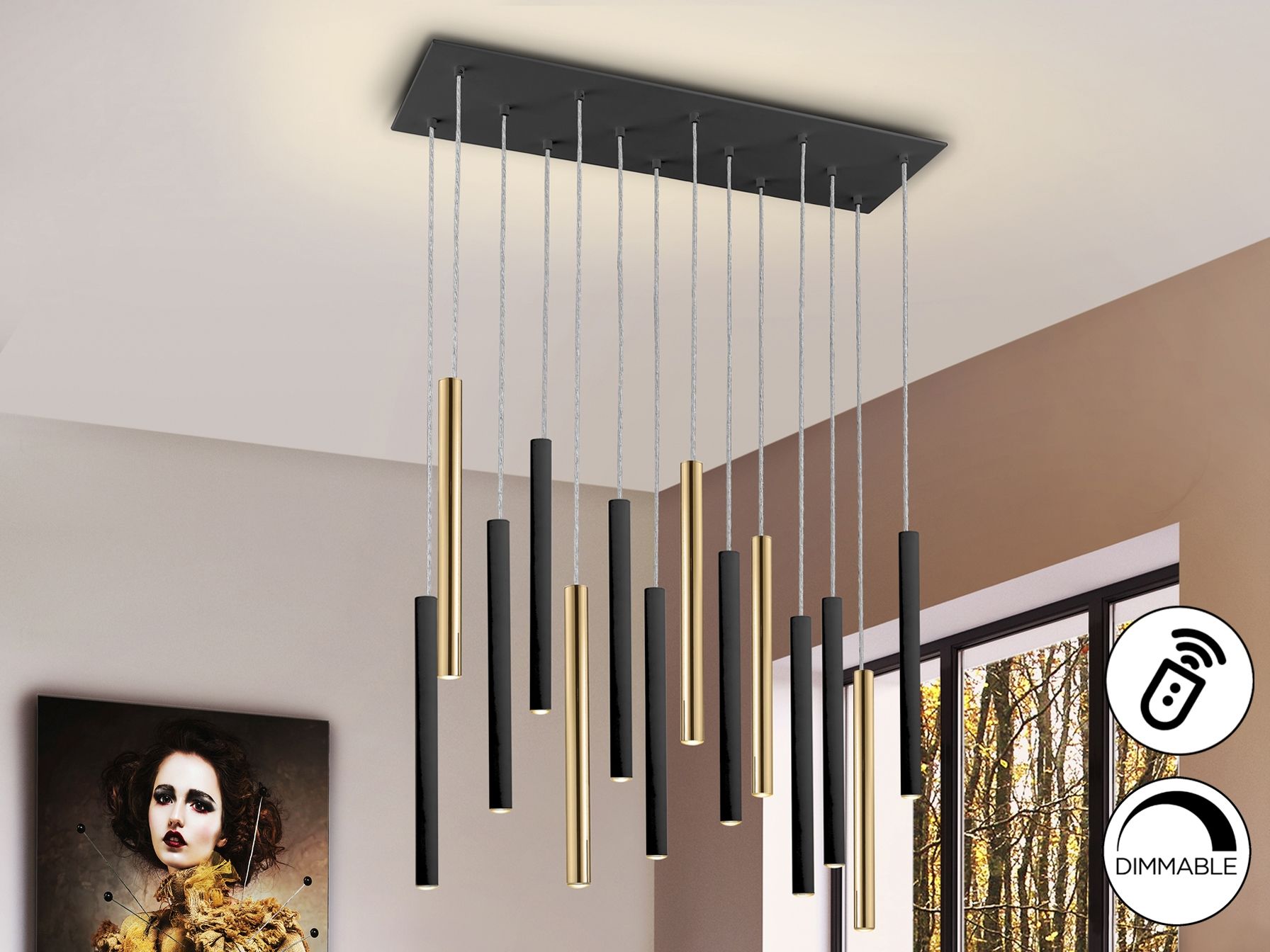 Подвесной светильник LED с 14 лампами из металла с покрытием "блестящее золото" и матовым чёрным покрытием. Акриловый рассеиватель опaлового цвета. 70W LED, 6300 Lm, 3000 K. ДИММИРУЕМЫЙ.