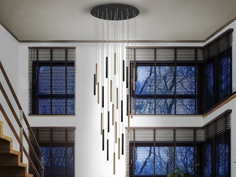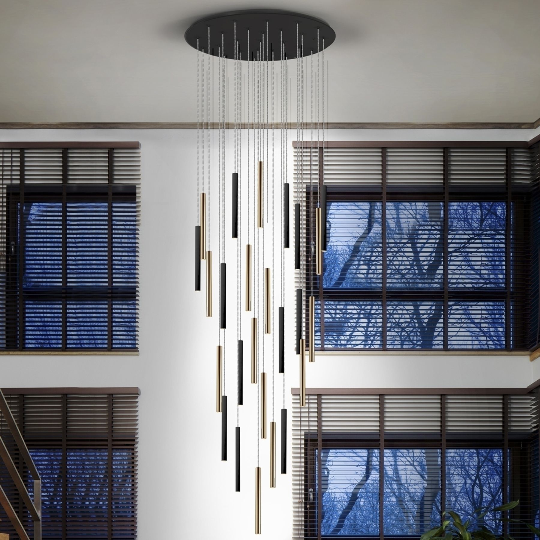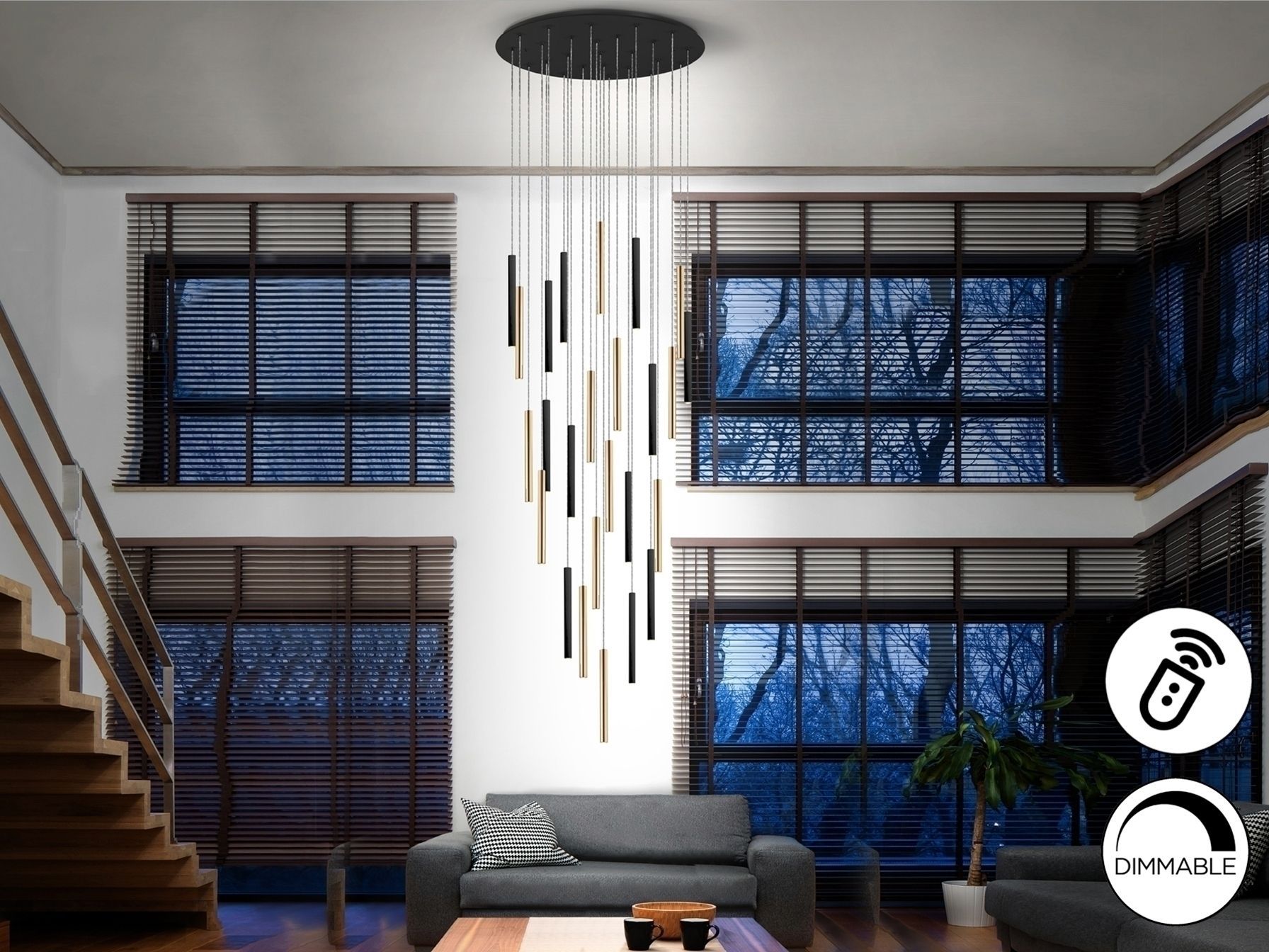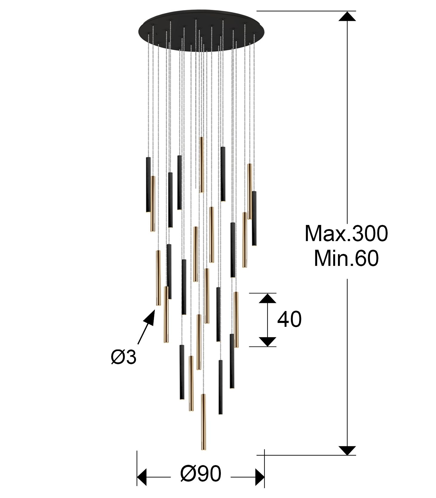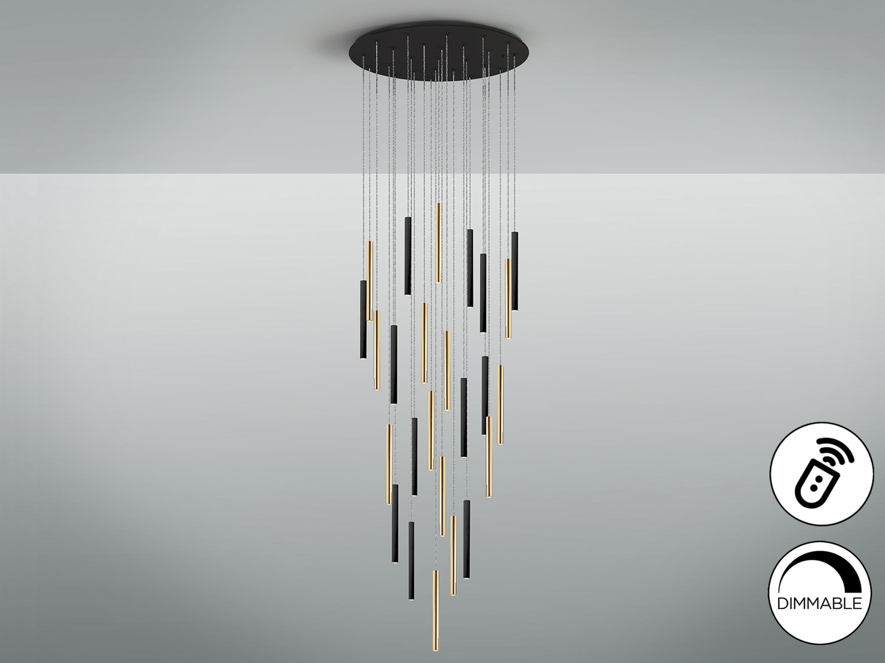 Круглый светодиодный светильник на 25 ламп. Изготовлен из металла, покрыт золотом и черным матовым покрытием. Рассеиватель из опалового акрила. Светодиод 125 Вт, 11250 лм, 3000 К. Максимальная длина 300 см. DIMMABLE. Пульт дистанционного управления в комплекте.
