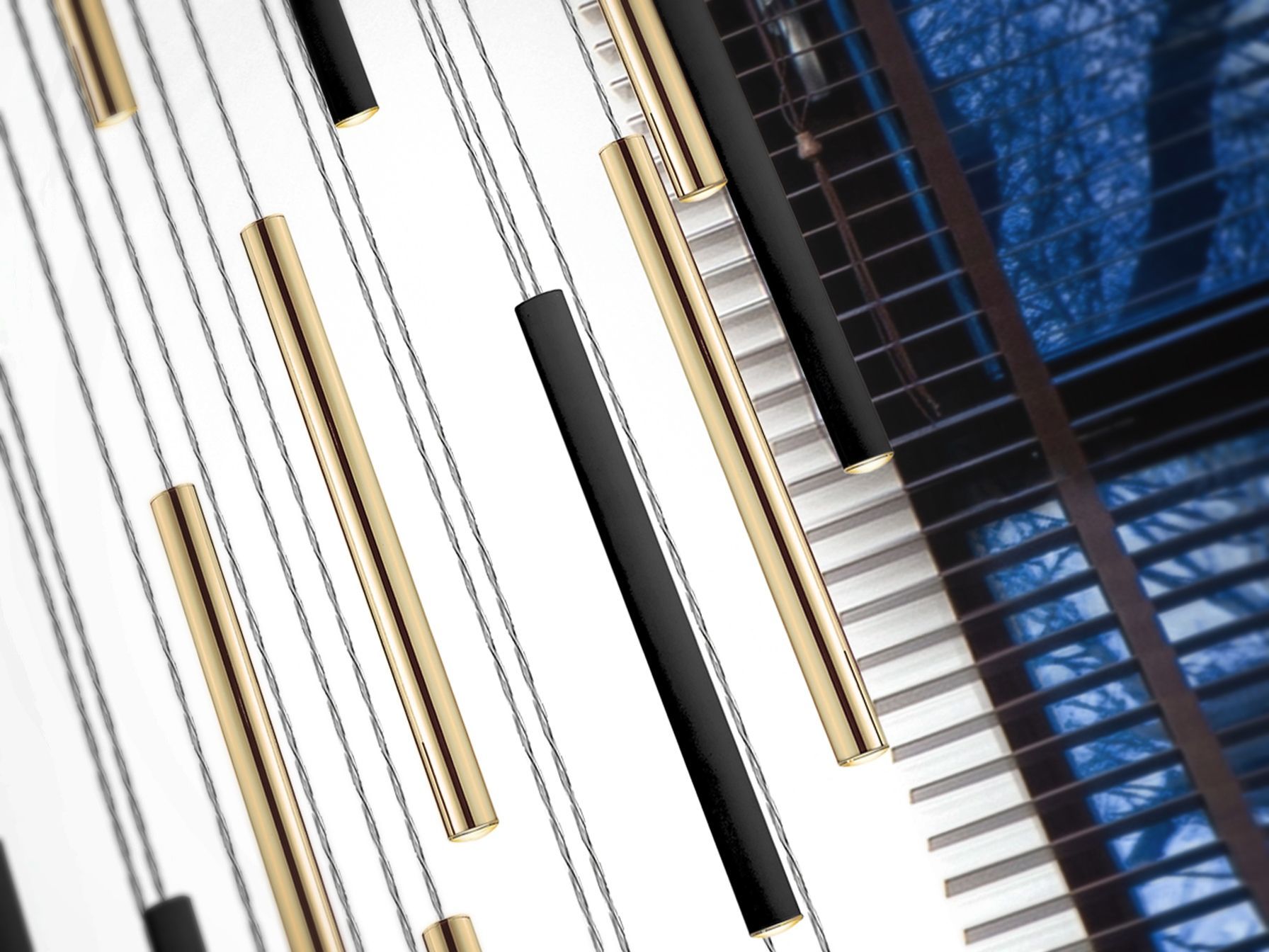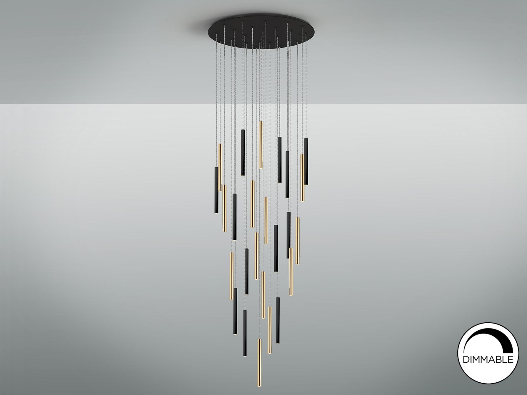 Круглый светодиодный светильник на 25 ламп. Изготовлен из металла, покрыт золотом и черным матовым покрытием. Рассеиватель из опалового акрила. Светодиод 125 Вт, 11250 лм, 3000 К. Максимальная длина 300 см. DIMMABLE.