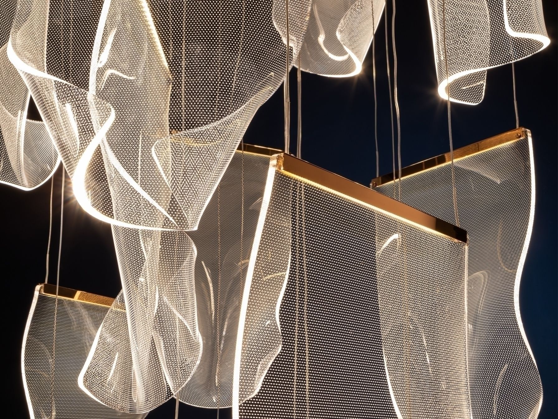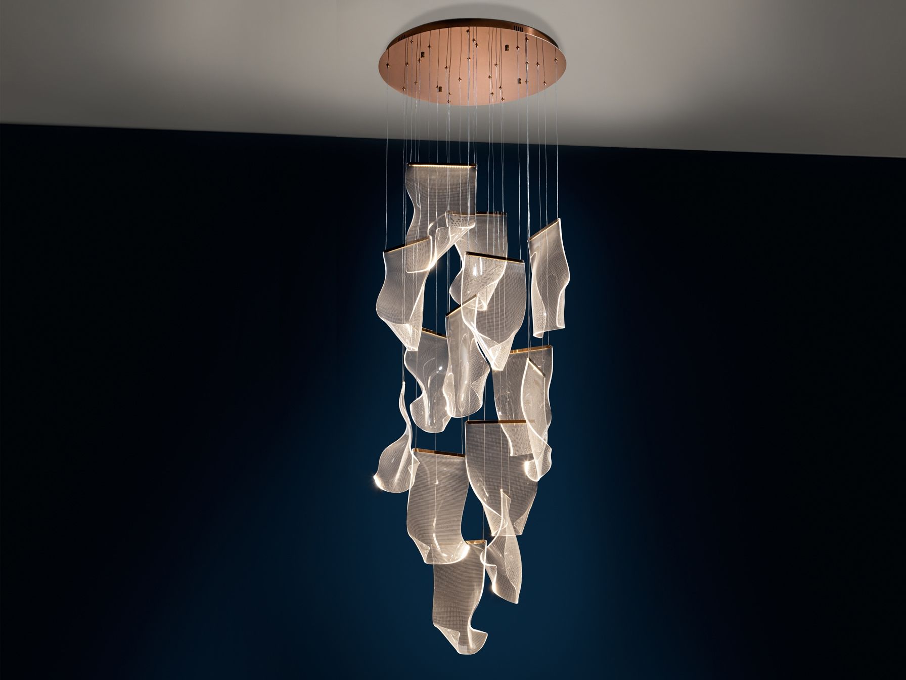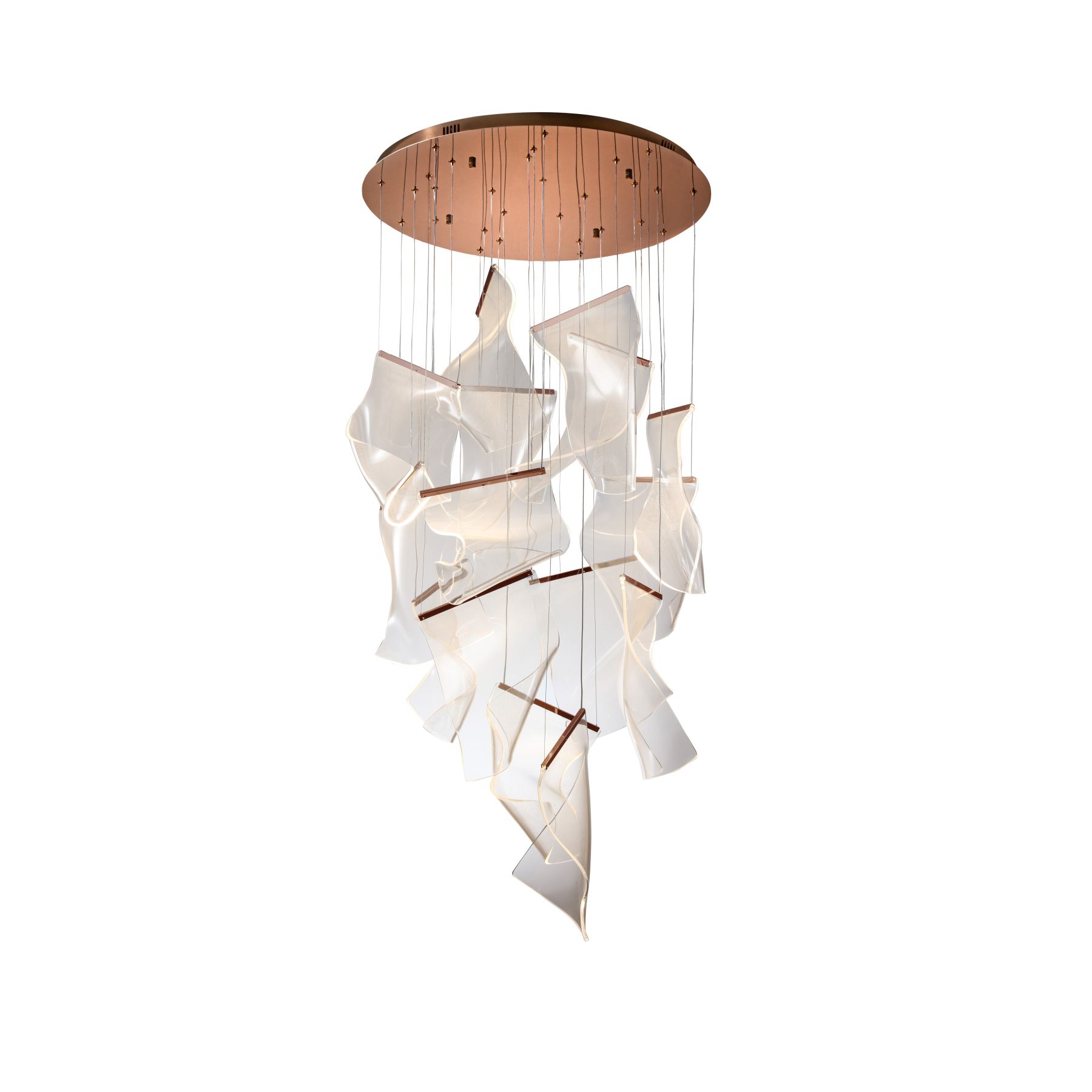 Подвесной светильник из металла цвета "красное золото", плафоны из формованного метакрилата с микропечатью и окантовкой из металла цвета "красное золото". 33,6W LED, 3091 Lm, 3000 K. Регулируемая высота: минимум 80 см, максимум 270 см.